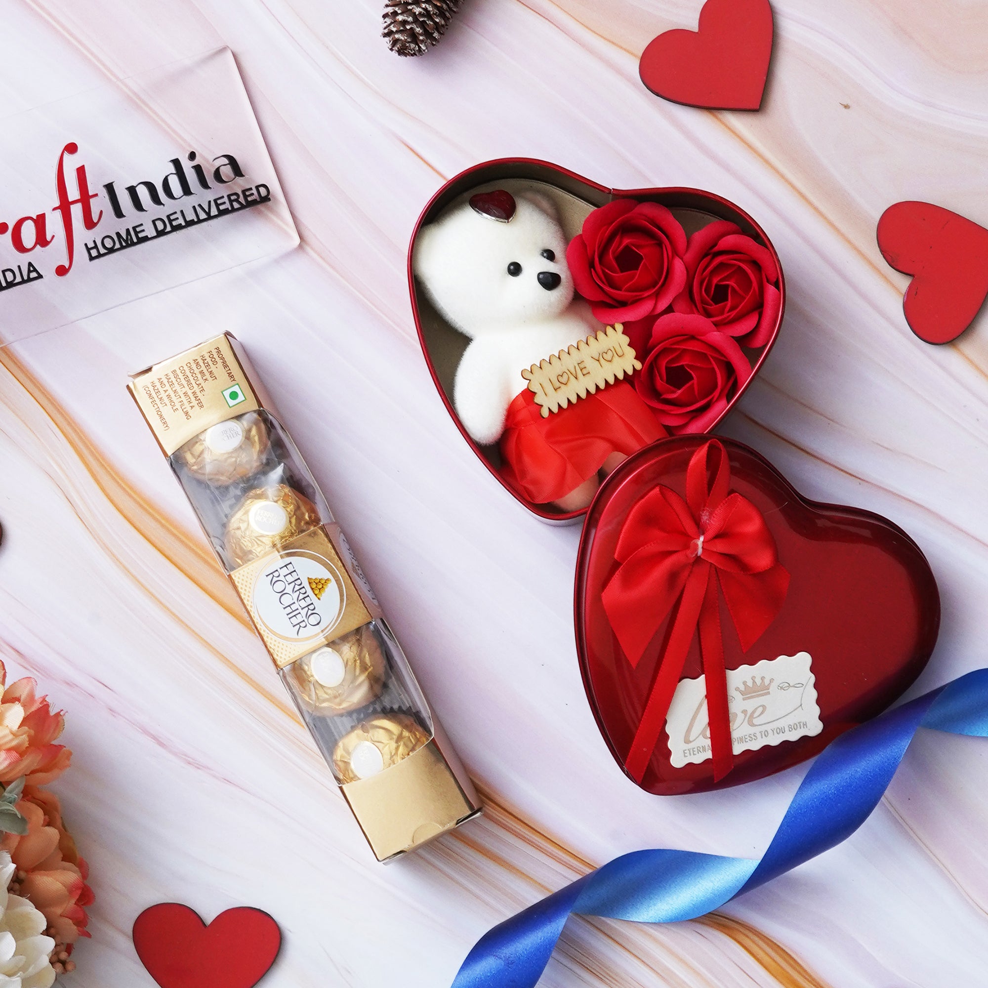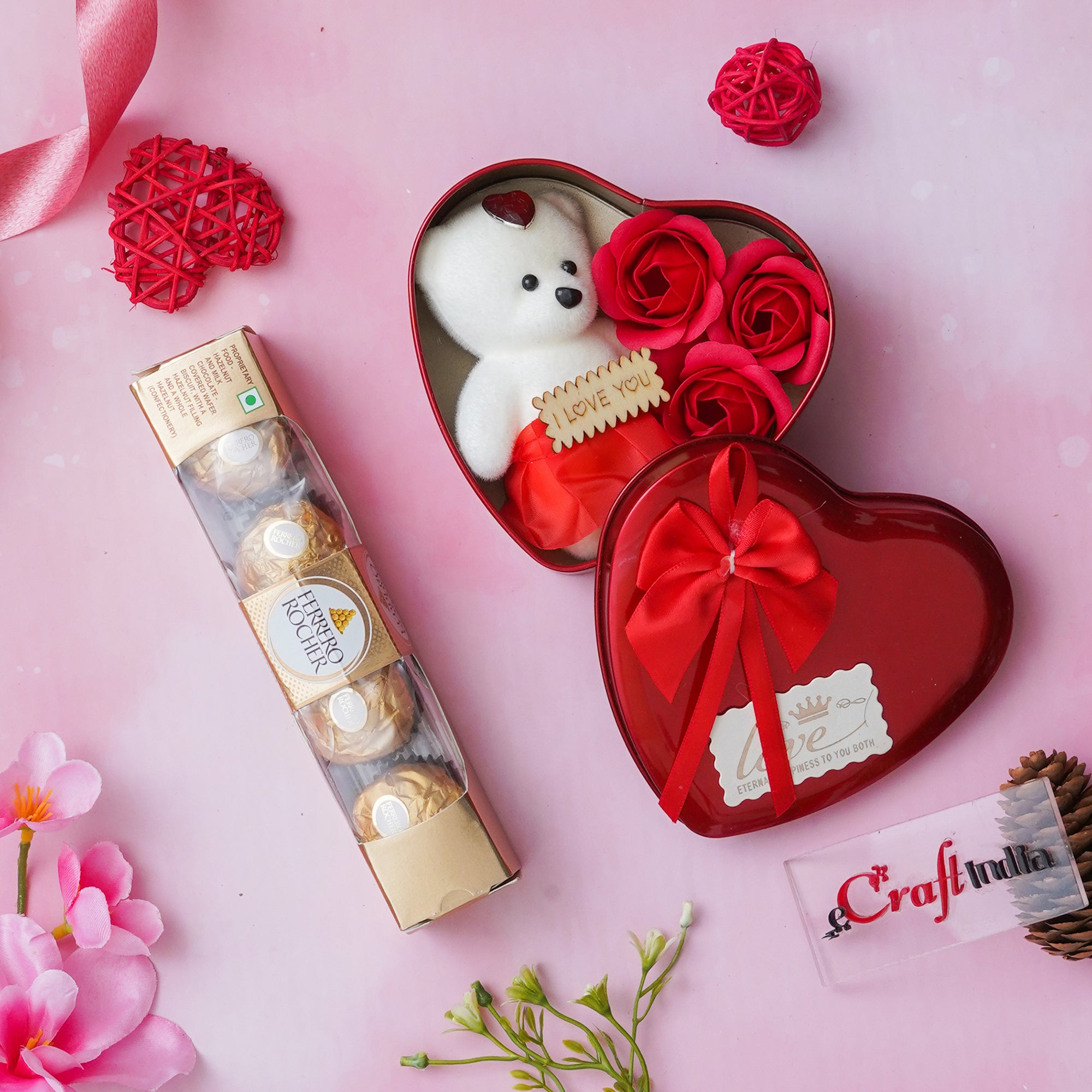 Product Description - Valentine Gift boxes at eCraftIndia consist of several types that will surely make the celebration the most memorable for you both. Ferrero Rocher Chocolates (5 pcs) and assorted synthetic heart shaped gift box something to look forward to, as they are very unique as well as a fun activity too. From cute teddy bear to red roses and gift cards, this gift would stand out for sure! There are several things that you can look for when it comes to this gift box. So what are you waiting for? Go ahead, because our skilled artists have profoundly made this keeping a love like yours in mind.