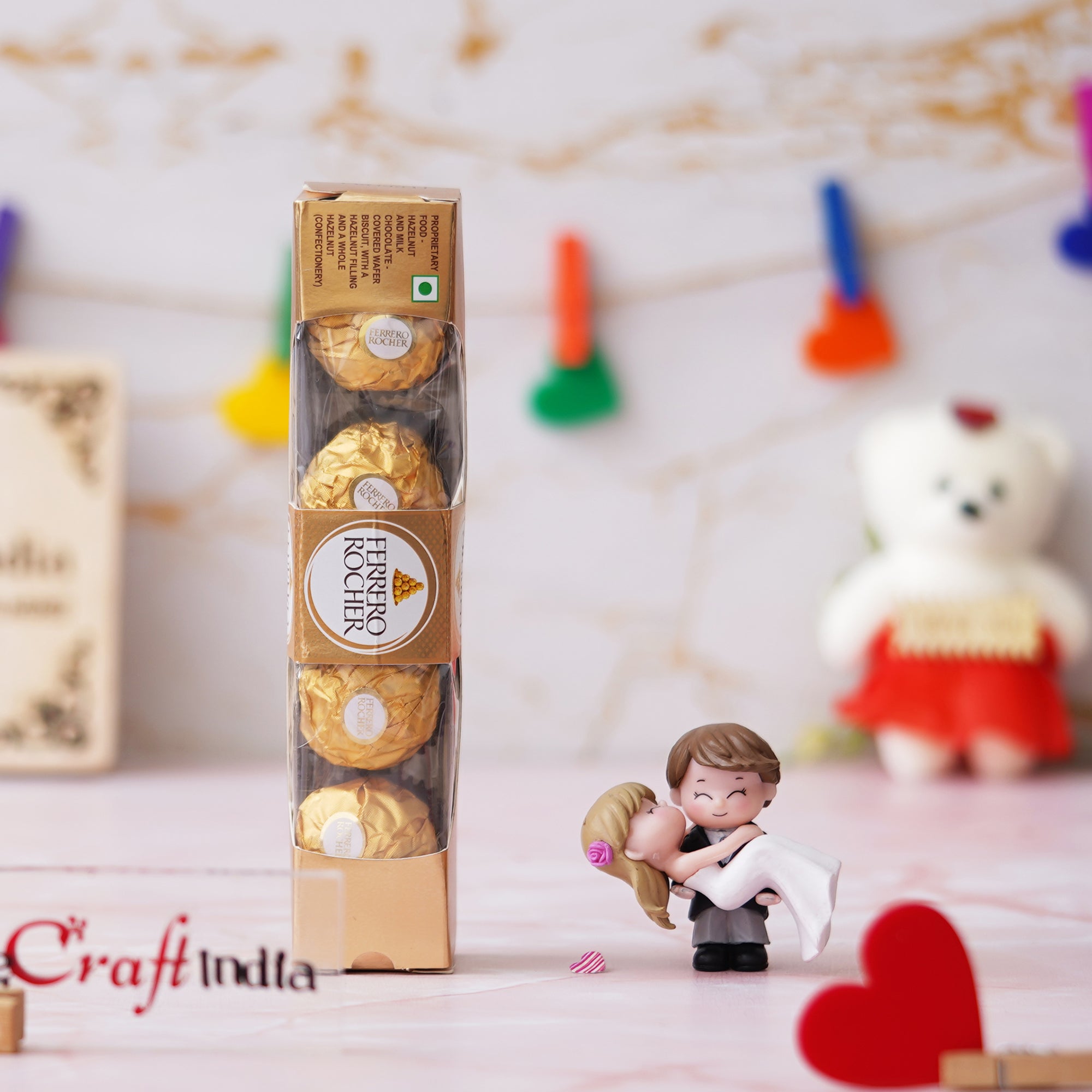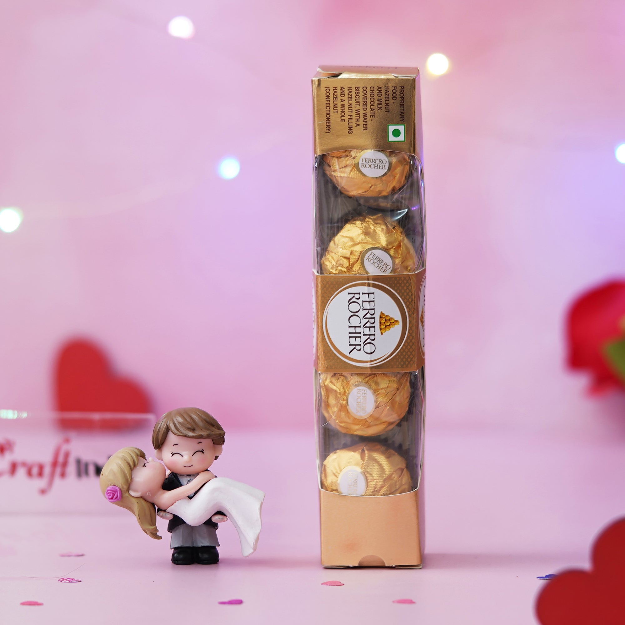 Product Description - Celebrate eternal love with Ferrero Rocher Chocolates (5 pcs) and Bride Kissing Groom Romantic Polyresin Decorative Showpiece by eCraftIndia. This exquisite showpiece captures the essence of romance and togetherness. Meticulously handcrafted from premium quality polyresin, it showcases fine craftsmanship and attention to detail. The showpiece is the perfect gift for weddings, anniversaries, and special occasions. Its elegant design and vibrant colors evoke a sense of joy and warmth. Add a touch of romance to your home decor with this beautiful handcrafted showpiece, symbolizing the bond of love and affection. Embrace the beauty of this unique polyresin showpiece and cherish the precious moments of love and companionship.
