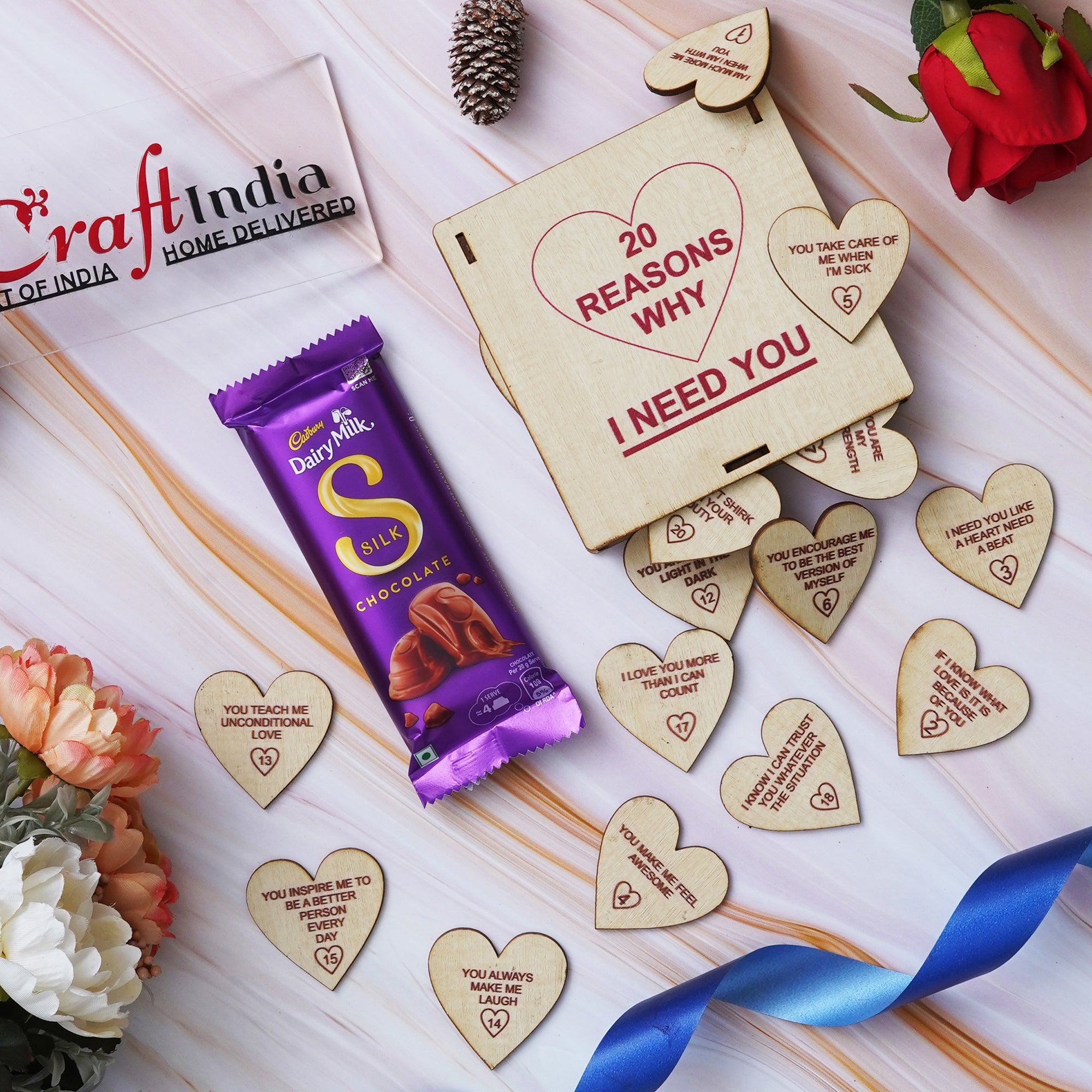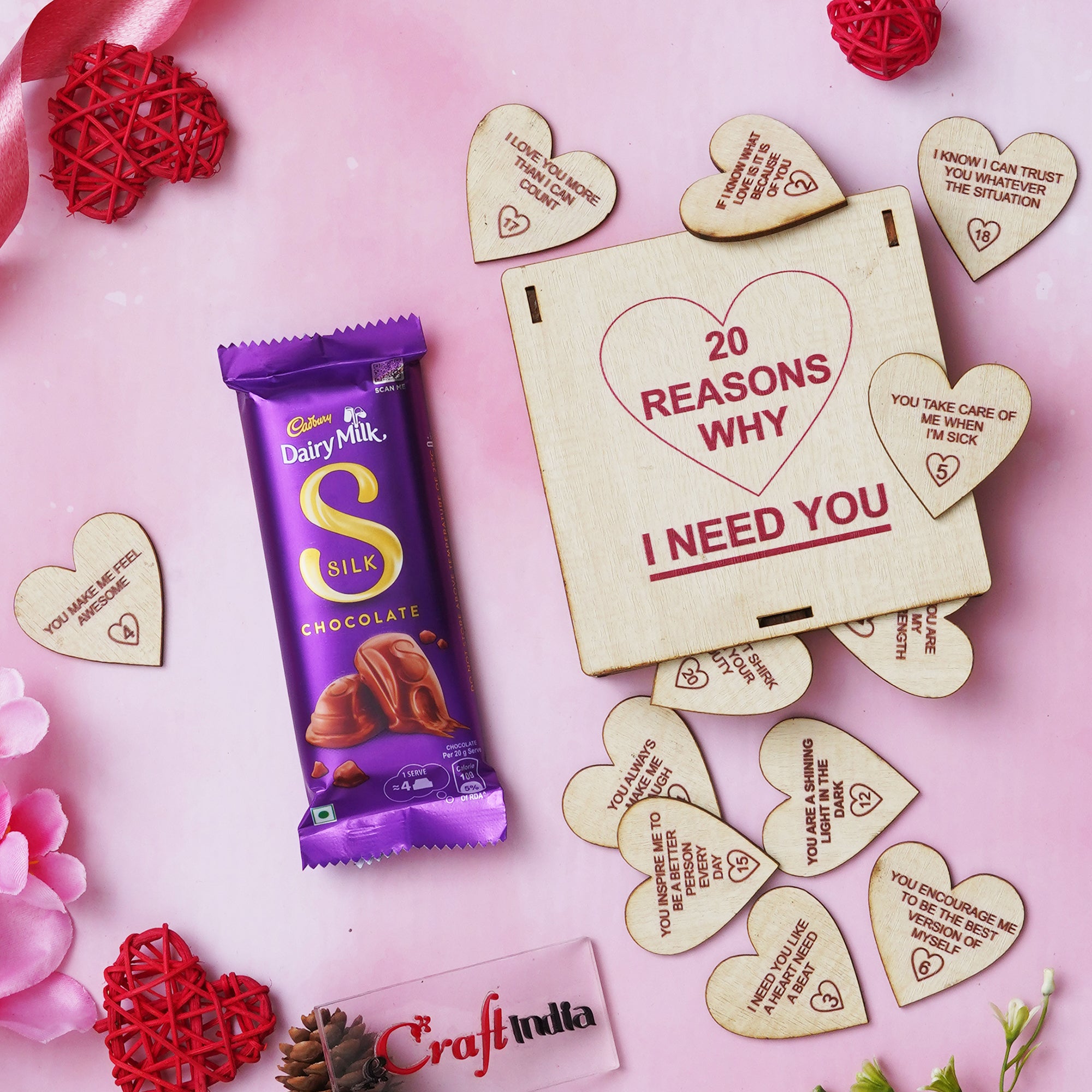 Product Description - Celebrate love and create lasting memories with Cadbury Dairy Milk Silk Chocolate and "20 Reasons Why I Need You" Printed Little Hearts Valentine Brown Wooden Gift Set. This beautifully crafted wooden gift set features 20 little hearts, each printed with a unique reason why you need your loved one in your life. The rich brown color and intricate detailing add a touch of warmth and romance to any decor. Perfect for gifting on special occasions like Valentine's Day, anniversaries, or birthdays, this gift set allows you to express your deepest emotions thoughtfully and creatively. Place it on a tabletop, shelf, or bedside table as a reminder of your love and appreciation. This decorative item is a symbol of love and makes a heartfelt gift for your partner, family, or friends.