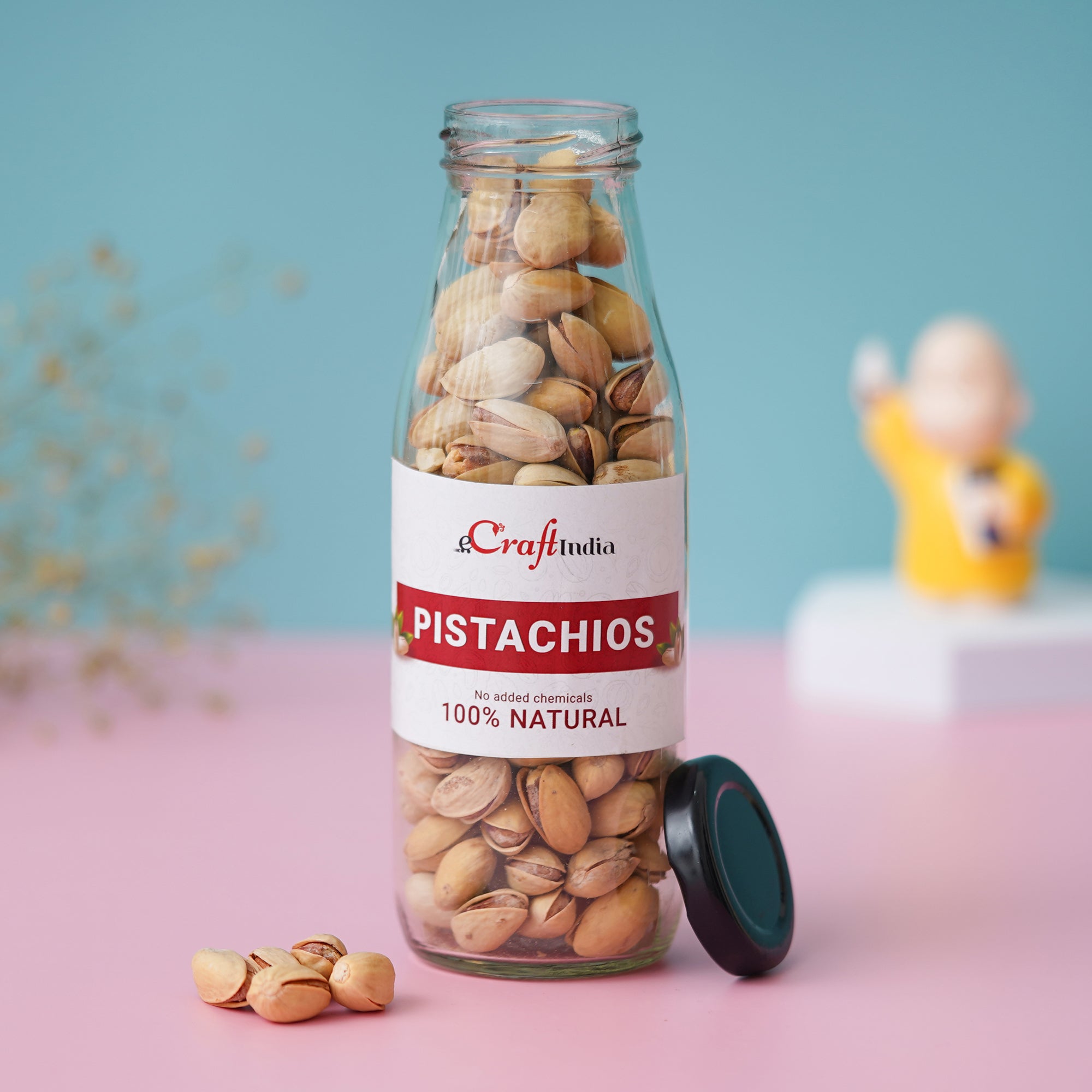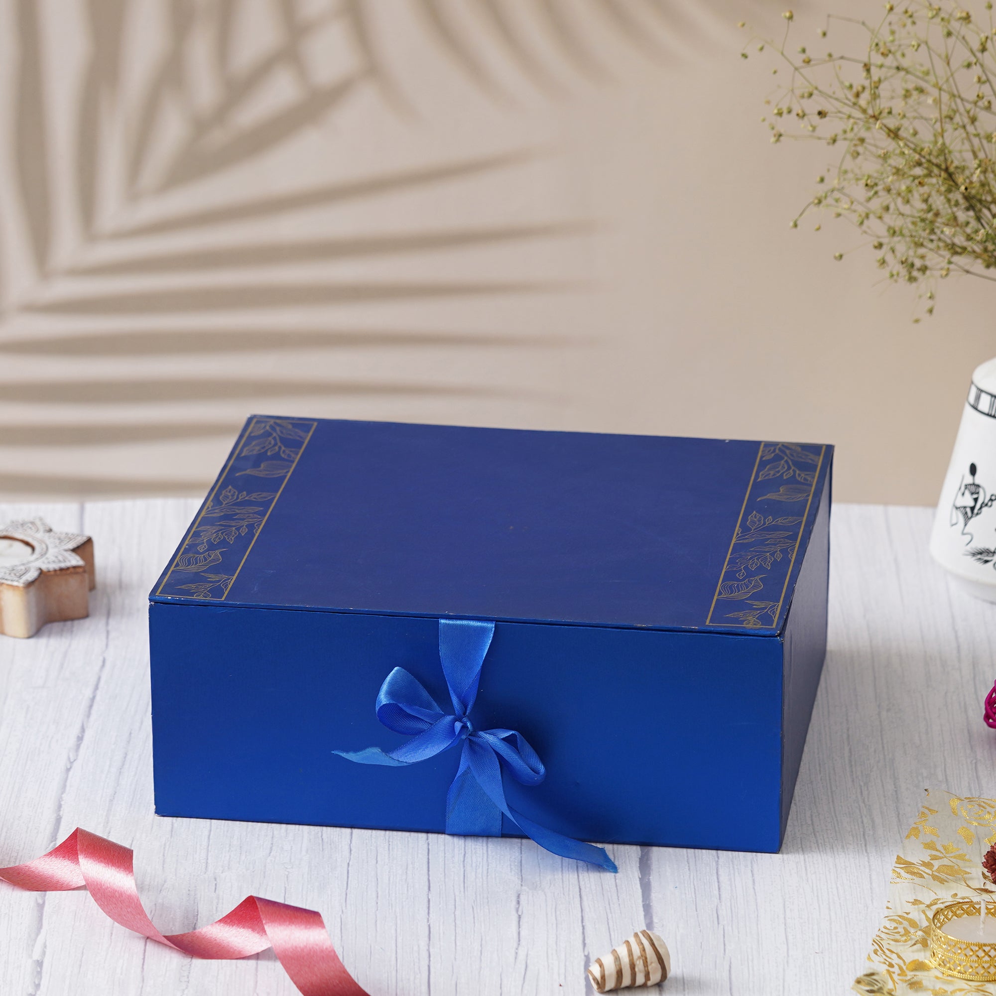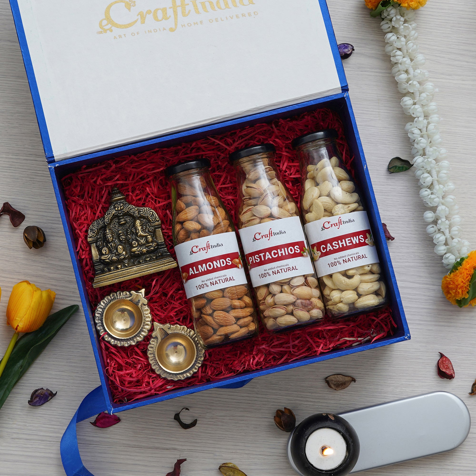 The Gift It Up Hamper from eCraftIndia is the perfect choice for those looking for a unique and thoughtful gift. Gift the best hamper to your best people for various celebrations! This hamper includes three bottles of dry fruits, each weighing 150 gms. The bottles contain a delightful assortment of Almonds, Pistachios, and Cashews, all of which are sourced from the finest farms and handpicked for quality. In addition to the dry fruits, this hamper also includes a beautiful Lakshmi Ganesha Statue that symbolizes prosperity and good fortune. Additionally, the hamper includes 2 Brass Diyas that can be used for lighting during auspicious occasions or to add a touch of warmth and light to your home. All these gift items come beautifully crafted in a gift hamper that is perfect for gifting to your loved ones. You can further order this gift box hamper in bulk as well for wedding return gifts or corporate gifts on festivals.