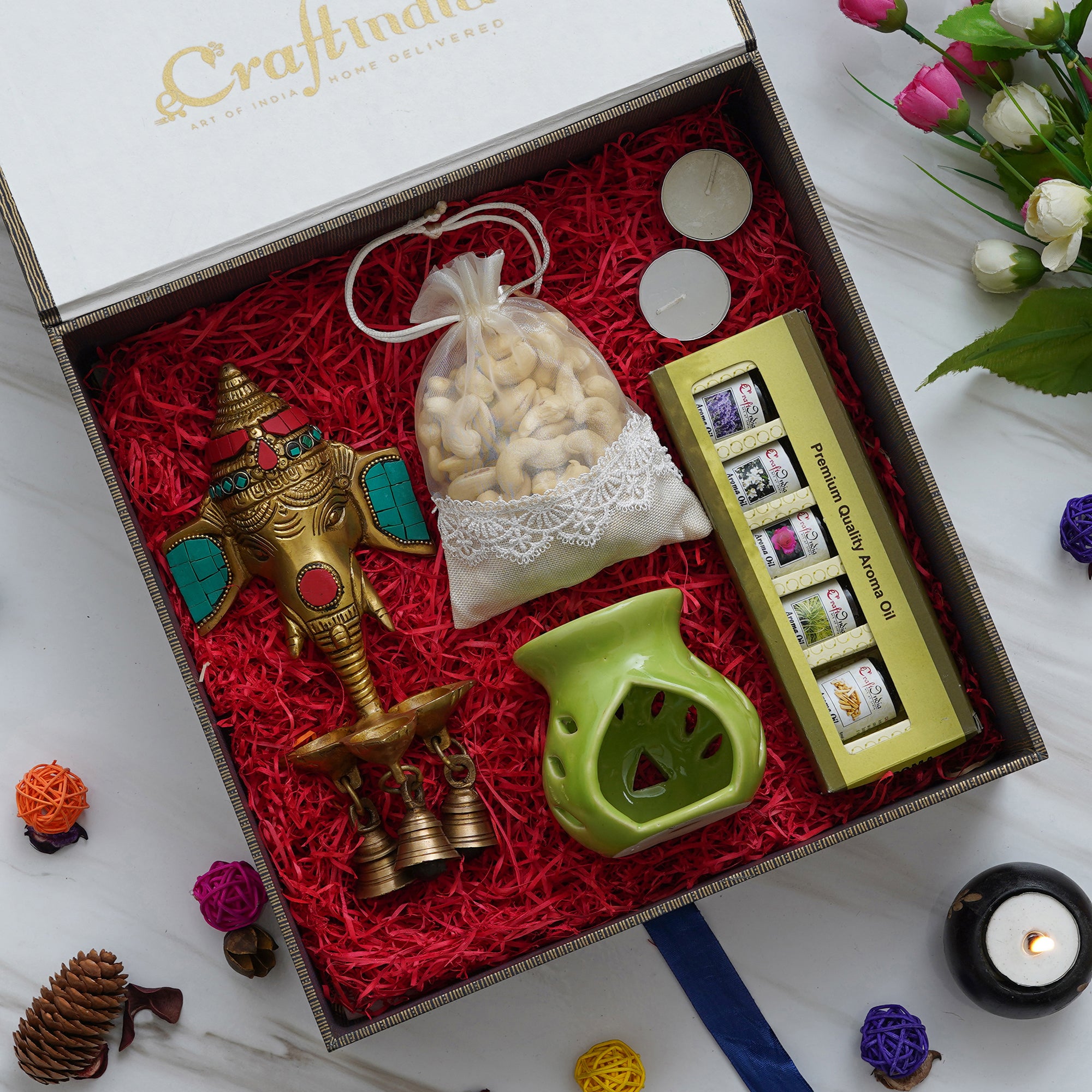 A hamper full of life all incorporated into one is our - The Gift Of Life Hamper which is the perfect present for anyone further you can order in bulk too for marriage gifts, etc. This gift hamper features a Colorful Stone Work Handcrafted Golden Lord Ganesha Wall Hanging brass diya with 3 bells and 3 wicks, which is sure to add a touch of spirituality. The creates a soothing sound when lit. The Gift Of Life Hamper also includes a potli of cashews(200gms) that is sure to satisfy any sweet tooth. But the hamper is not just about indulgence; it also includes an aroma diffuser and a set of 5 Aroma Oils in 5 Fragrances - Rose, Jasmine, Lavender, Lemon grass, and Sandalwood fragrances and 2 Tea Light Candles. The Gift Of Life Hamper is perfect for anyone who appreciates the finer things in life, and who loves to surround themselves with beautiful objects.