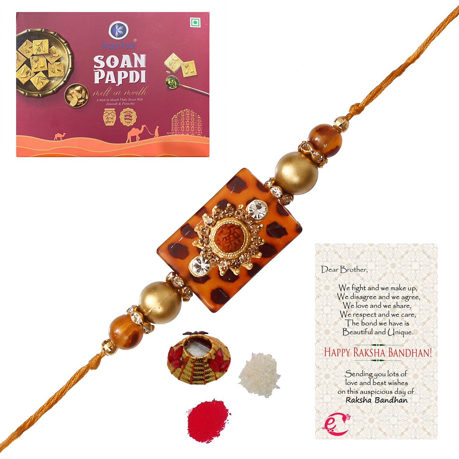 Stone Rudraksh Rakhi with Soan Papdi (500 Gm) and Roli Tikka Matki, Best Wishes Greeting Card - eCraftIndia Online