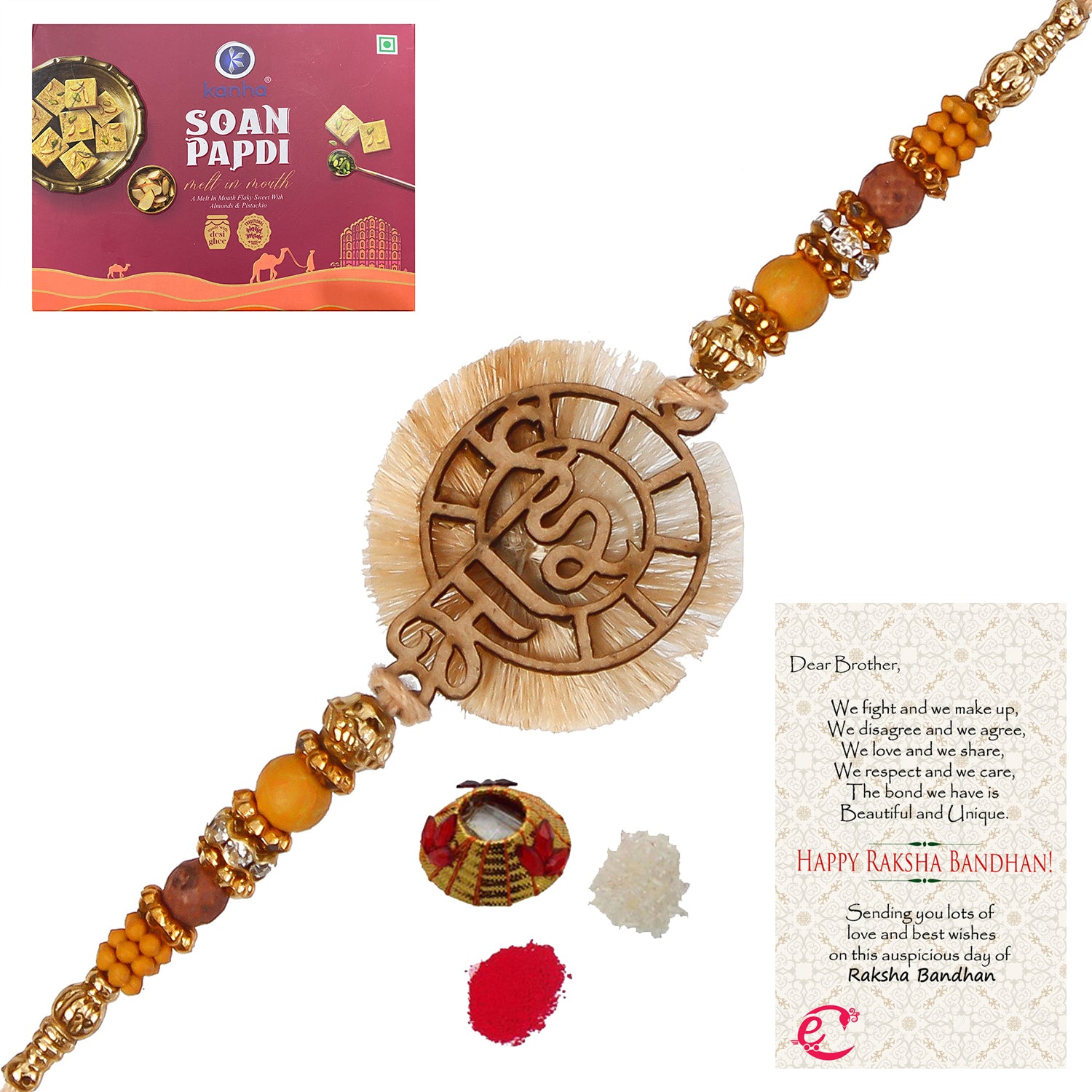 Designer Wooden Bhai Rakhi with Soan Papdi (500 Gm) and Roli Tikka Matki, Best Wishes Greeting Card - eCraftIndia Online