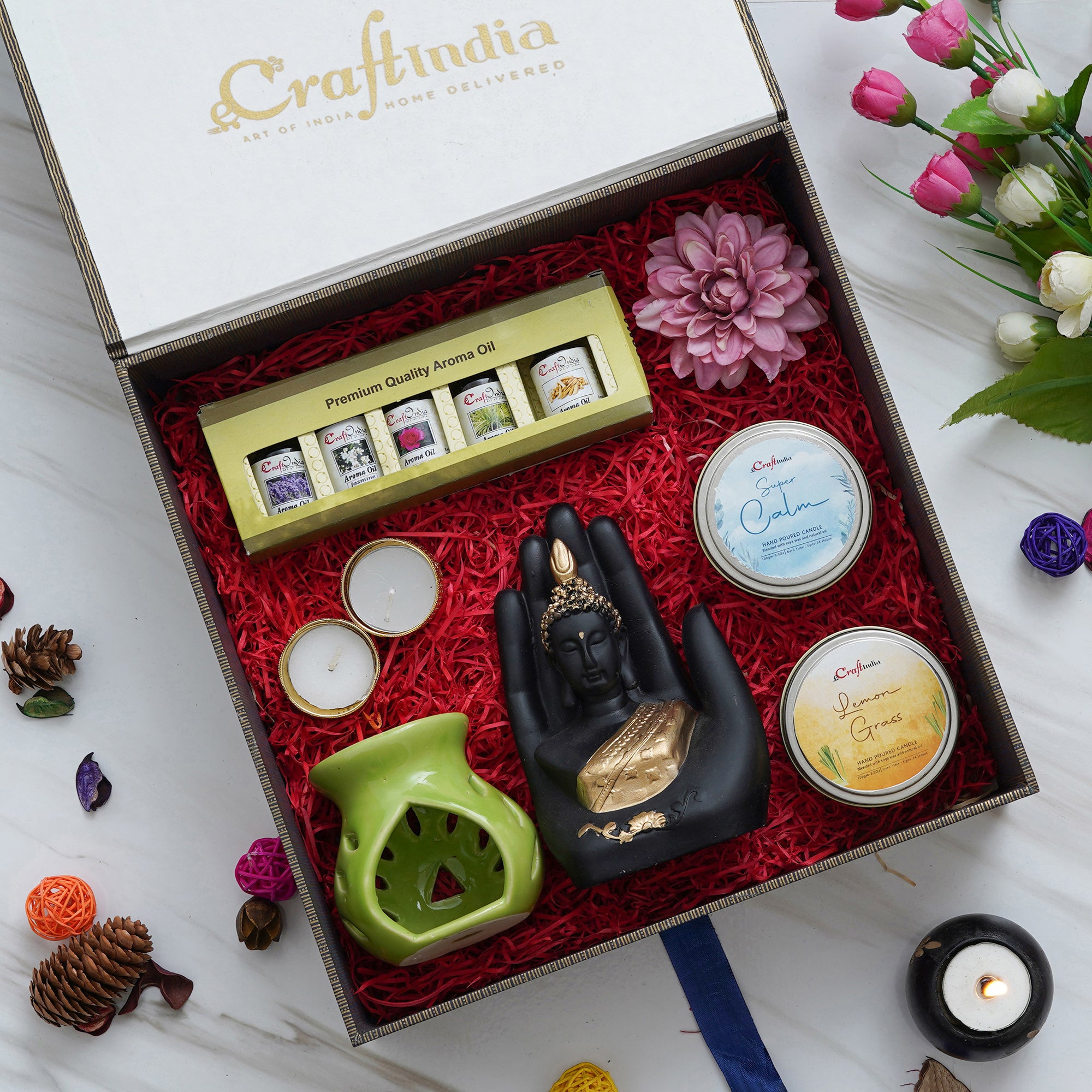 When it comes to someone who meditates, we all wish to gift them something thoughtful, don't we? Hence, this gift box consists of all thoughtful items. The Thoughtful Gift Box is the perfect way to show someone you care about their well-being and mindfulness. The gift hamper includes a handcrafted Black and Golden Palm Buddha Statue, which represents wisdom, peace, and mindfulness. The aroma diffuser, 2 tea light candle holders, and the set of 5 Aroma oils in 5 Fragrances - Rose, Jasmine, Lavender, Lemon grass, and Sandalwood fragrances. Additionally, the gift box includes a Super Calm Hand-Poured Soya Wax Candle, which is designed to promote relaxation. The Lemon Grass Hand Poured Soya Wax Candle is perfect for refreshing the mind. It's perfect for wedding return gifts, birthday gifts, or anyone who values peace, wisdom, and a healthy lifestyle. You can buy this hamper in bulk if needed.