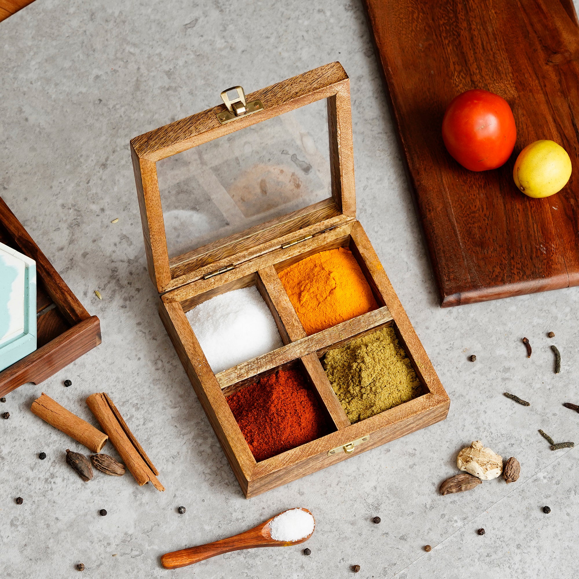 Package Content - One 4 Square Compartments Handcrafted Wooden Spice Box
