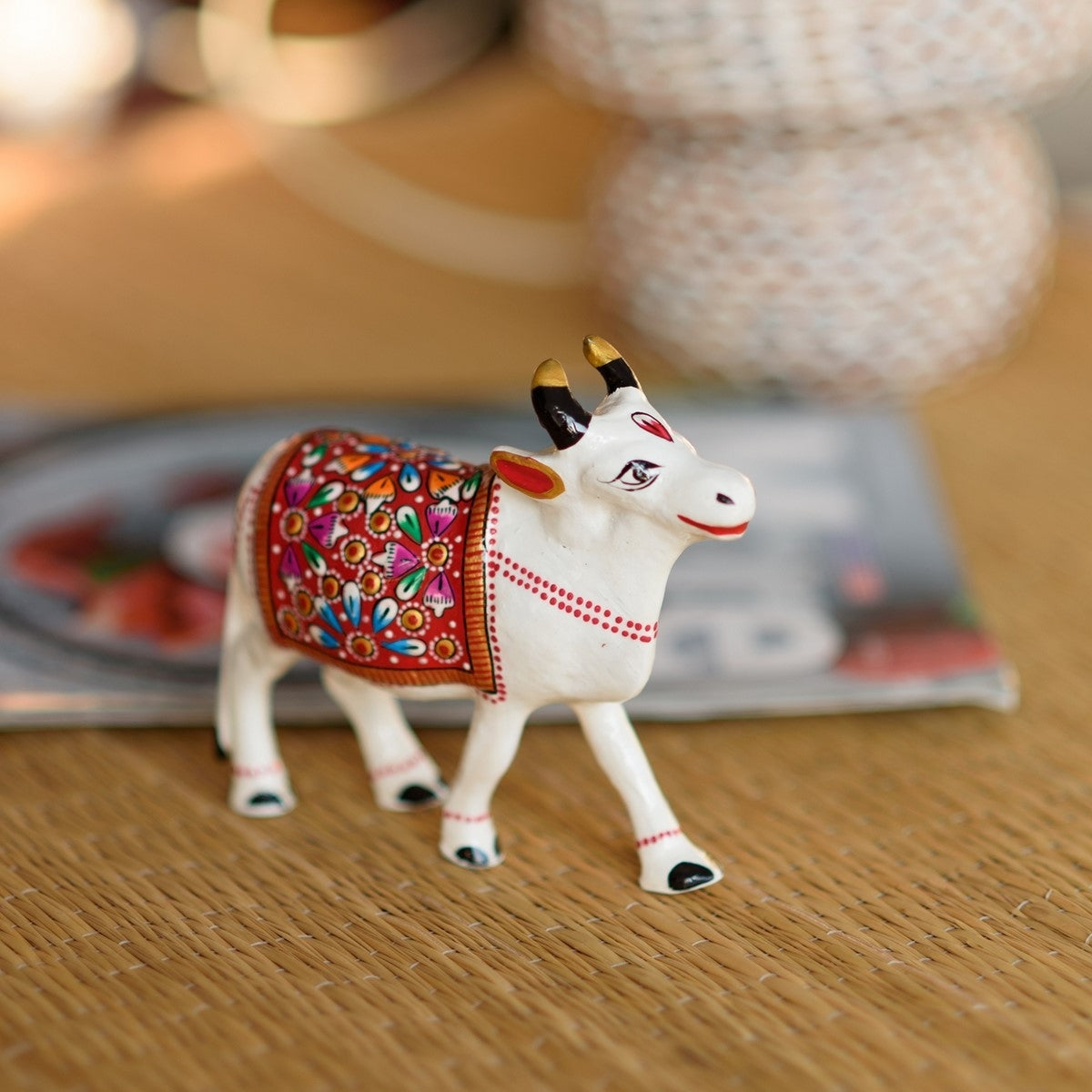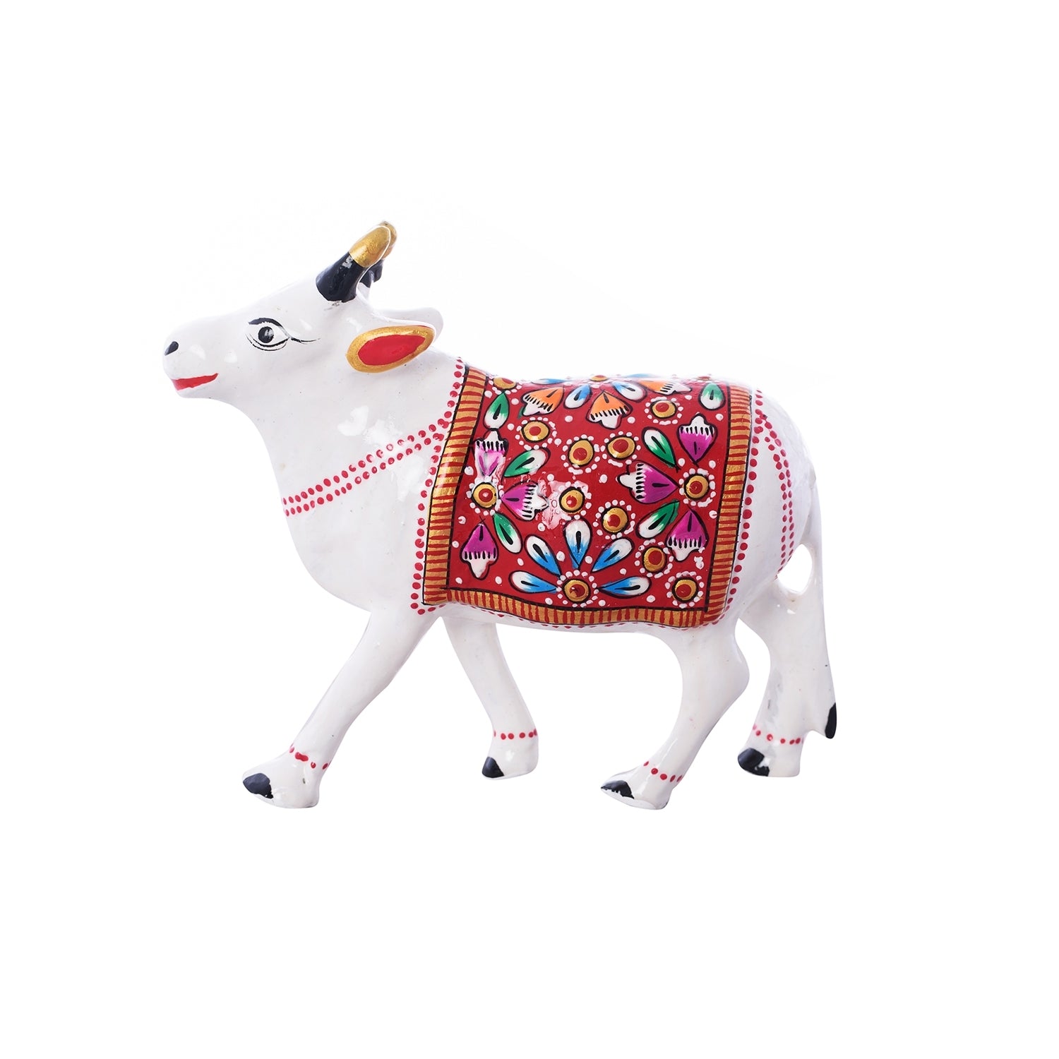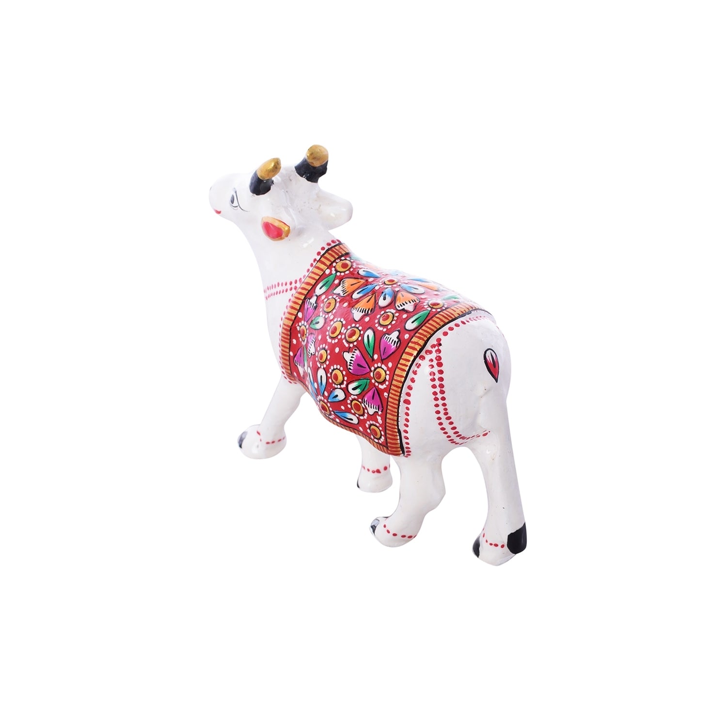 Product Description - Beautiful creation of kamdhenu cow is a perfect symbol of the undying aura of the holy saint that encompasses numerous devotees round the globe. This statue aptly conveys the emotions of people who consider cow (gomatha) as a motherly figure. Kamdhenu cow statues are widely used for decoration purposes in homes and offices. It serves as a great gift, especially around religious celebrations and festivities. This meenakari metal artifact has been made by skilled artisans from the house of eCraftIndia using various traditional techniques.