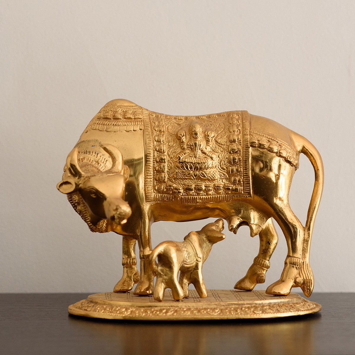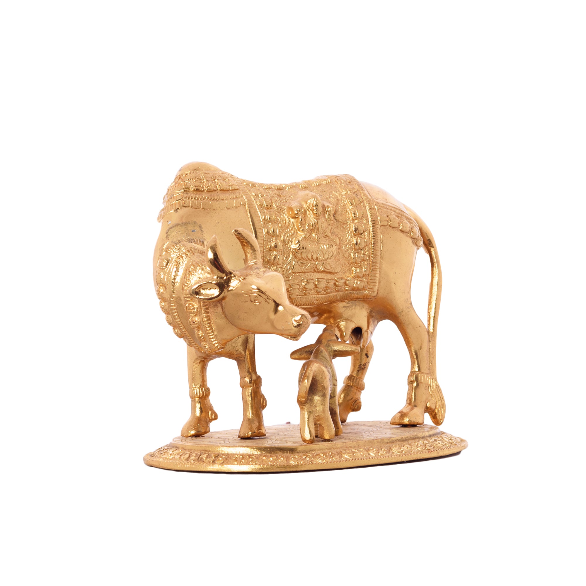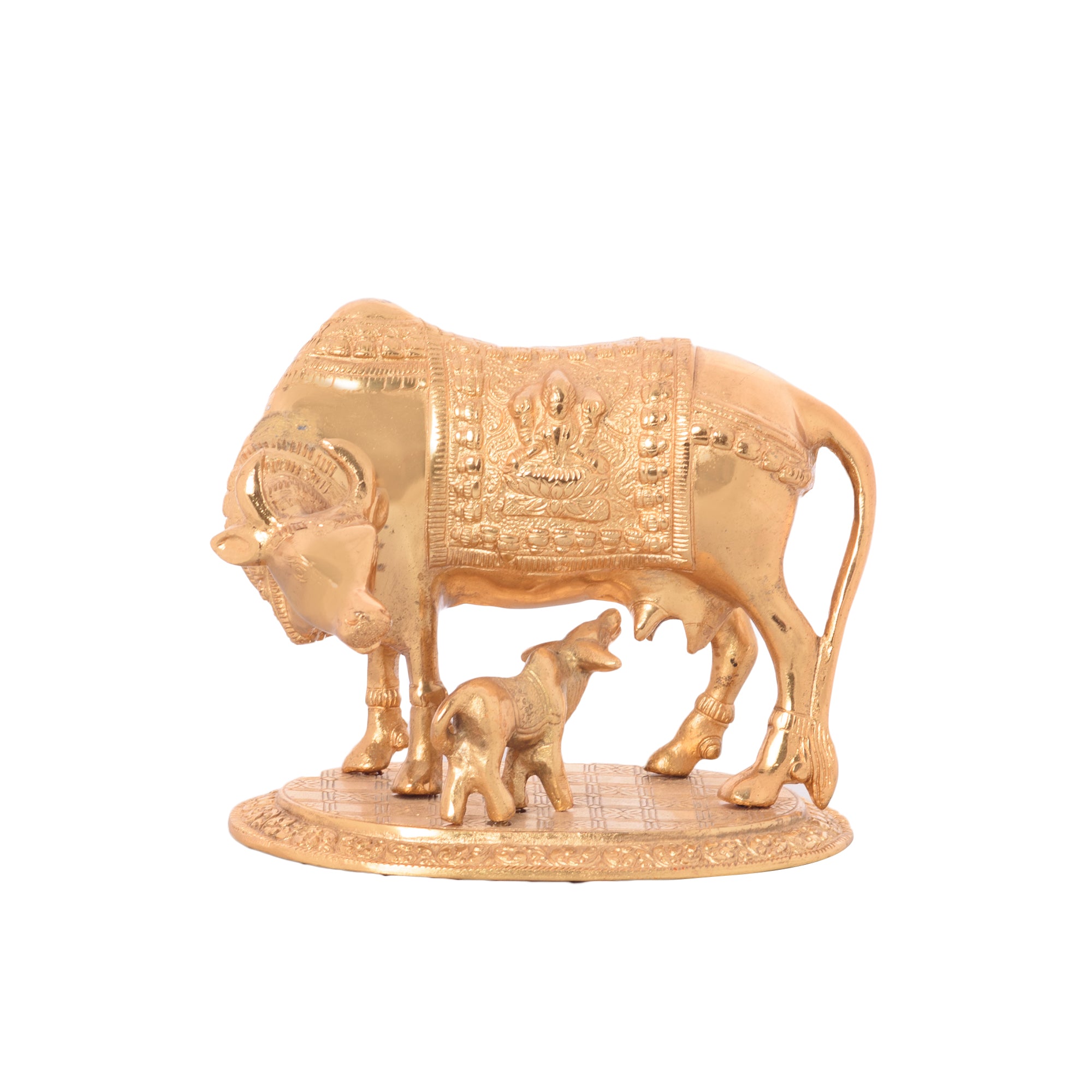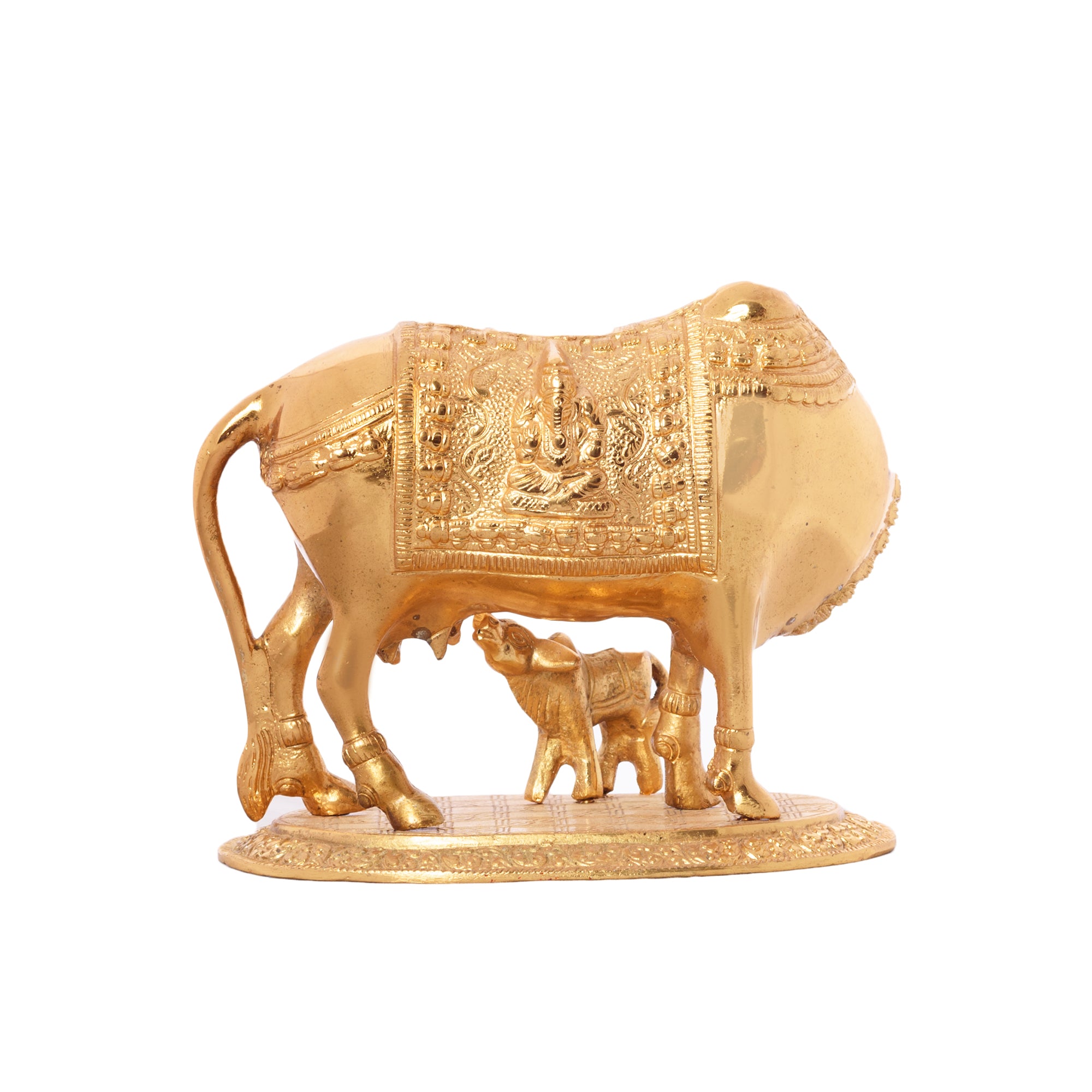 Product Description - The unique creation of the metal golden Kamdhenu cow & calf is an amazing symbol of holiness that has been followed for years now. This figurine showcases the motherly figure of the cow that communicates the sentiments of people with Gaumata. These figurines are the most loved home decoration items that people adore to decorate their home with and also their puja ghar. This can also be a great gift option when you visit your relative's place for a religious function or even for a housewarming These creations are made by experienced artisans at the home of eCraftIndia using several antique methods.