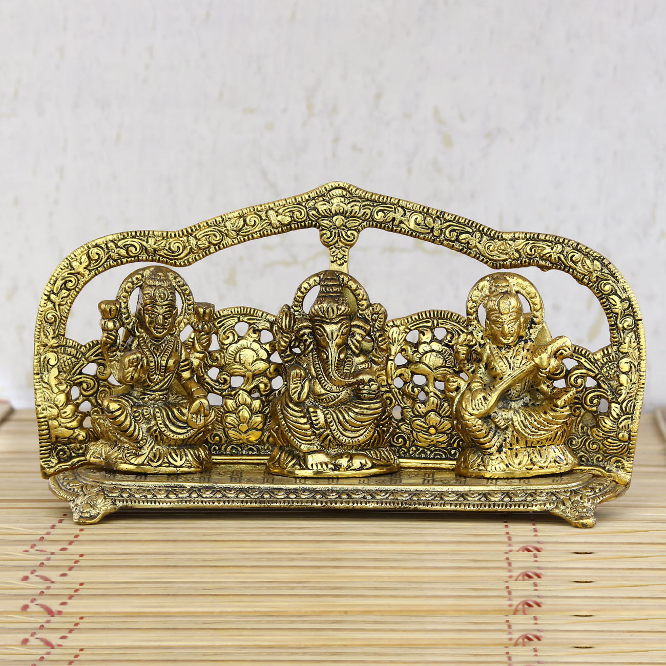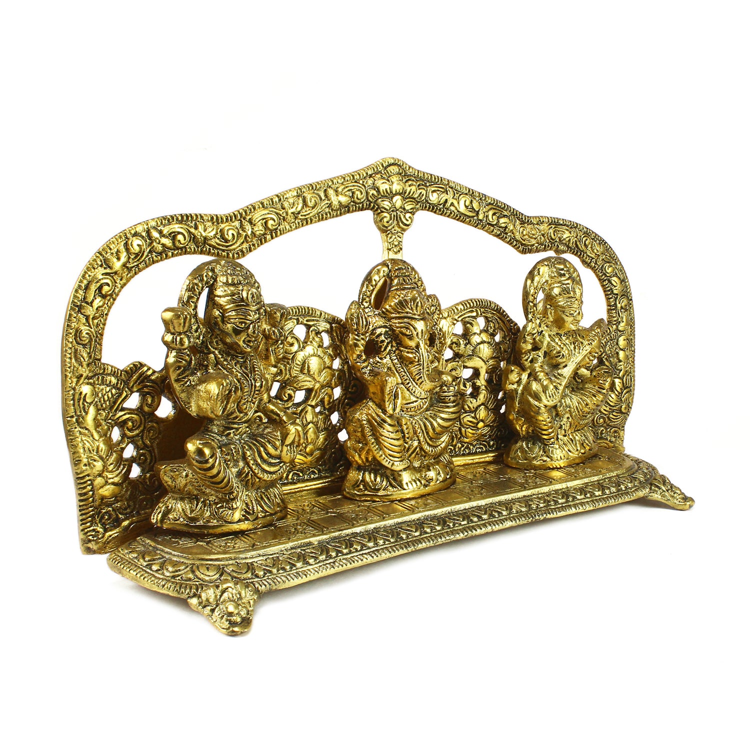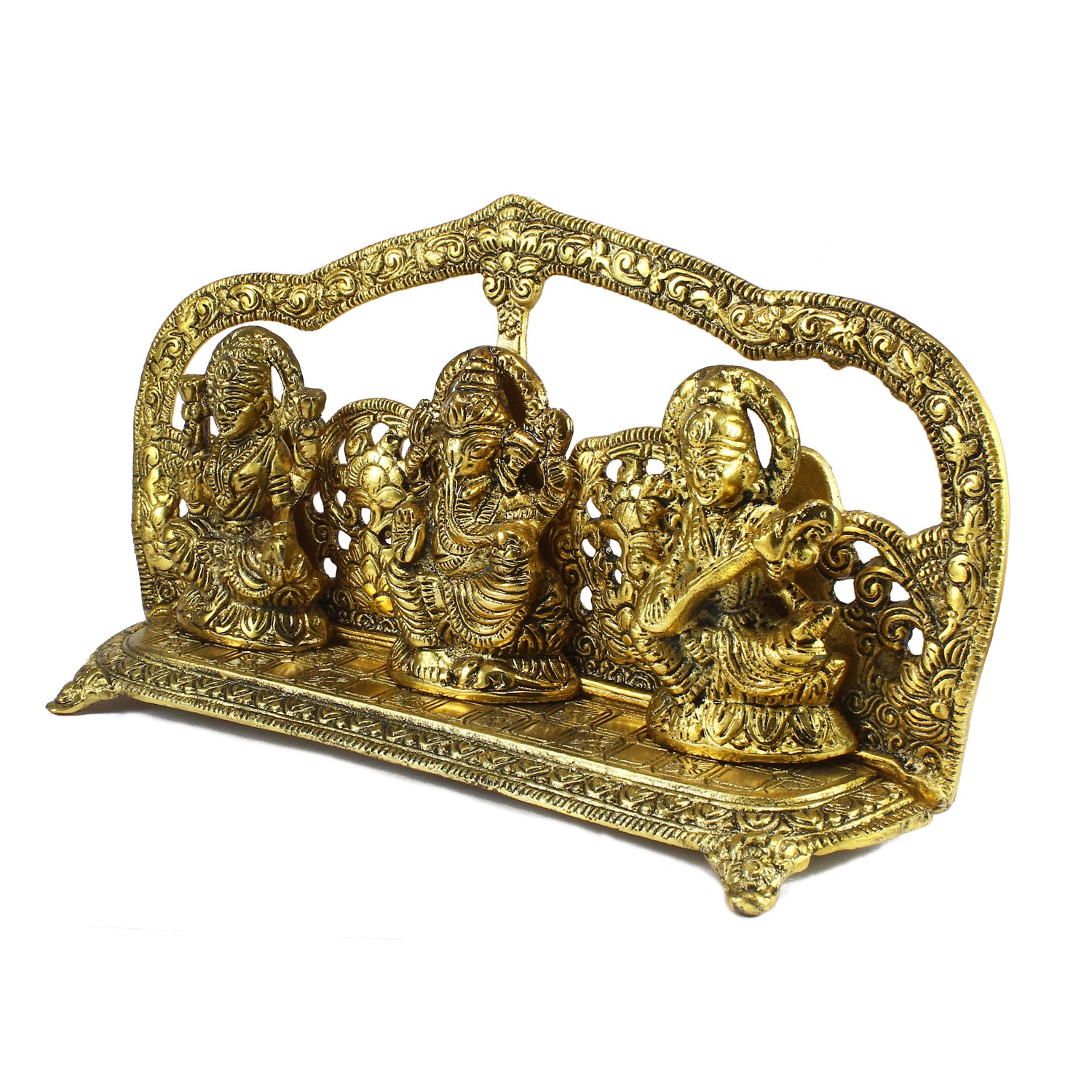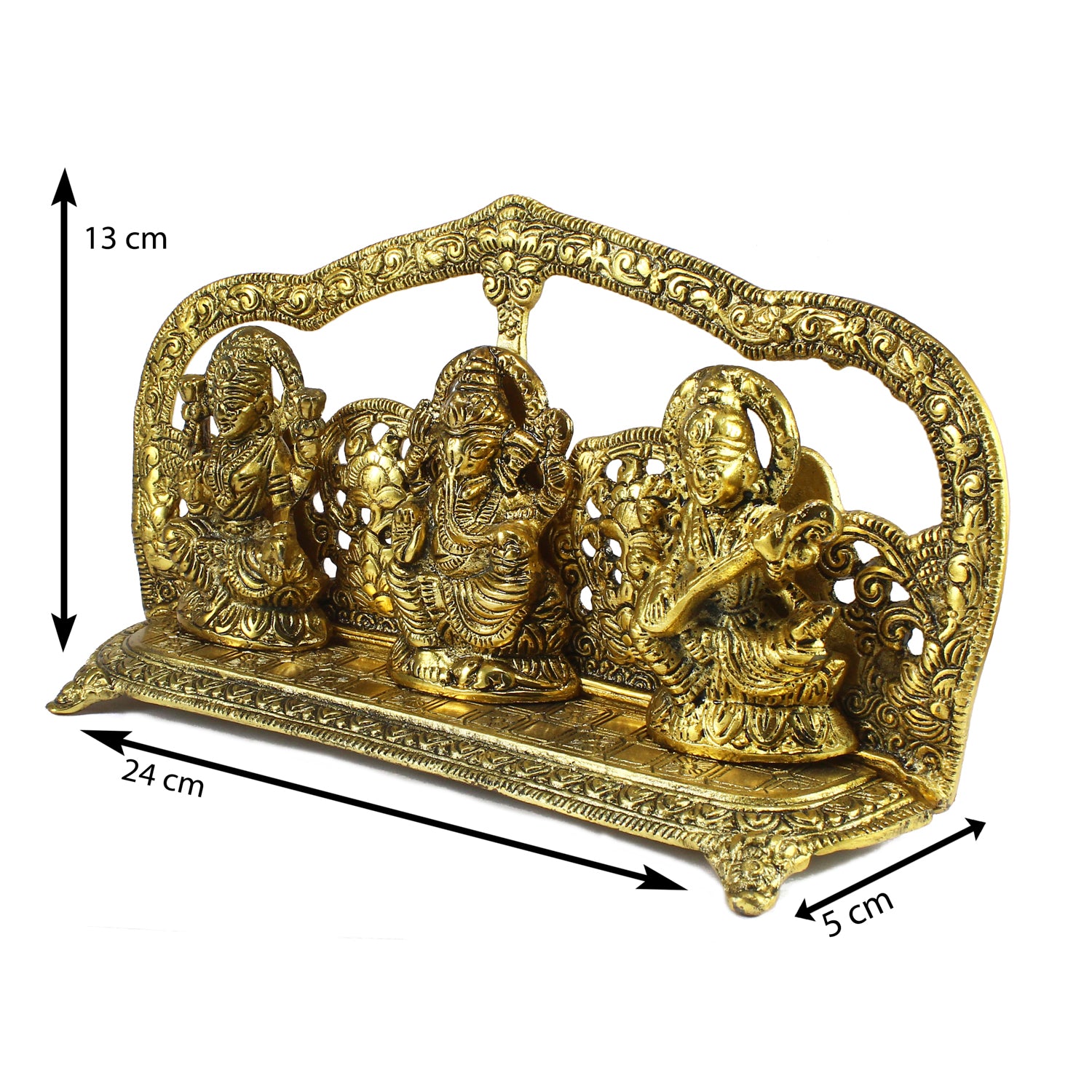 Product Description - A divine statue of Laxmi Ganesh and Saraswati that looks classy and antique. This beautiful golden metal showpiece will surely increase the aura of your home temple. Adding more to it is the fact that its not merely for religious purpose as it can be used as a home item and can be given as a gift to the ones you love. This handicraft has been made by skilled artisans from the house of eCraftIndia using various traditional techniques.