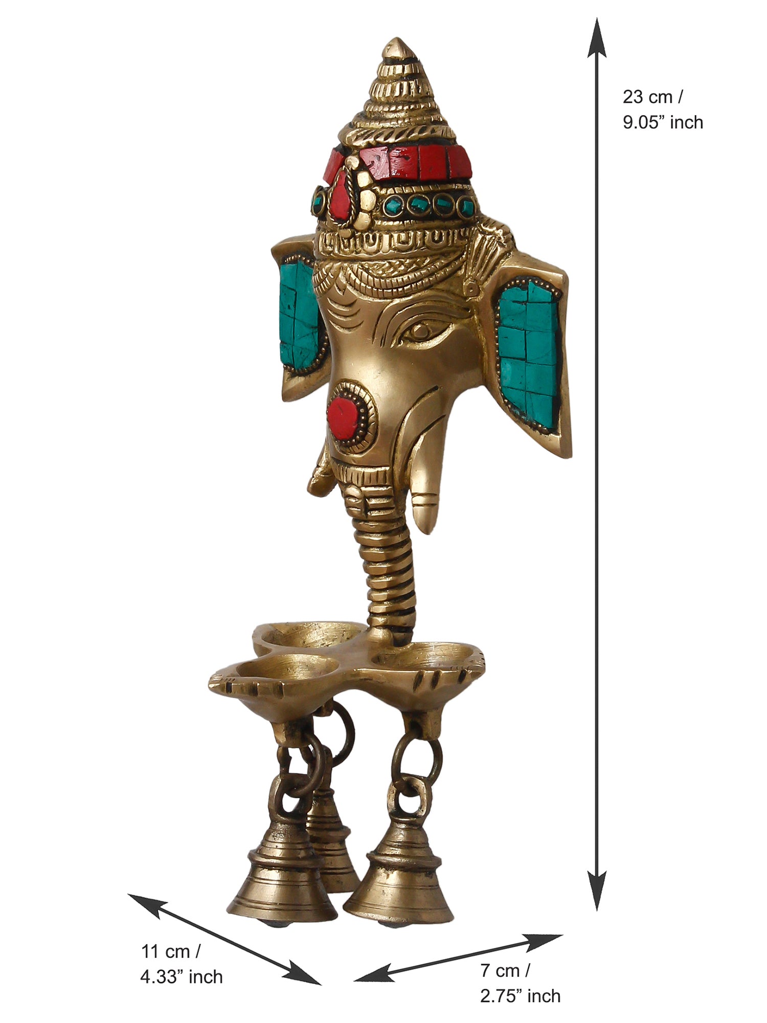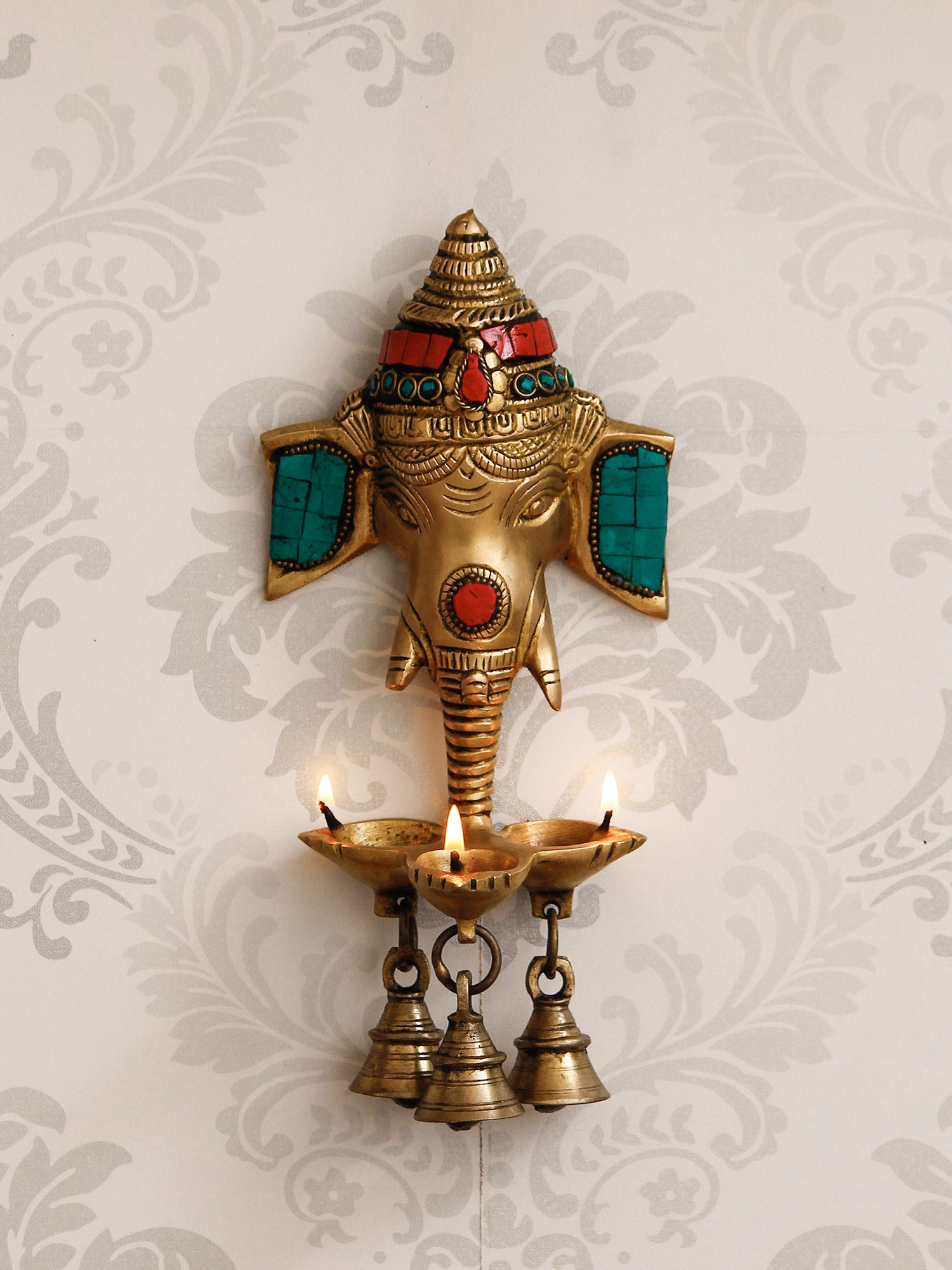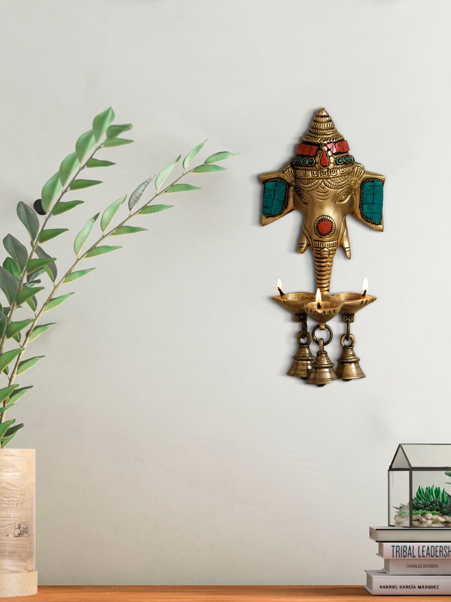 Package Content - One Lord Ganesha with 3 Bells and Diya for 3 Wicks Brass Wall Hanging Handcrafted Artifact with Colorful Stone Work
