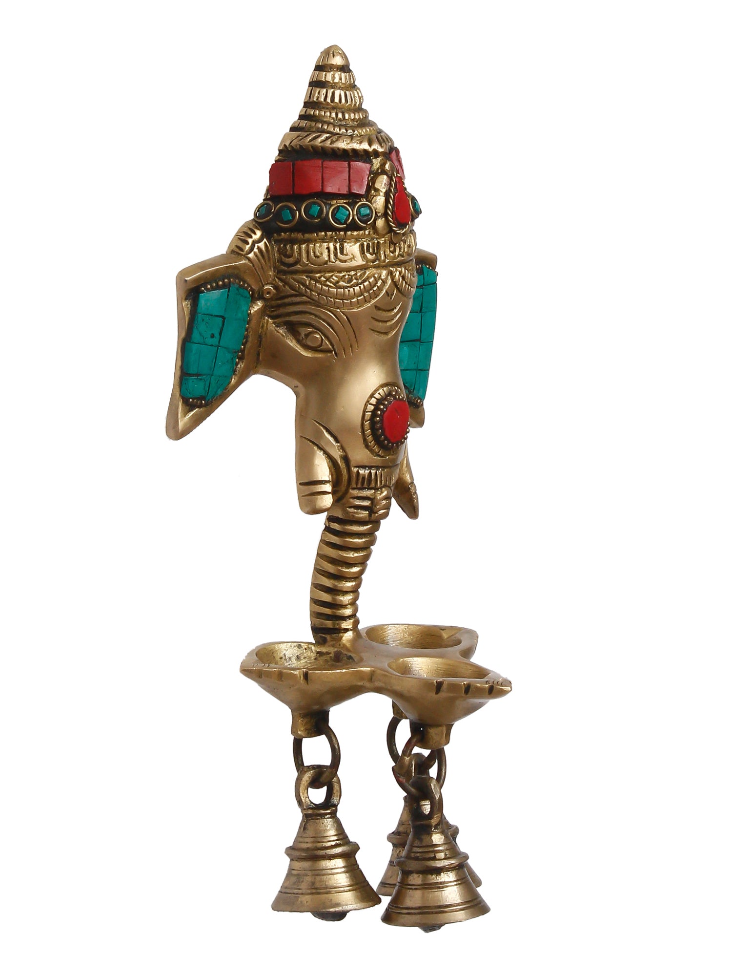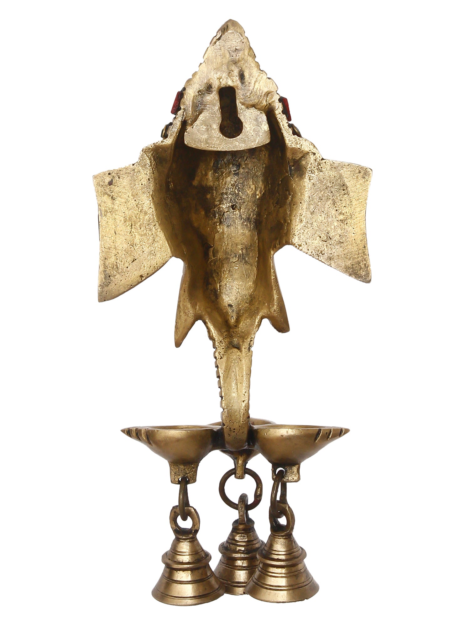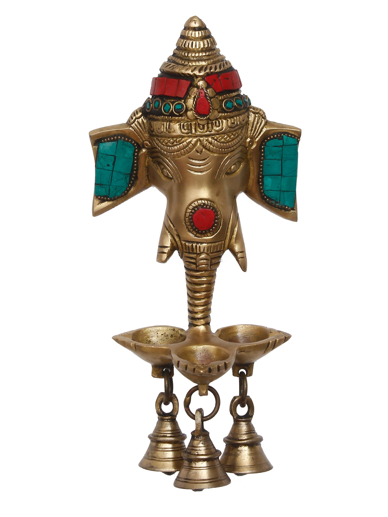 Package Content - One Lord Ganesha with 3 Bells and Diya for 3 Wicks Brass Wall Hanging Handcrafted Artifact with Colorful Stone Work