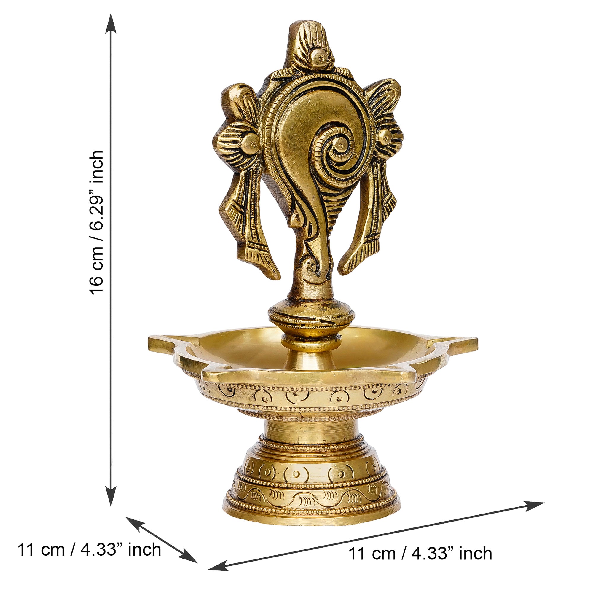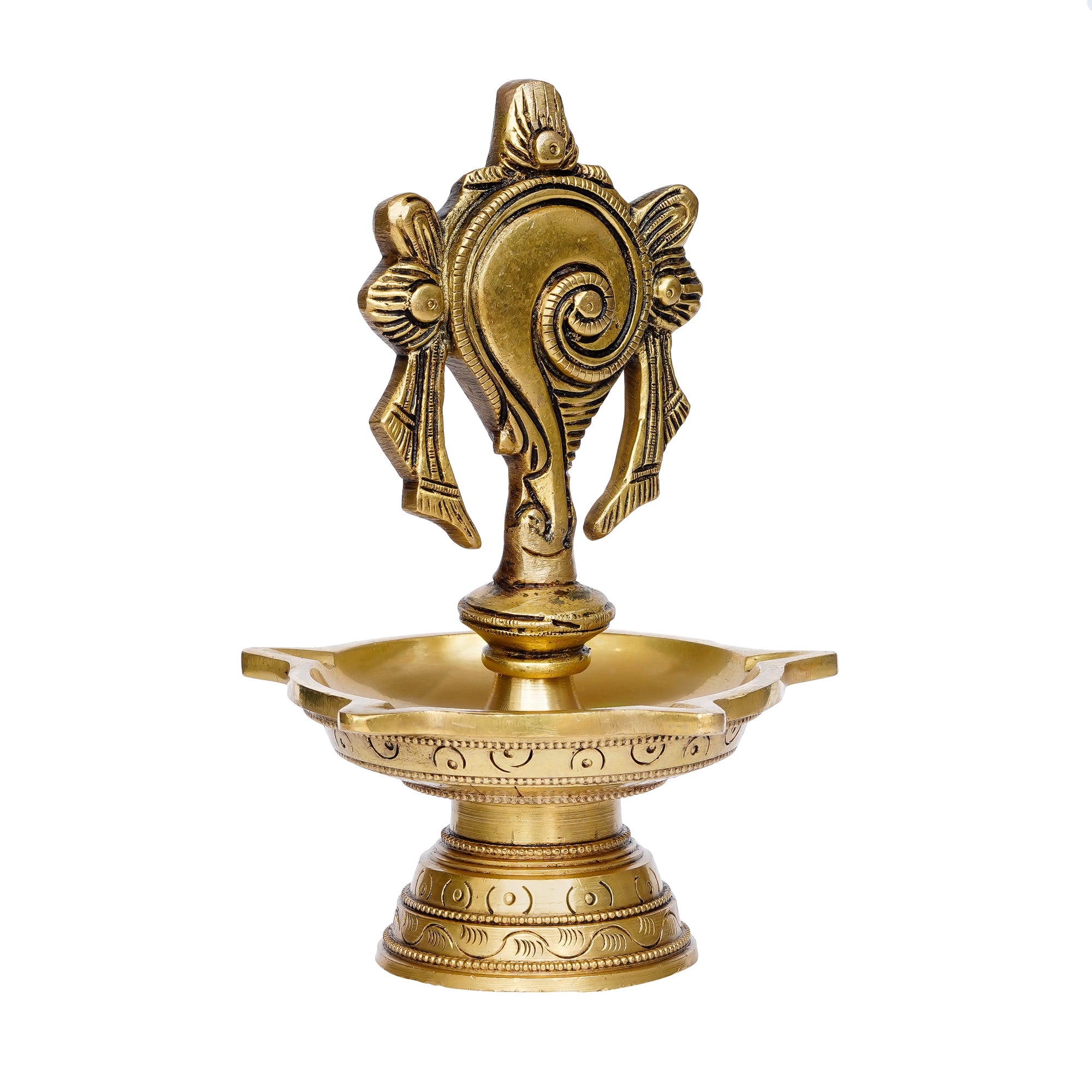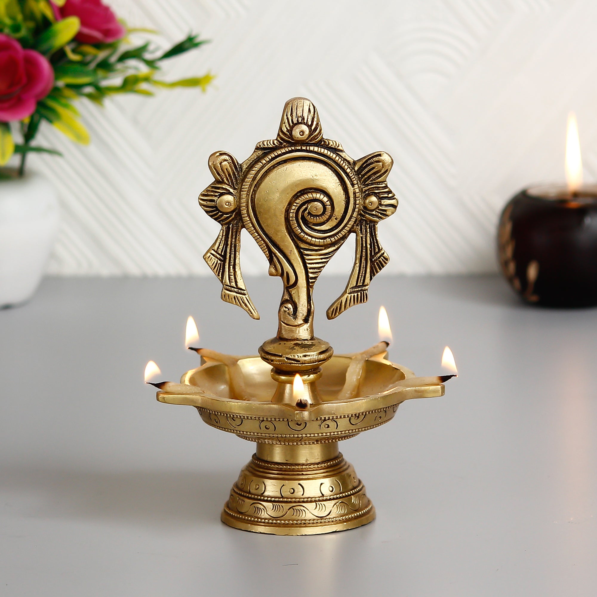 Product Description - Give royal touch to your home decor with eCraftIndia Shankha Handcrafted Brass Diya with 5 wicks. Featuring an excellent finish, this diya looks extremely classy and elegant. This royal piece of art simply shows that how can a simple work of art turns into a master piece of craftsmanship. It can also serve as a great gifting option for your loved ones, family and friends. This statue has been diligently handcrafted by skilled artisans of eCraftIndia using various conventional techniques.