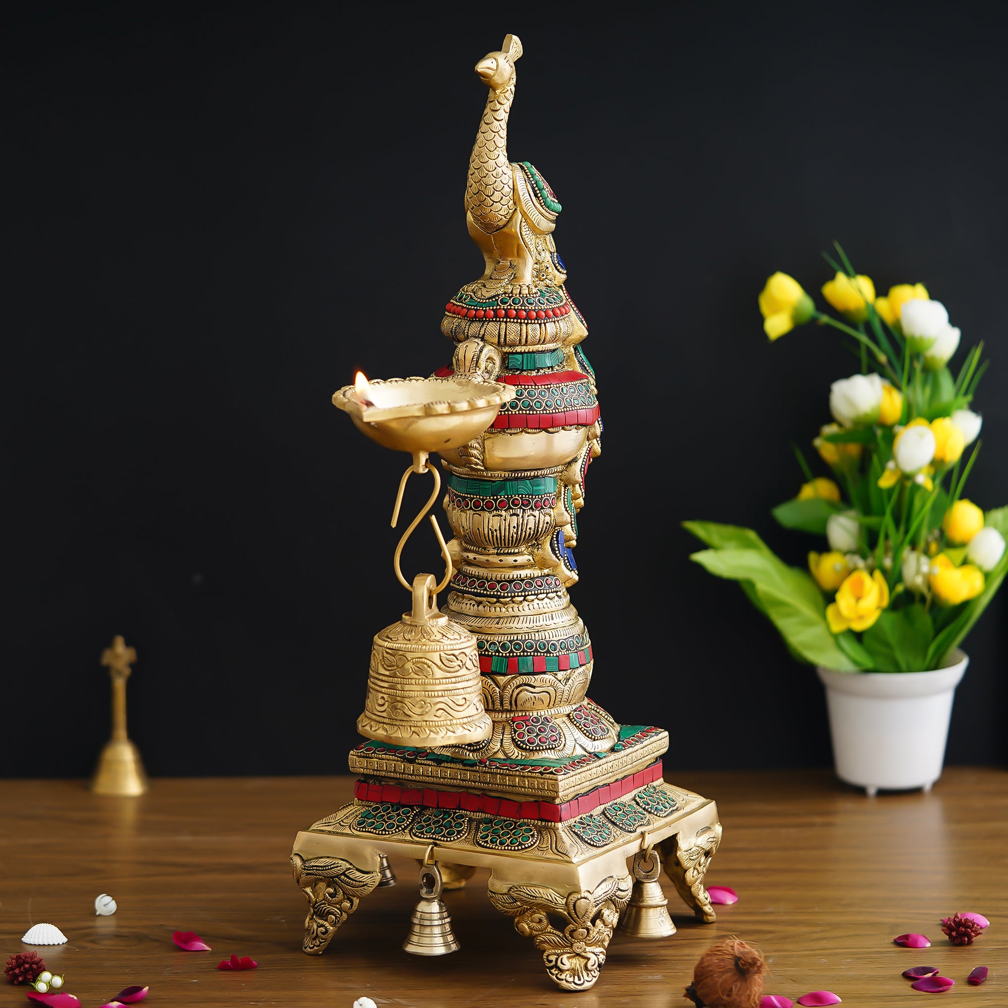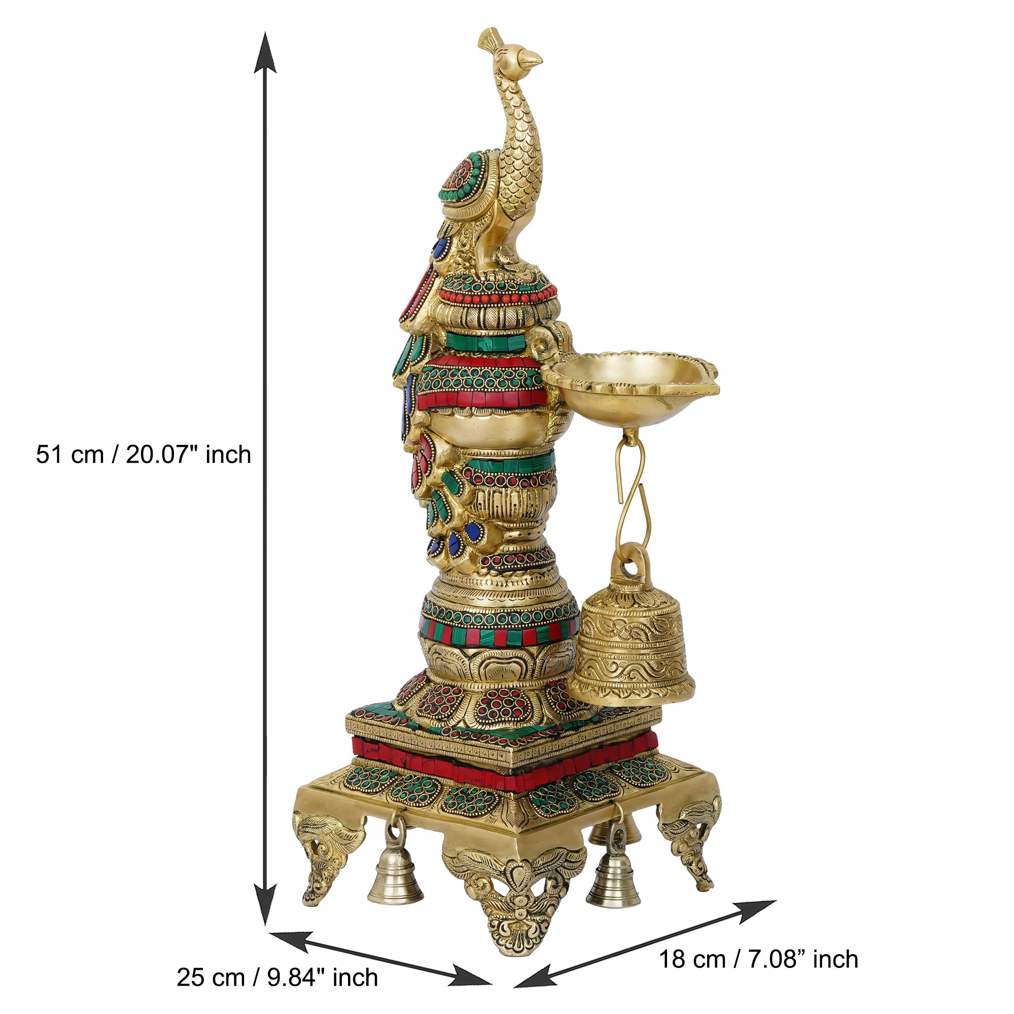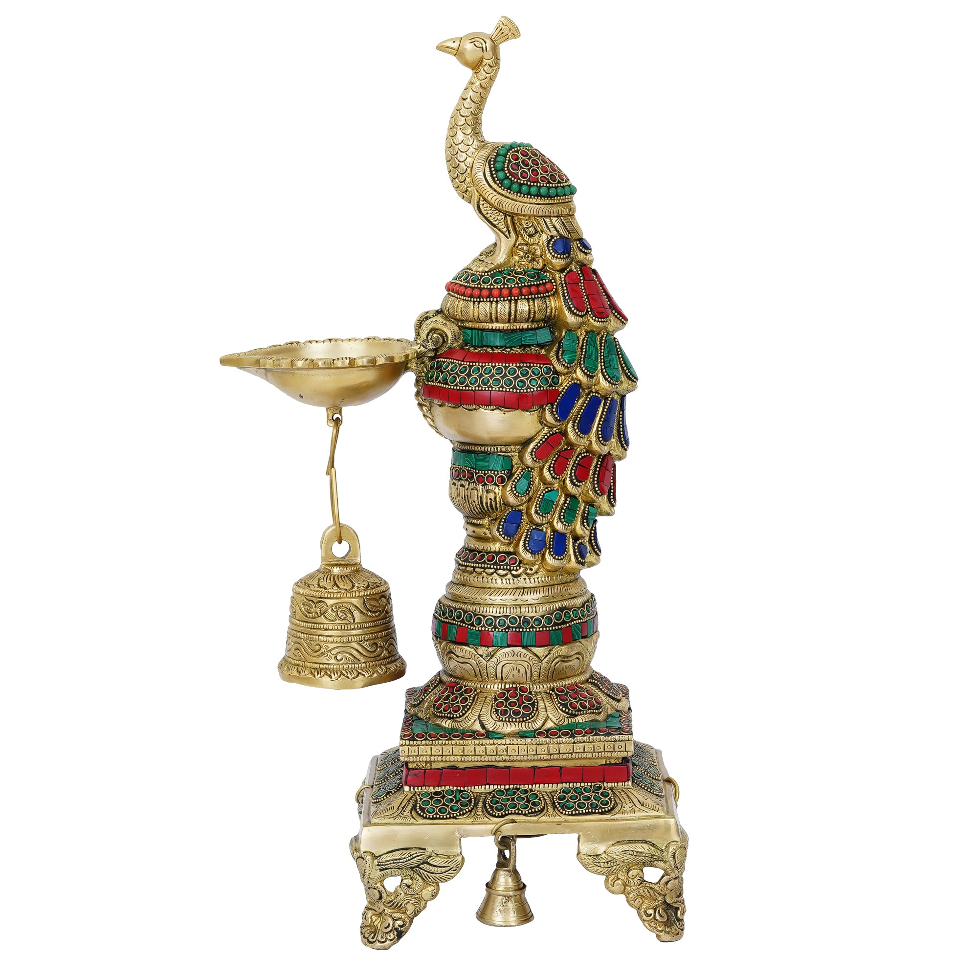 Package Content - One Colorful Peacock Handcrafted Brass Diya Stand with Stone Work and Bell