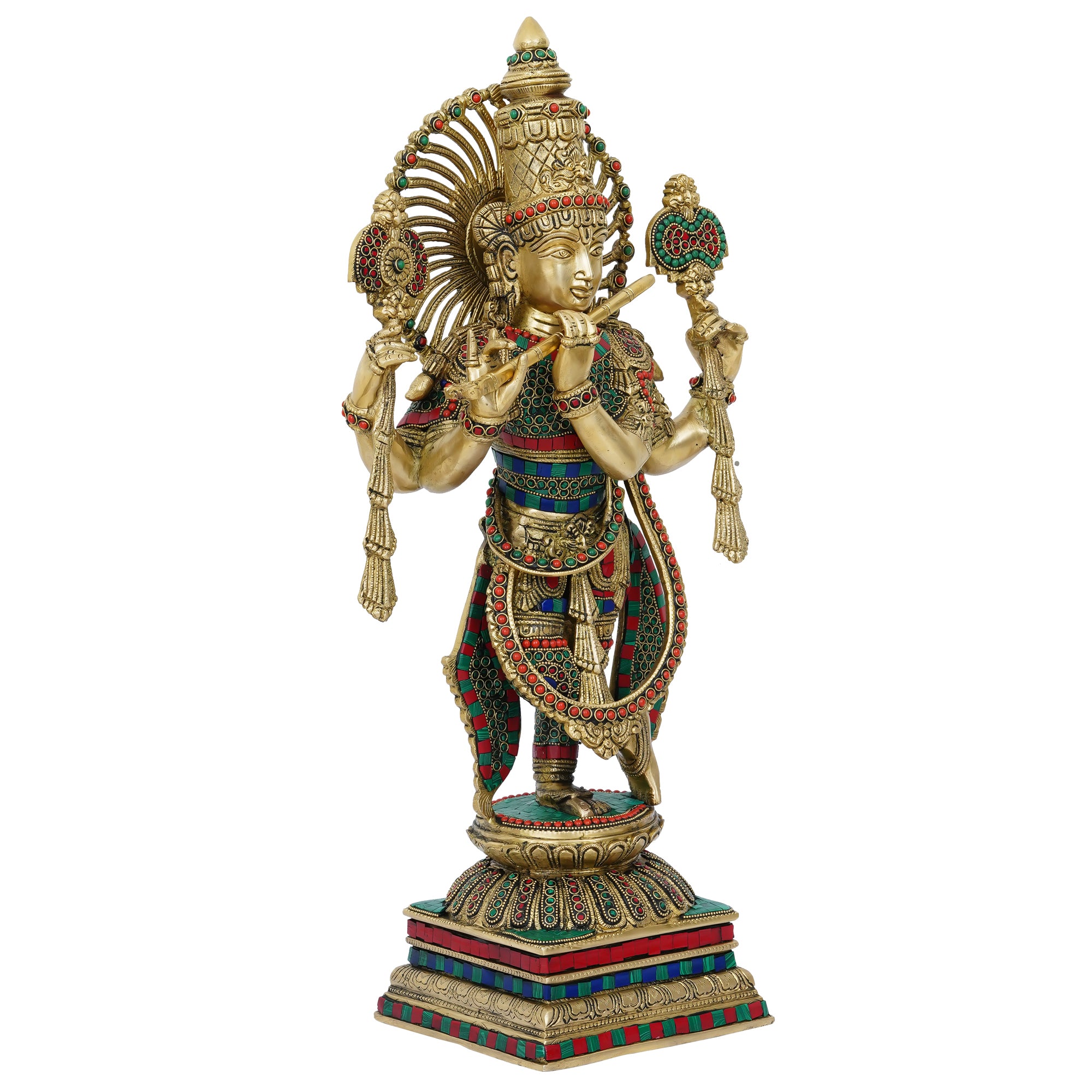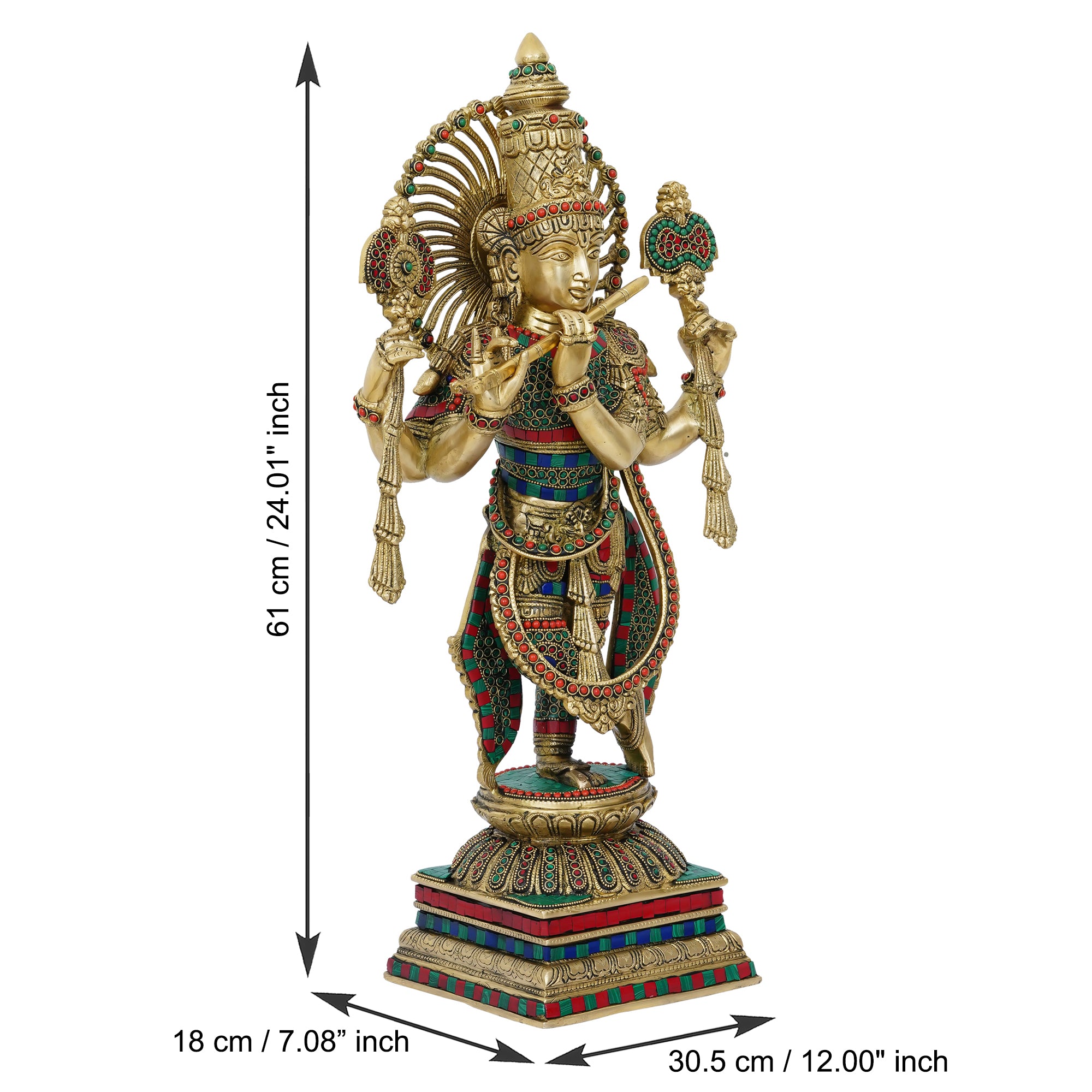 Package Content - One Colorful Lord Krishna Playing Flute Handcrafted Brass Idol with Stone Work