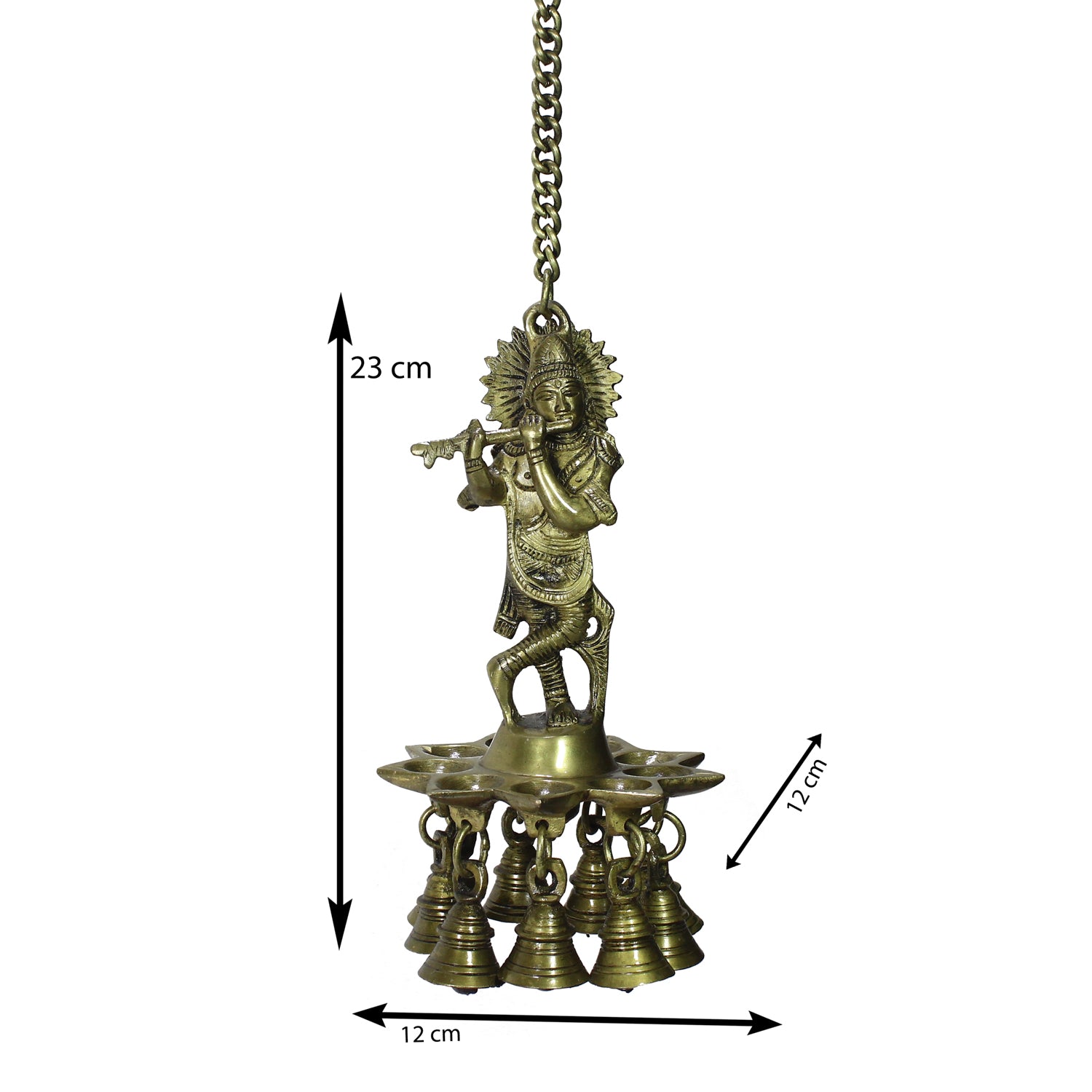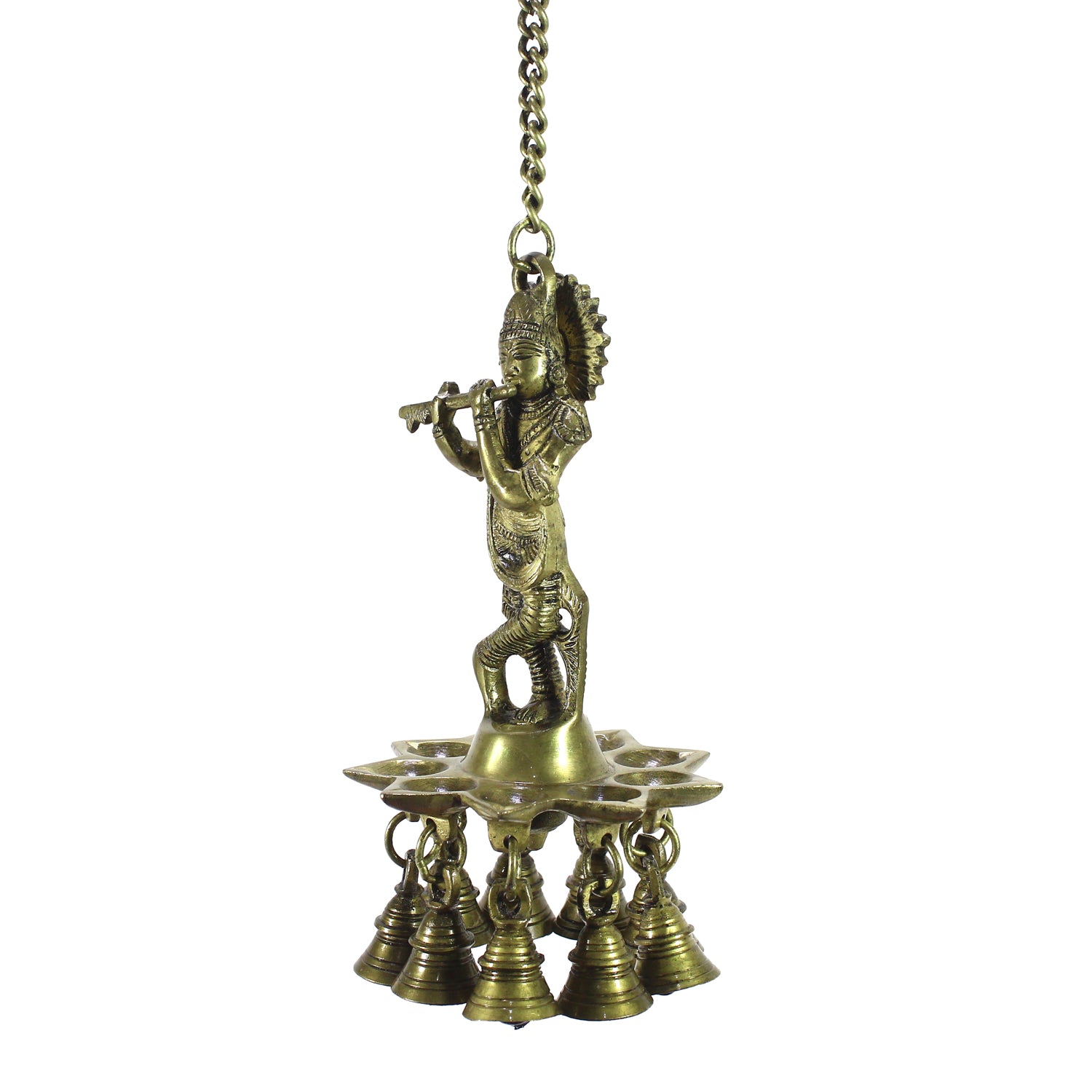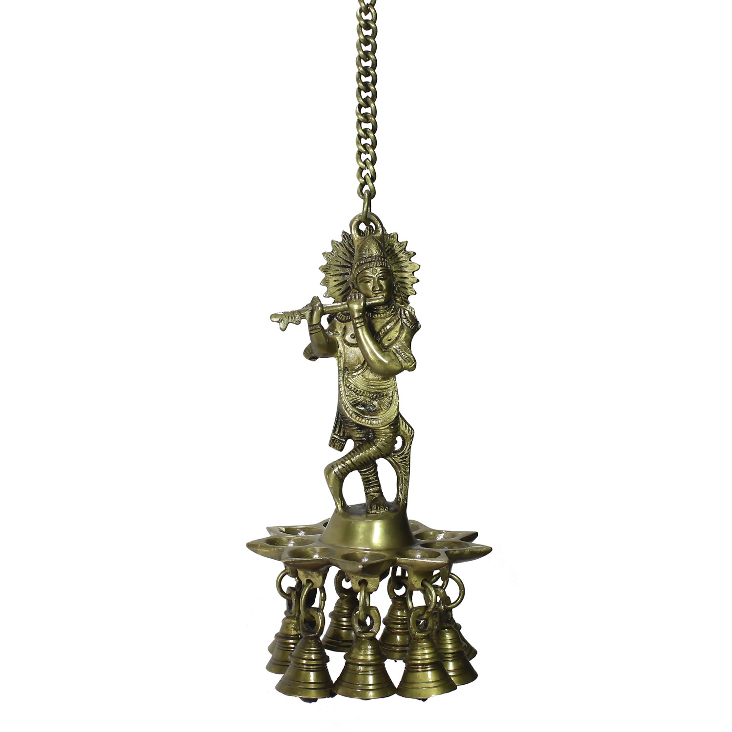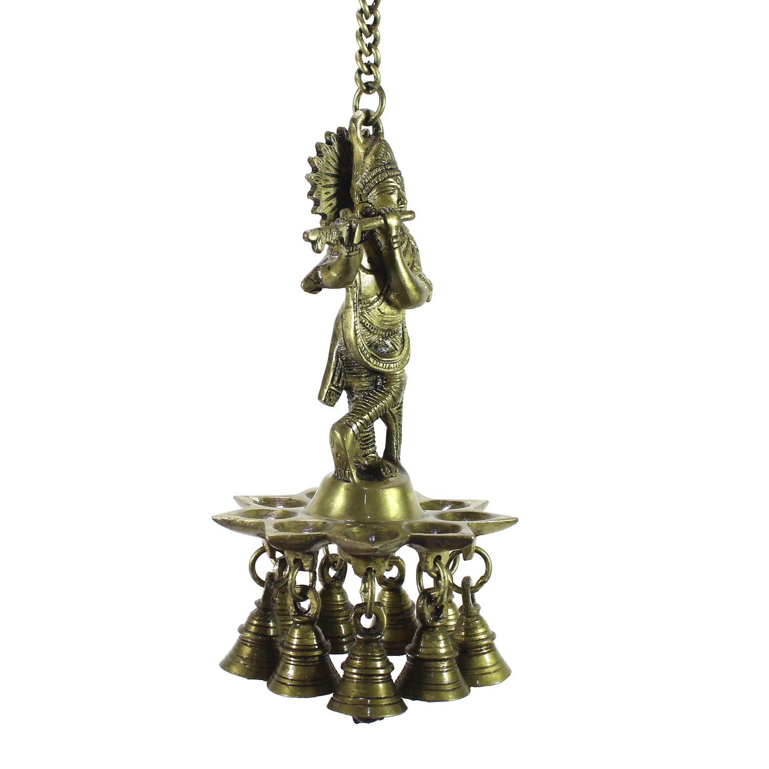 Product Description - Lend a hint of decoration to your home with this brass Krishna Diya Roof hanging. Exquisitely designed, this roof hanging has unique antique look. This gorgeous and exquisite figure is perfect for your home decor as roof hanging. It is made of brass in antique finish. It's a wonderful keepsake for your home. This designer Deepak or Diya isn't just a Diya, its a multipurpose decorative embellishment for all modern homes. The product has been designed quite intelligently and features Lord Krishna in center. The brass Diya's are included in this roof hanging, depicting that Krishna is playing Flute in between these Diya's. To complement the roof hanging and Diya's, artisans have installed bells below each Diya, making it one of the most pious and auspicious additions to any modern home. The roof hanging is bright and beautiful for any temple or home. This diya has been enthusiastically handcrafted and colored by skilled artisans from the house of eCraftIndia using various conventional techniques.