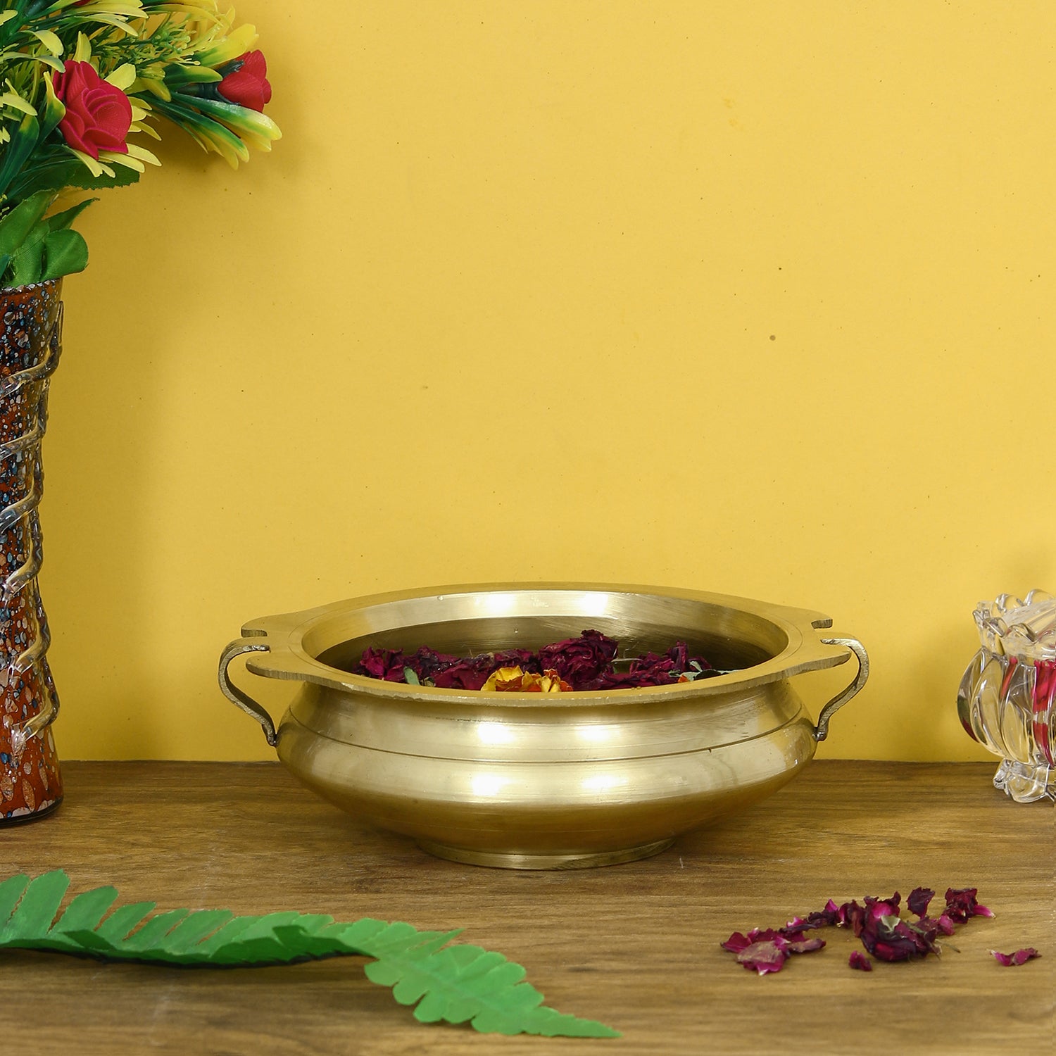 Product Description - If you have ever spent time gazing at the gorgeous urli that sat in your grandmother’s home or if you have craved the thought of recreating that five-star hotel lobby looks in your home, then this decorative brass urli is just right for you! Made using high-quality brass, this urli has been created to mesmerize whether you keep it as it is or you choose to fill it with water and floating candles or simply with flowers, you can be sure that it will become the center of attention. A wonderful addition to your own home as well as a gift to someone you care about pick this urli today! The antique gold color looks striking and the use of brass ensures longevity and ease of maintenance. To display the bowl in the traditional way, fill it with water and then float living or artificial flowers on top. Add water to the urli, mix a bit of rose water, and float flowers of your choice. You can also place floating candles on the surface of the water. No matter how you use the Handmade Brass Urli, you're certain to be impressed with its quality! Beautify your home with this traditional Indian decorative design urli bowl.
