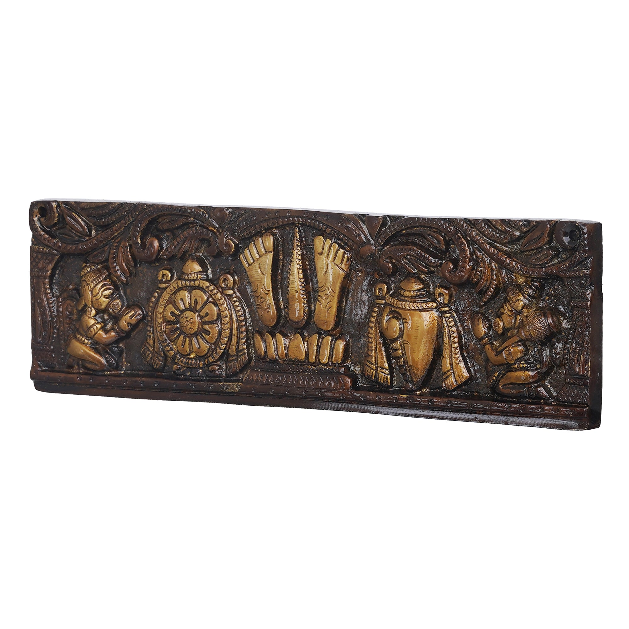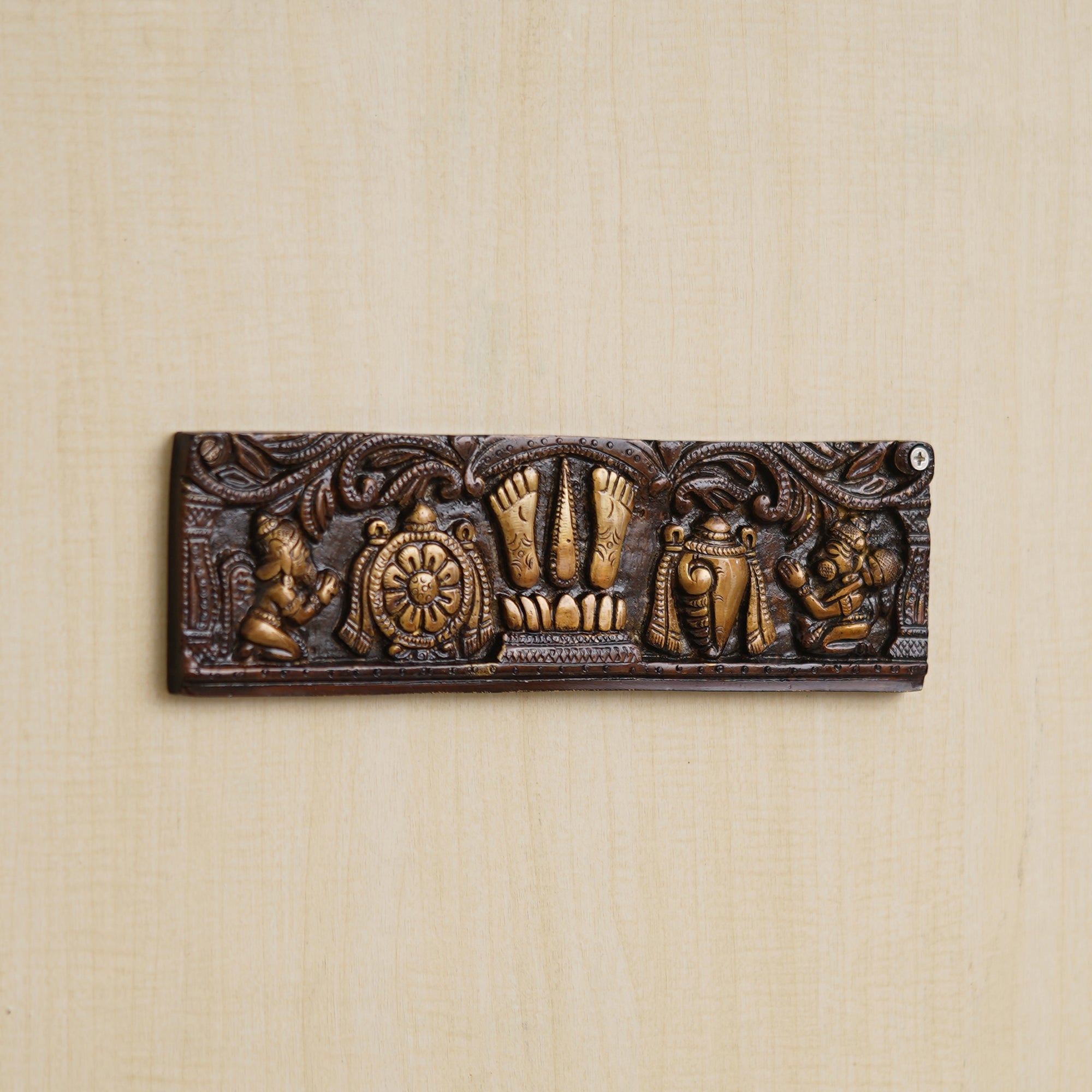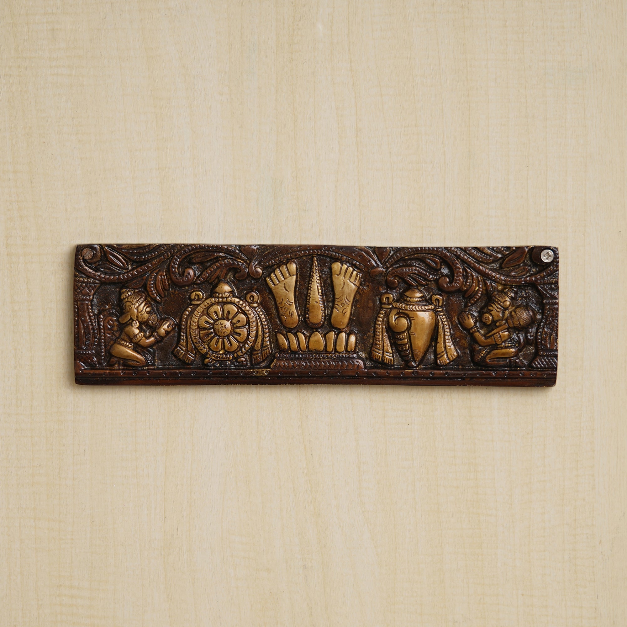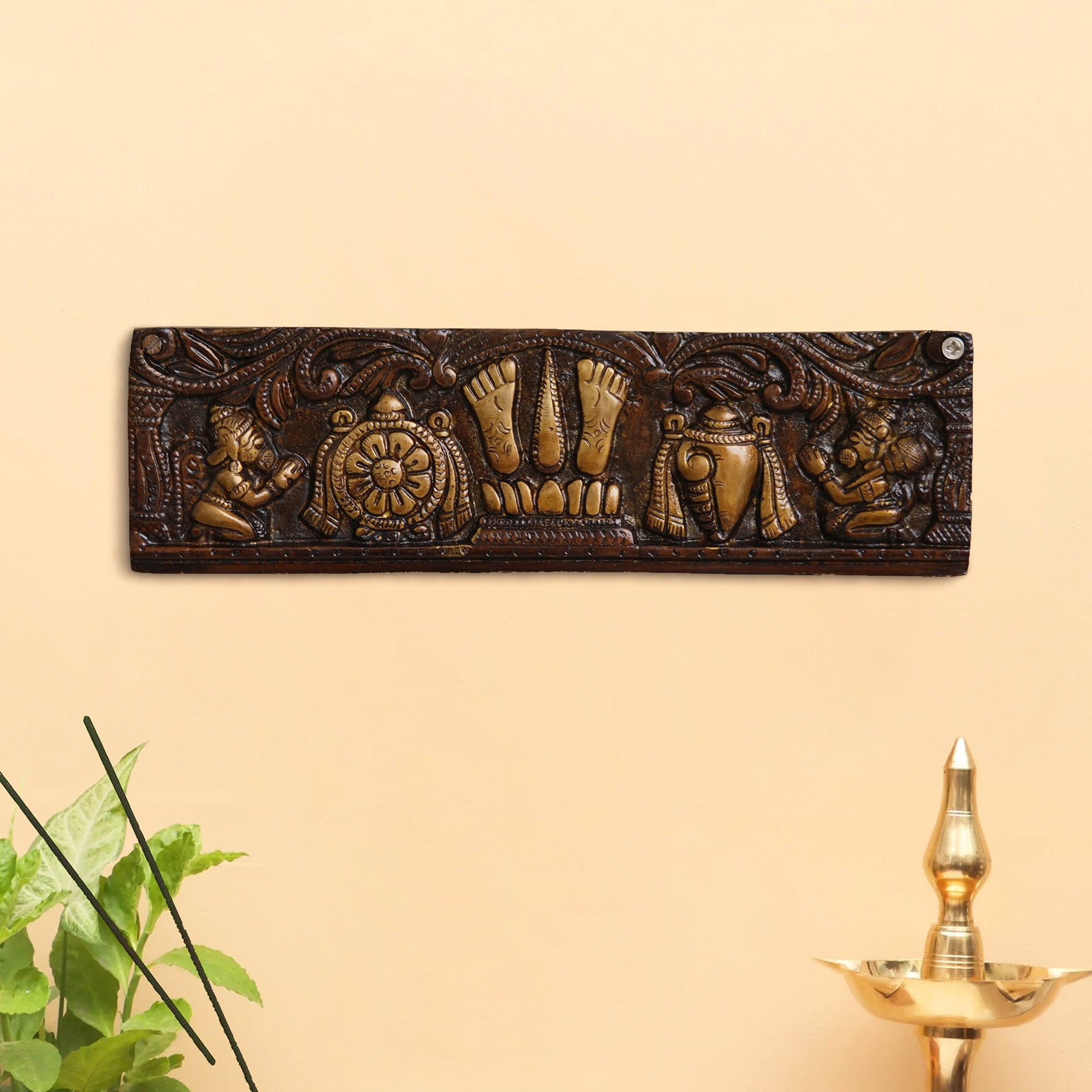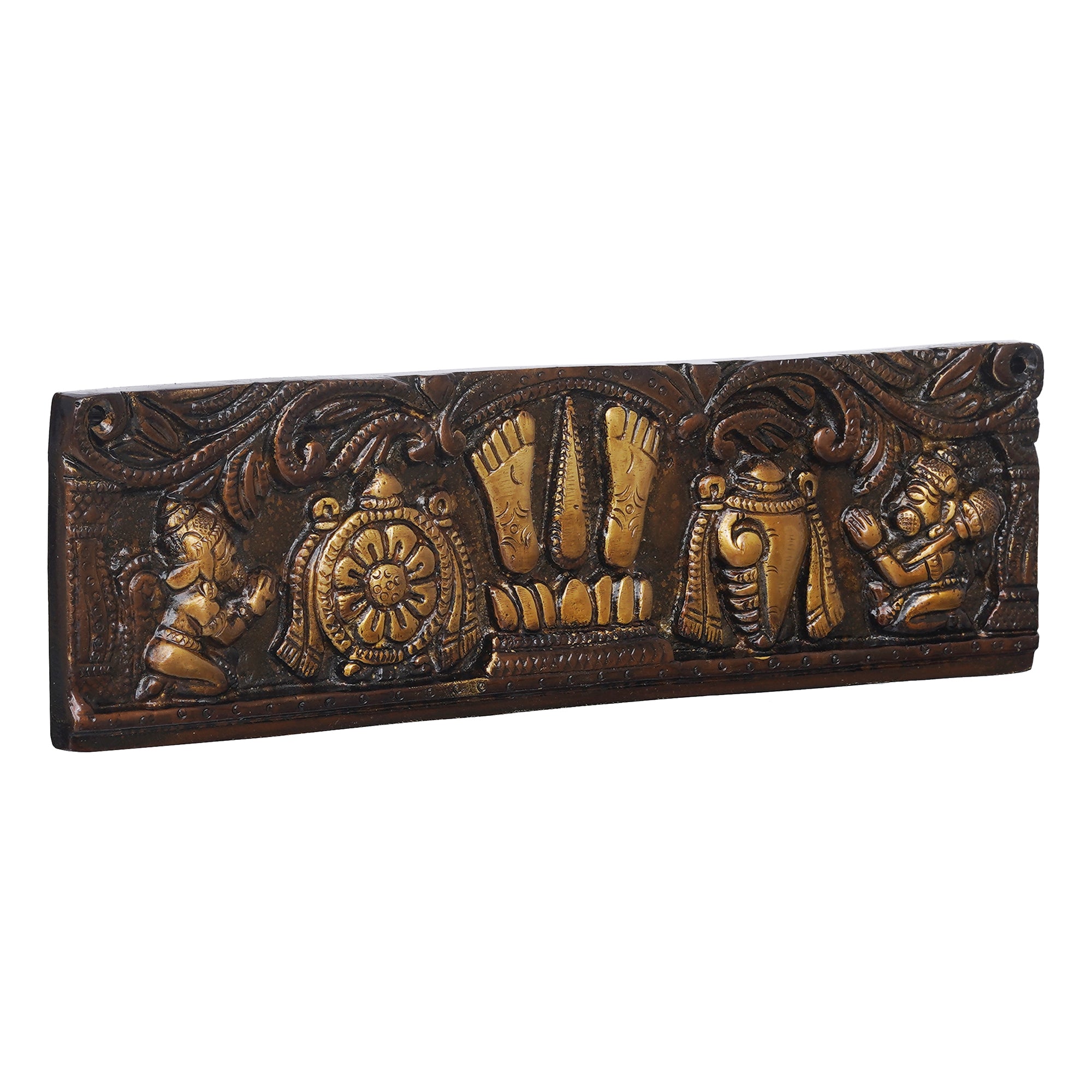 Product Description - Elevate your spiritual space with eCraftIndia's Brown Golden Brass Tirupati Balaji Symbol Shankh Chakra Tilak Paduka Lotus Flower With Hanuman Ji Decorative Religious Wall Hanging Showpiece, a profound expression of faith and devotion. This intricately designed masterpiece encapsulates the essence of divine blessings, making it a perfect addition to your puja room or living area. The ornate details and rich symbolism symbolize prosperity and protection. Whether you're enhancing your own spiritual sanctuary or seeking a meaningful gift, this wall hanging is a thoughtful choice. Present it during religious ceremonies, housewarmings, or auspicious occasions to share the sacred blessings and seek divine grace for yourself or your loved ones.