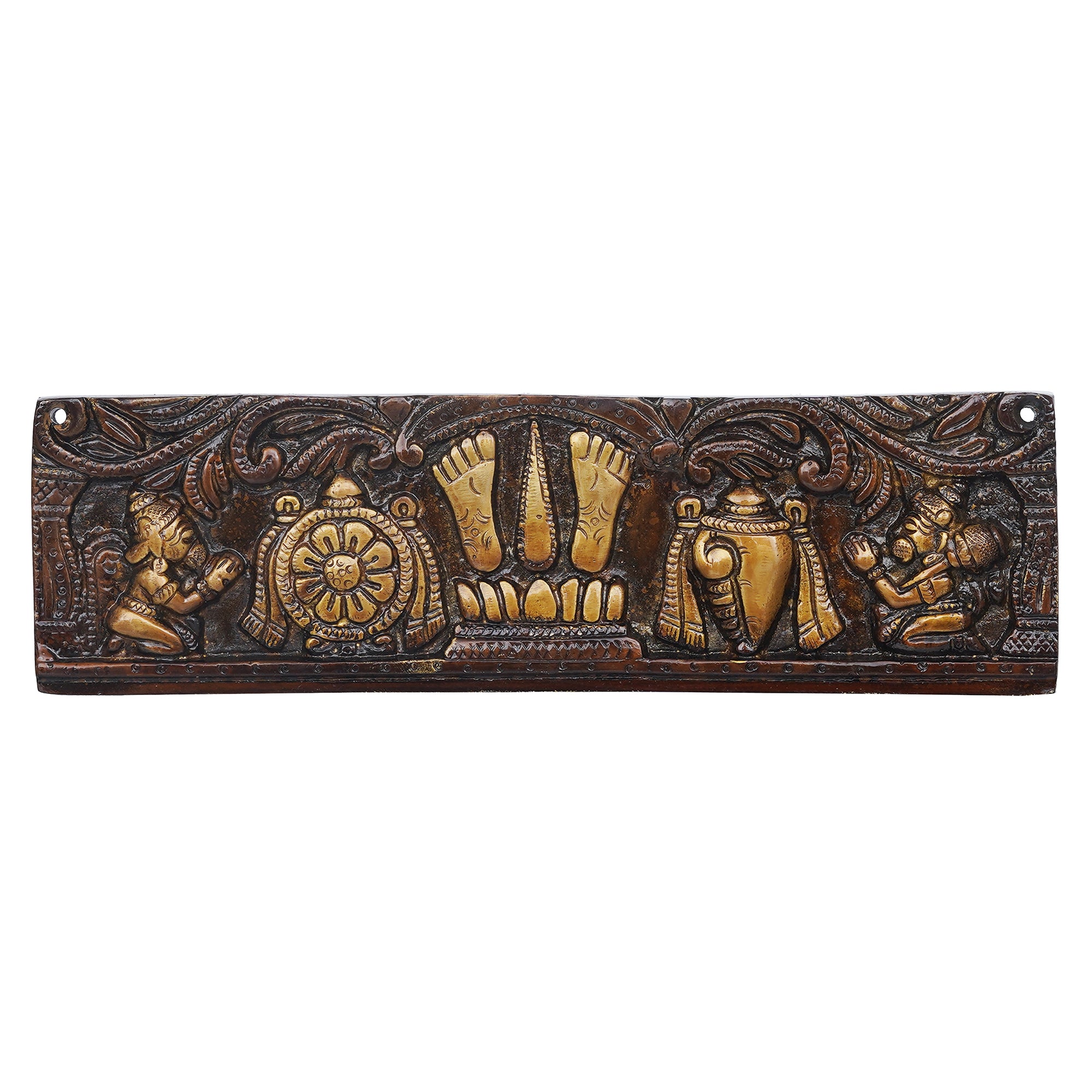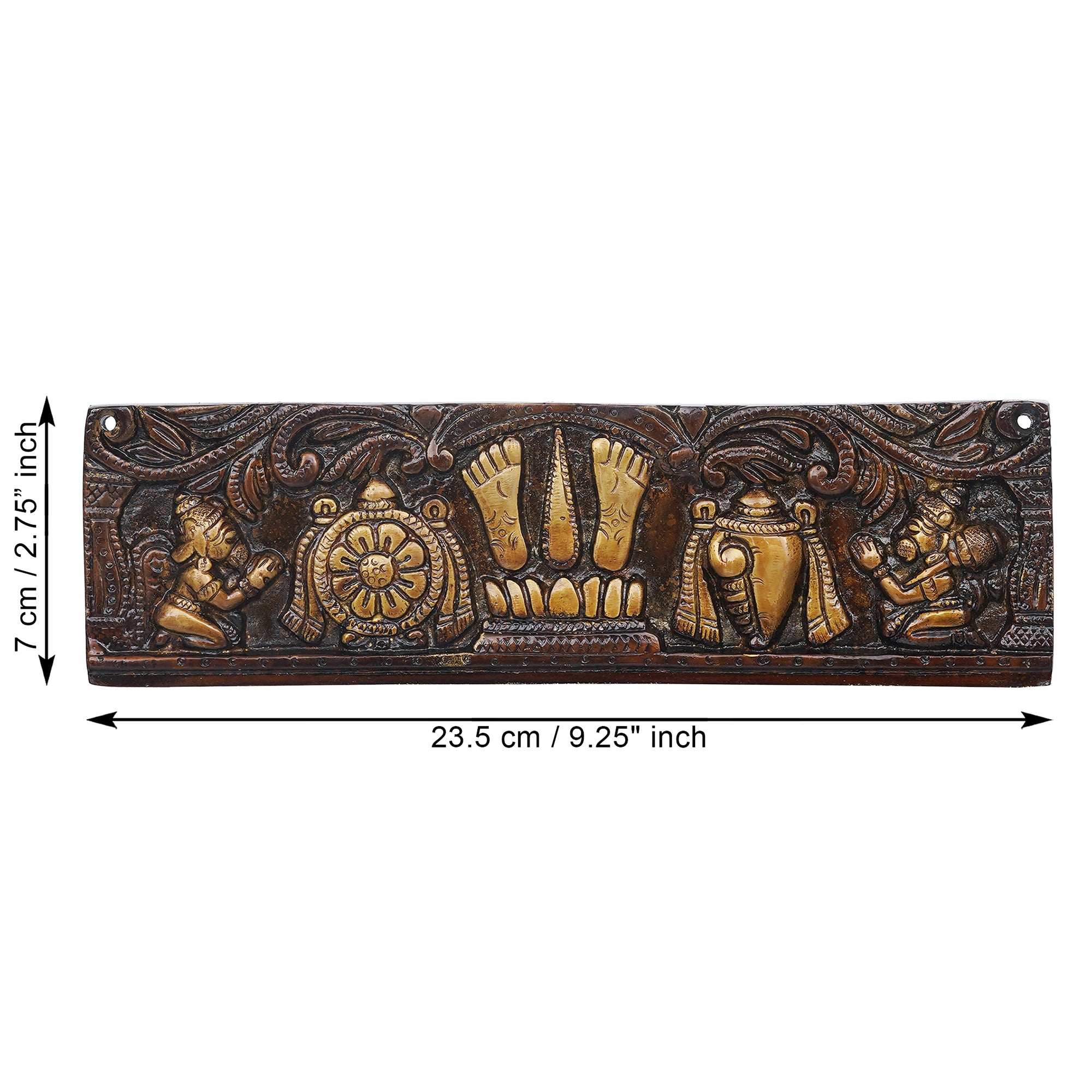 Package Content - One Brown Golden Brass Tirupati Balaji Symbol Shankh Chakra Tilak Paduka Lotus Flower With Hanuman Ji Decorative Religious Wall Hanging Showpiece