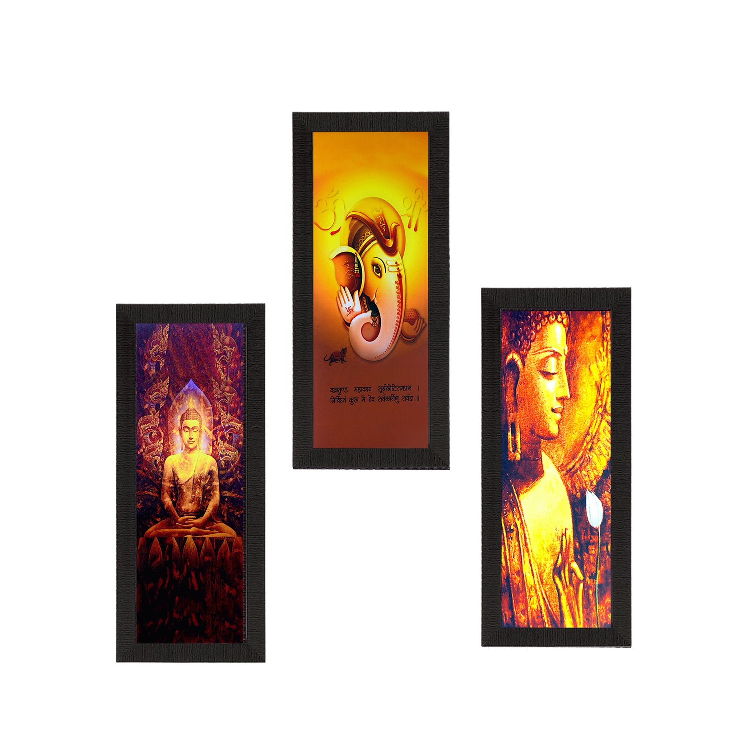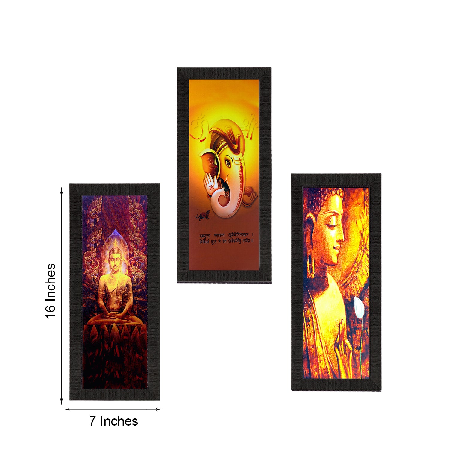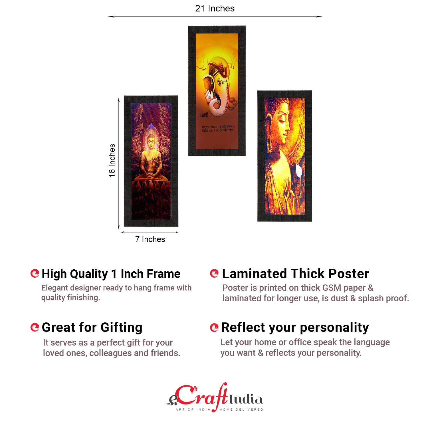 Product Description - Lord Ganesha is said to be the remover of obstacles and is revered at every new beginning, isn't he? It is also believed that gifting Lord Ganesha along with Lord Buddha to your loved one on an auspicious celebration brings good luck. Be it, Lord Ganesha, Lord Buddha's idol, or wall art, paintings further hold and play a significant role. All our paintings come in various hues as well as different add-ons such as Om, Swastik, etc that are surely going to enhance your wall decoration. Our Ganesha with Buddha framed paintings is available in sets as well that will help you incorporate the entire wall space creatively. Each design reflects the artistic qualities and time one has taken to design this painting. These frames don't include glass so it is very lightweight and wet cloth can be used to clean them. Exquisitely printed and framed, it is also a perfect gifting option for your colleagues, loved ones, and family members.