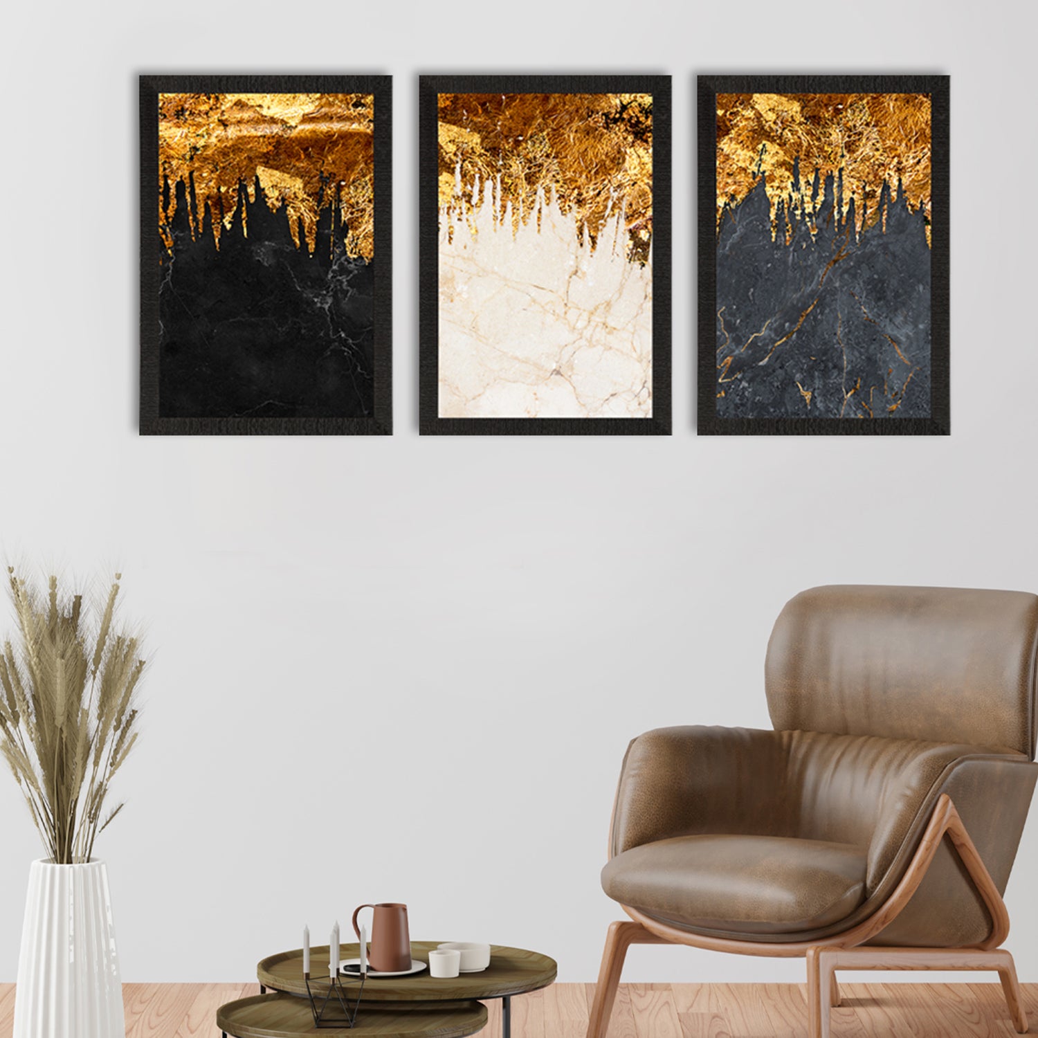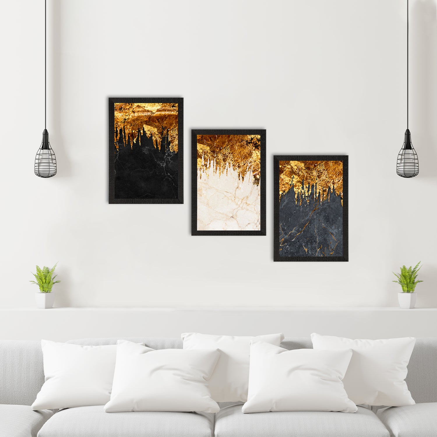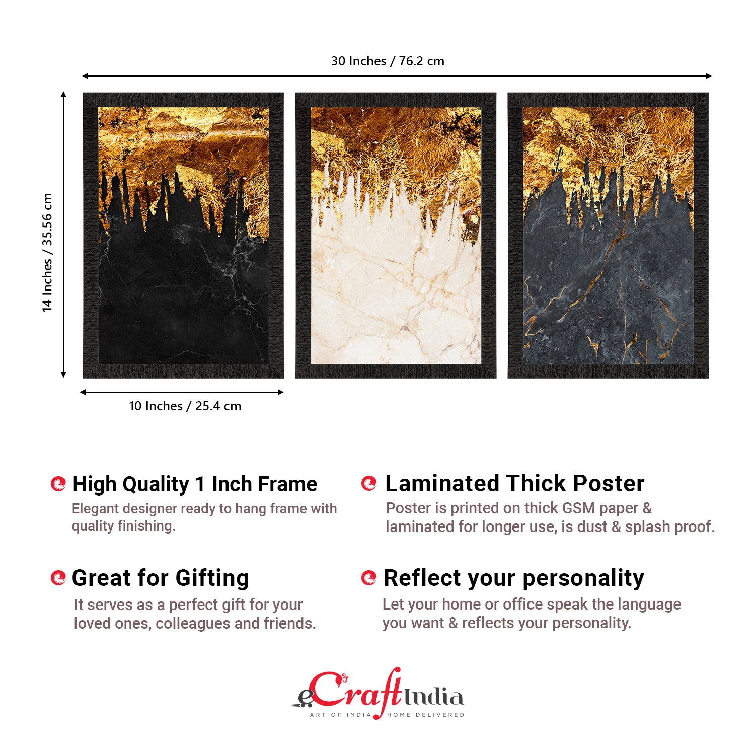 Product Description - Decorate your home & office walls with this artistic design eCraftIndia Marble Effect with Golden Set of 3 Satin Matt Texture UV Art Painting. Each design reflects the artistic qualities and time one has taken to design this painting. Exquisitely printed and framed, it is also a perfect gifting option for your colleagues, loved ones and family members. These frames don't include glass so it is very light weight and wet cloth can be used to clean it.