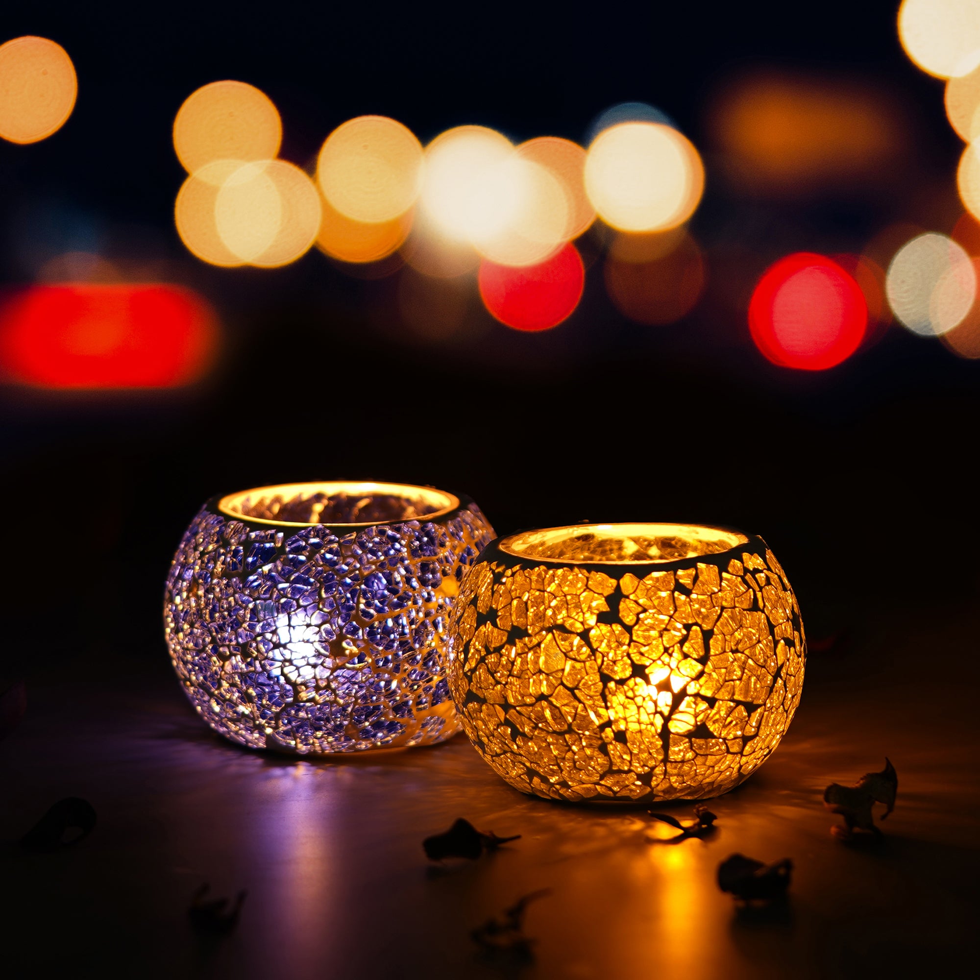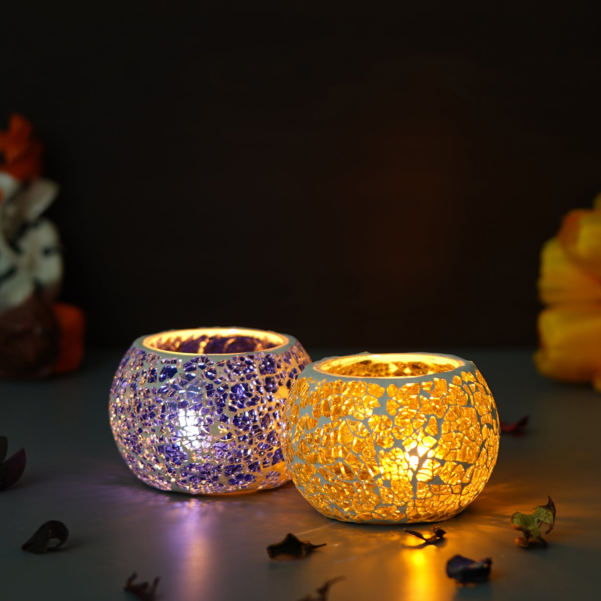 | Package Content - | Purple & Yellow Set of 2 Mosiac Glass Decorative Tea Light Holder/diya |