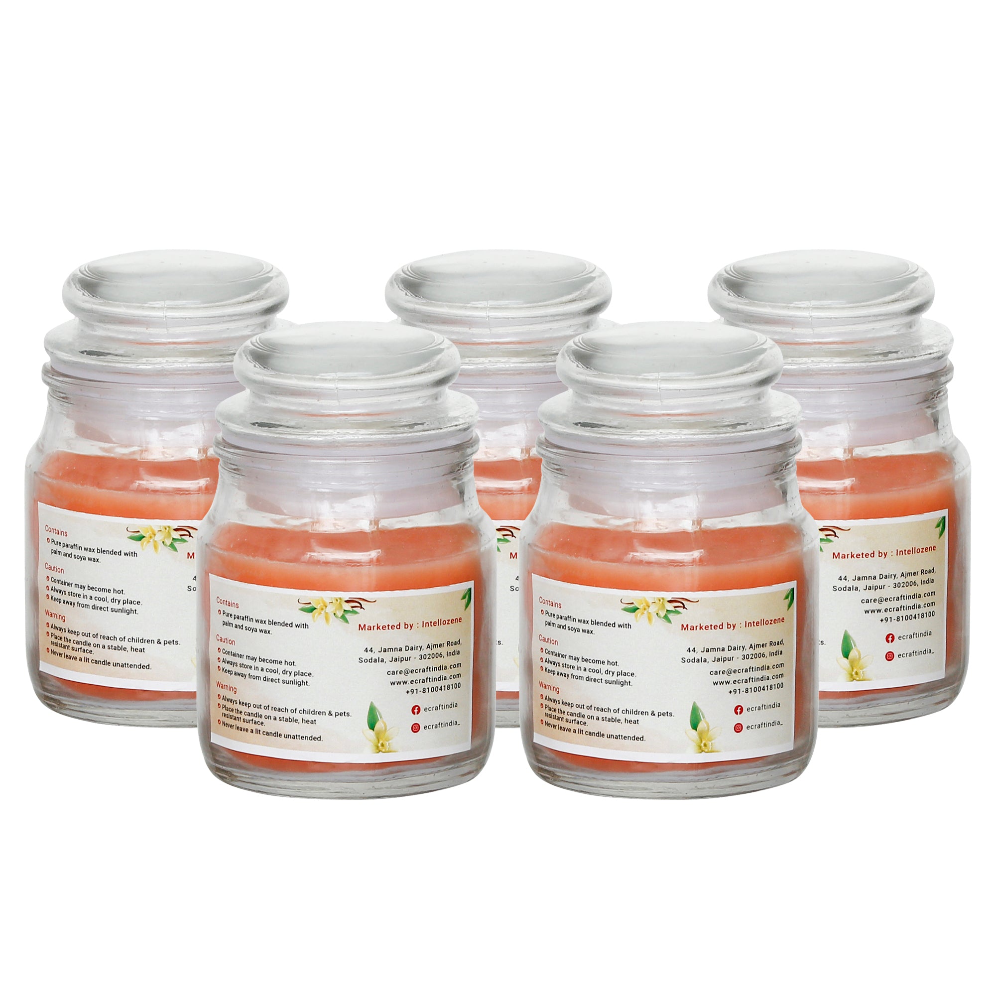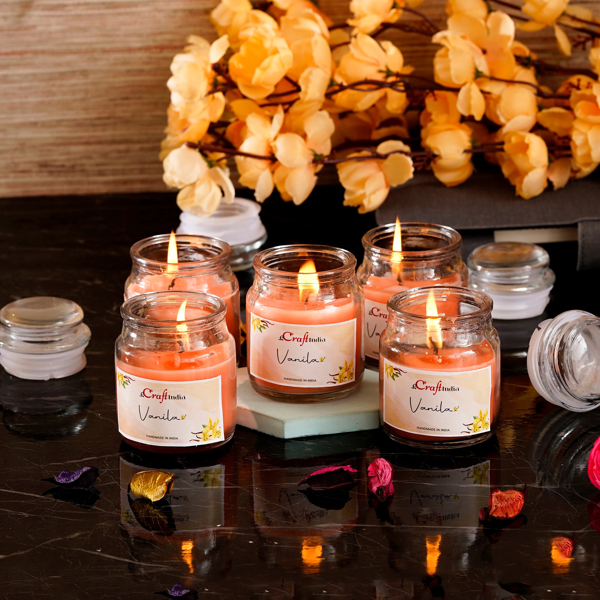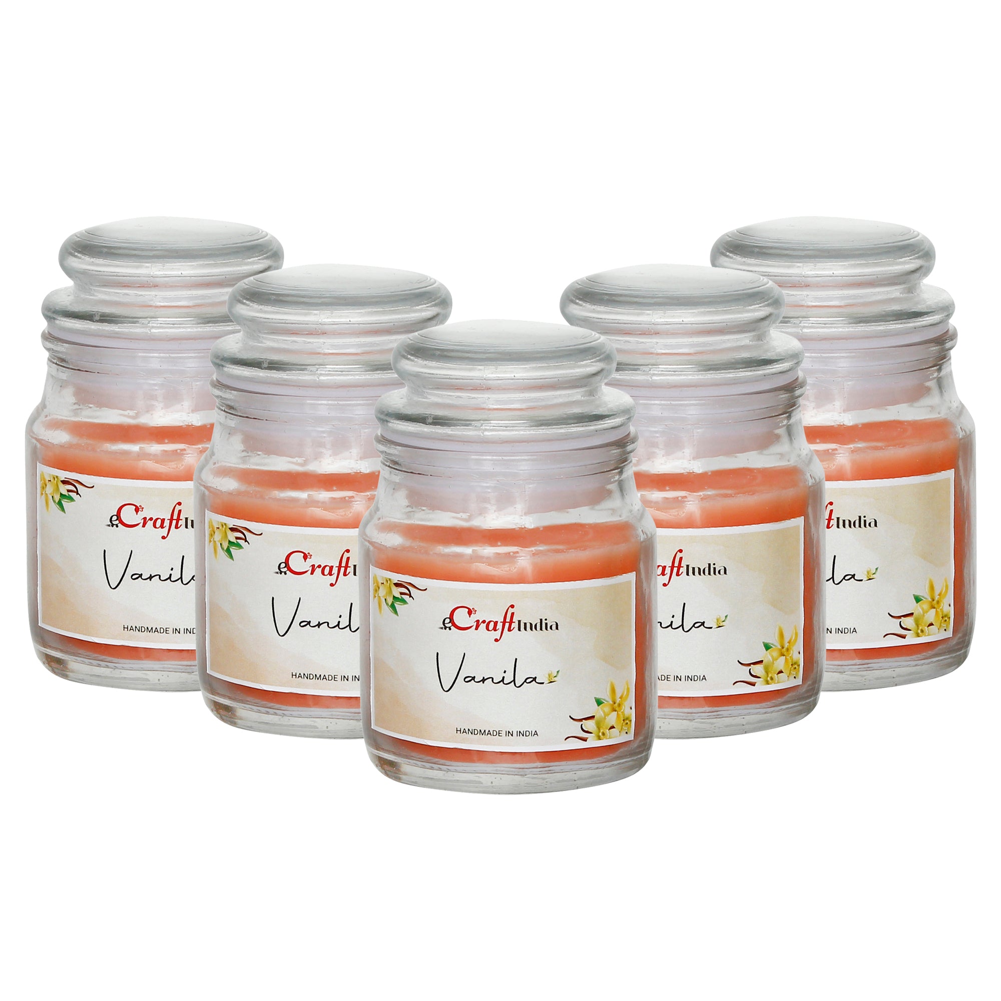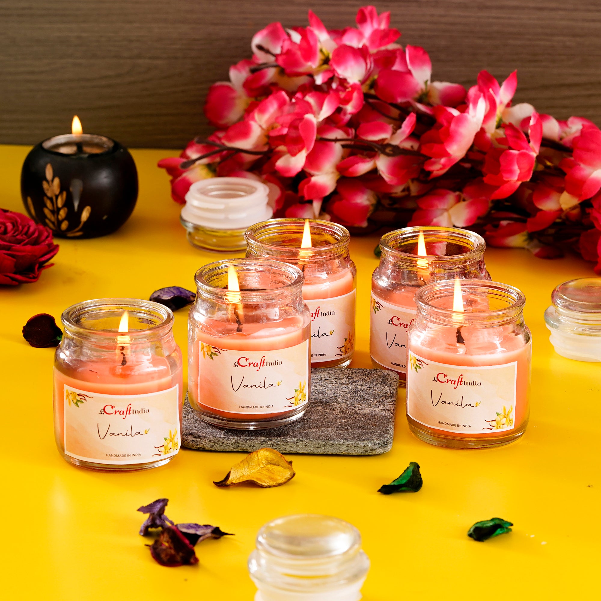 Product Description - Set the mood for an event with the scent of these adorable eCraftIndia Set of 5 Vanilla Scented Jar Candle . Perfect to scatter candlelight, this candle fills the air with a fresh summery scent. There is nothing cuter than a candle to make for the most eye-catching décor ever!