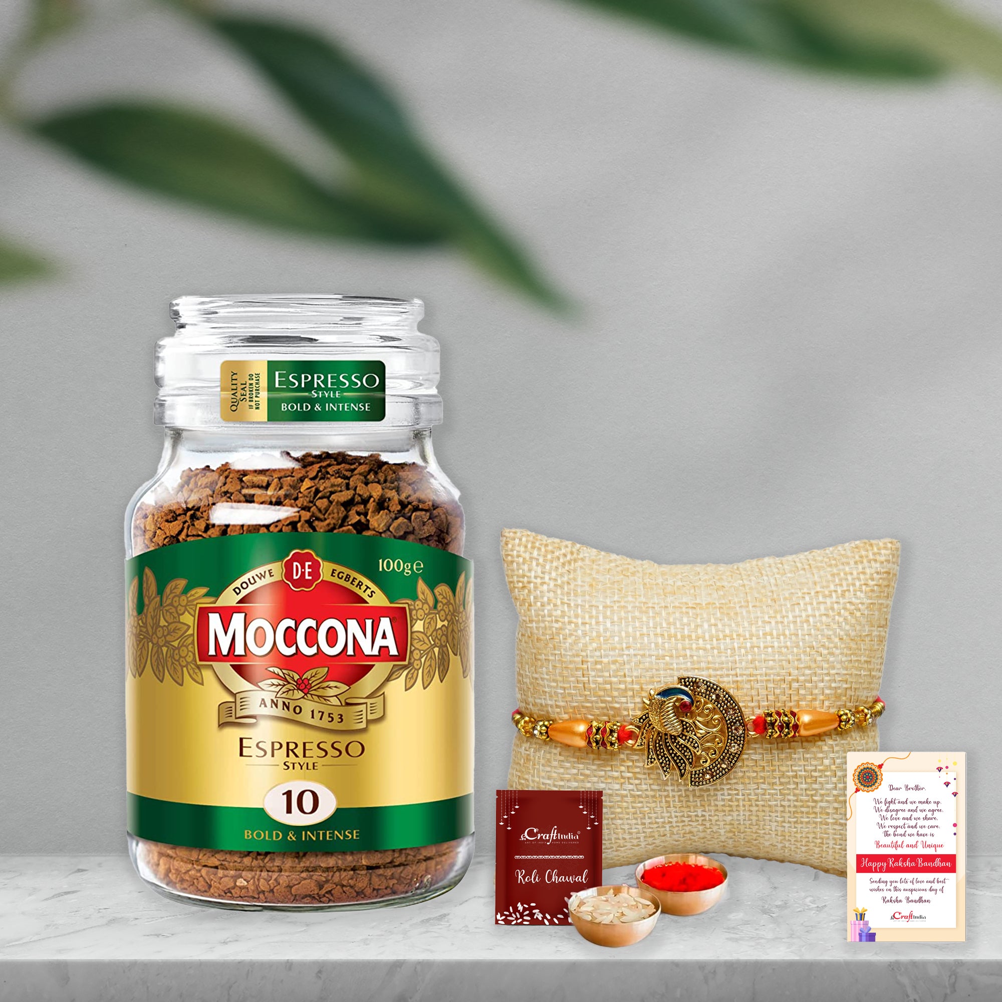 Product Description - Celebrate Raksha Bandhan with grace and flavor using the eCraftIndia Designer Peacock Rakhi, Roli Chawal Pack, and Moccona Premium Espresso Style Instant Coffee Powder. The intricate peacock Rakhi symbolizes beauty and love between siblings. Enjoy the bold and intense taste of Moccona Premium Espresso Style Instant Coffee Powder, a 100g pack of coffee beans, along with the traditional Roli Chawal Pack. Strengthen the bond and make Raksha Bandhan truly special with this delightful combo for you and your beloved sibling.