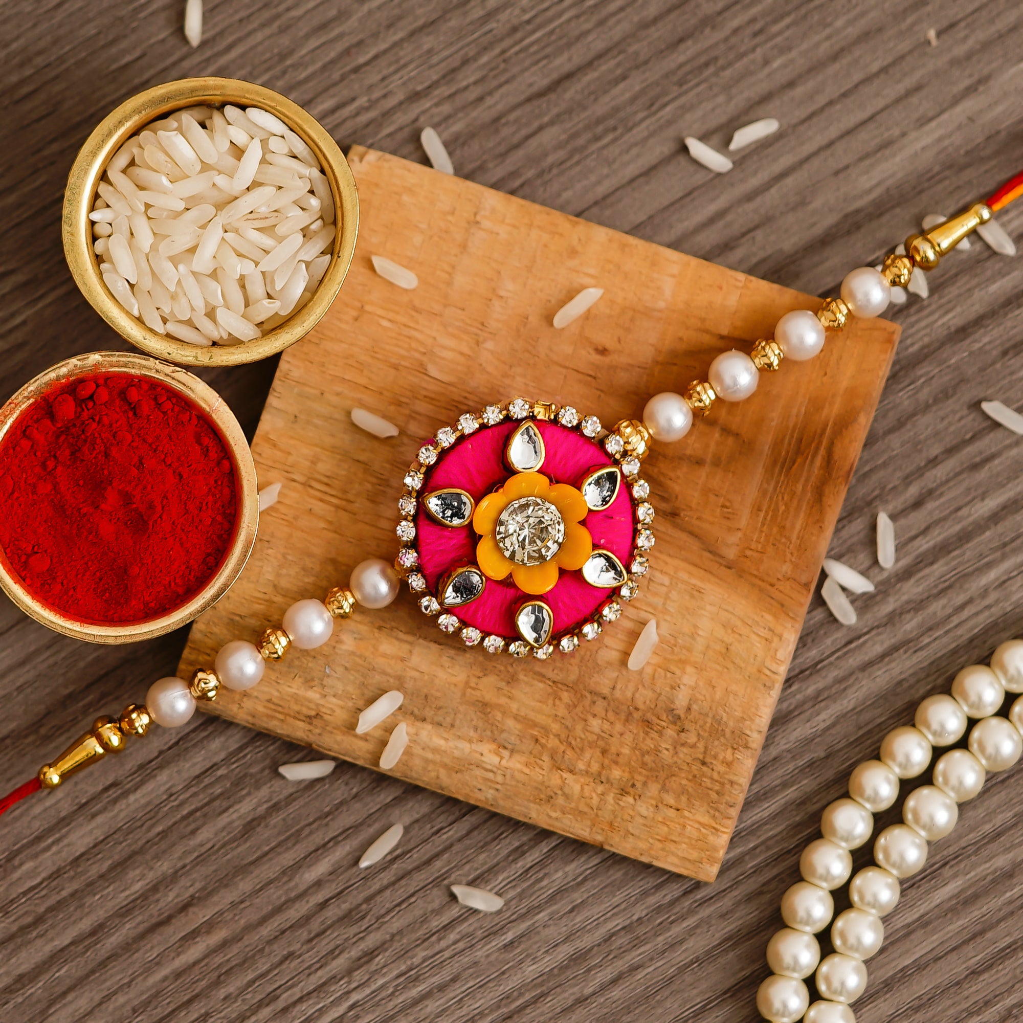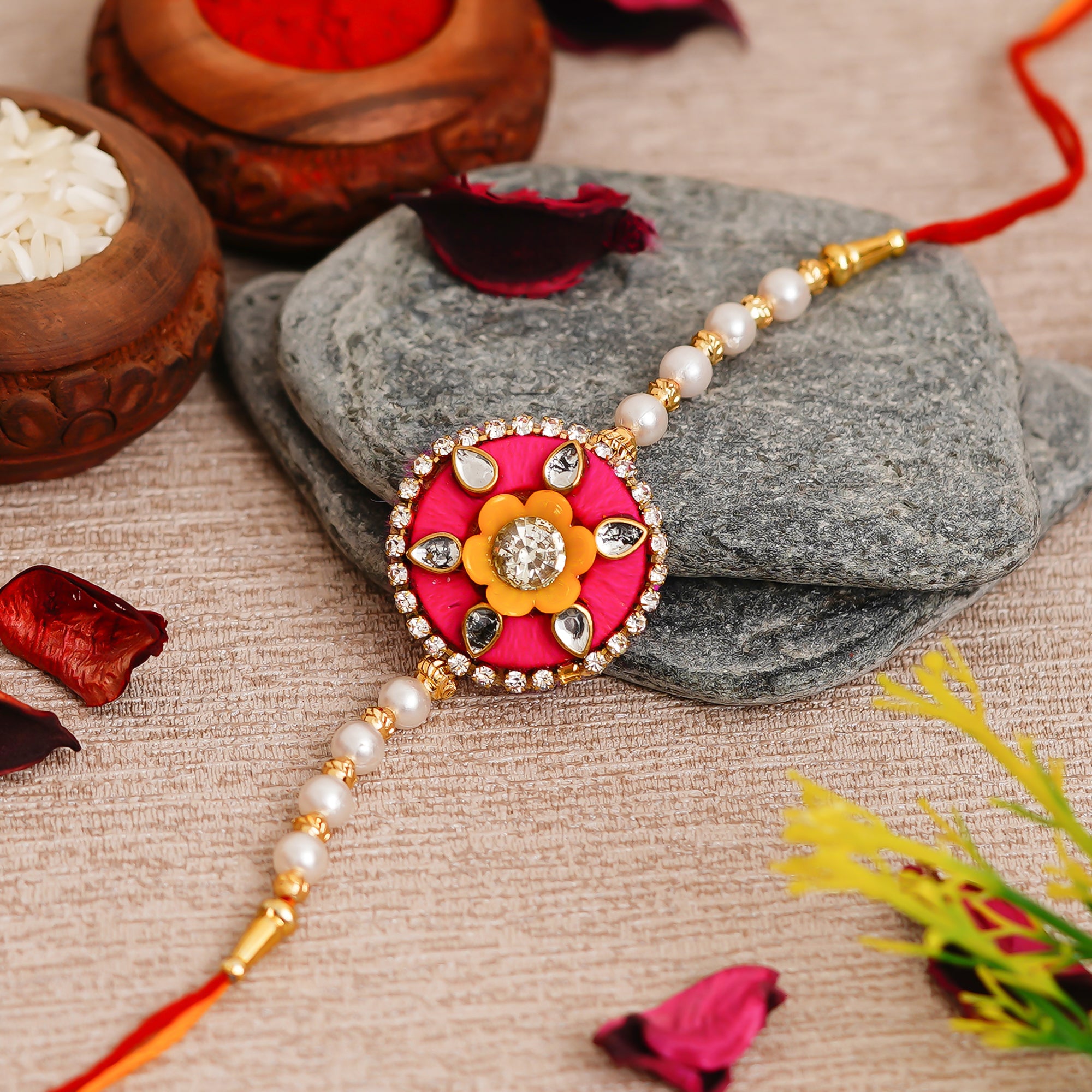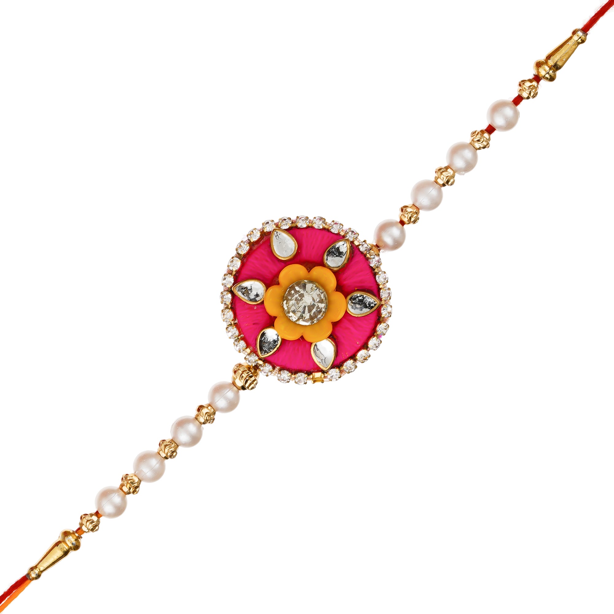 Pink & Orange Designer Floral Rakhi and Roli Chawal Pack - eCraftIndia Online