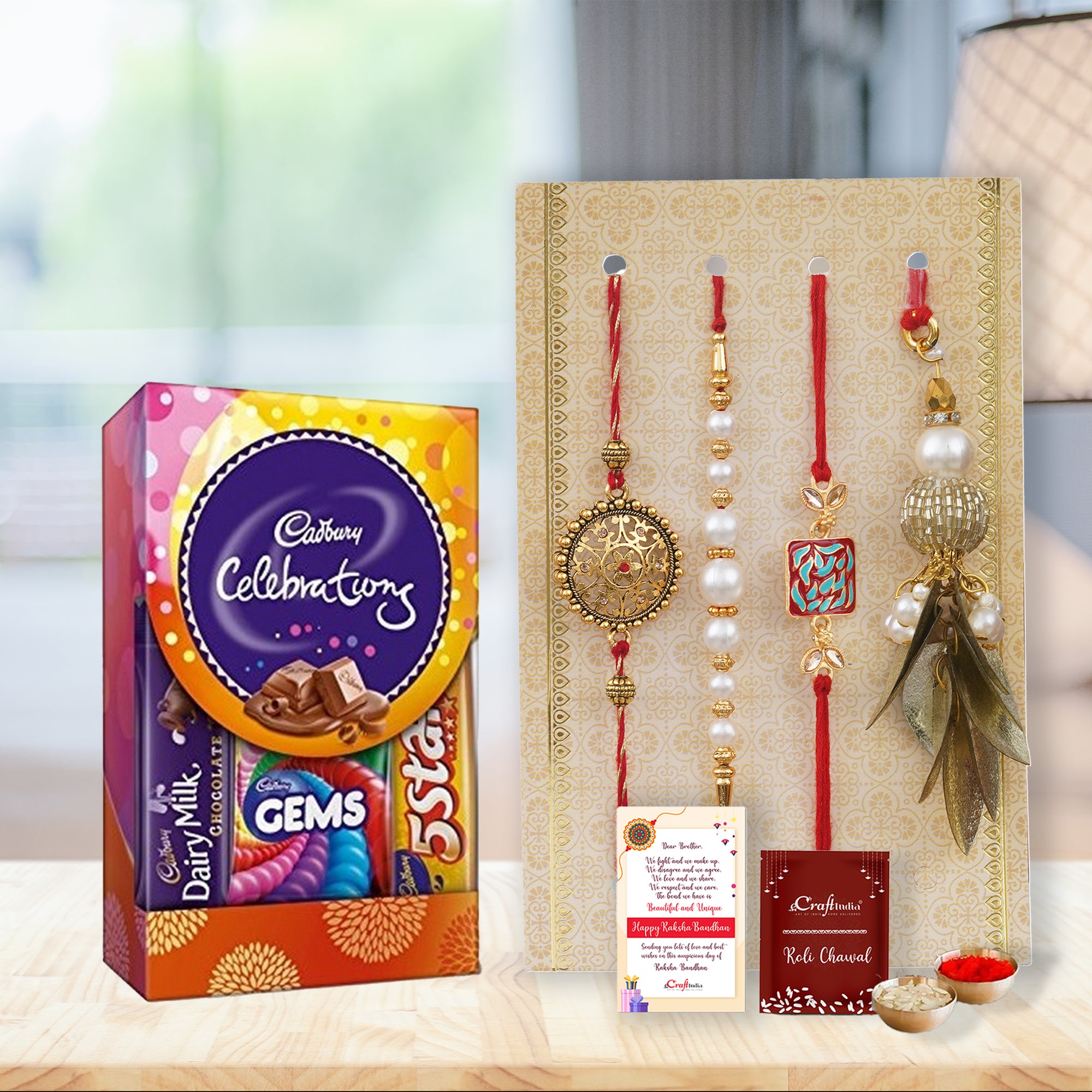 Package Content - Set of 4 Designer Rakhis, 1 Roli Chawal Pack, Raksha Bandhan Greeting Card, 1 Cadbury Celebrations Gift Pack of 5 Assorted Chocolates