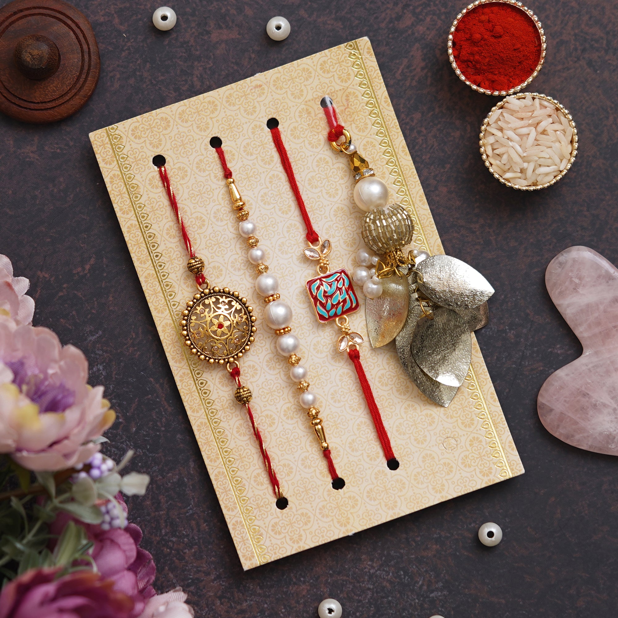 Product Description - Celebrate the special bond of Raksha Bandhan with the eCraftIndia Set of 4 Floral, Pearls, Diamonds, Lumba Designer Rakhis. This exquisite Rakhi set is not only meant for your beloved brother but also includes a Lumba Rakhi for your sister-in-law. The Rakhis feature intricate floral, pearls, and designs, symbolizing elegance and beauty. The set also includes a thoughtful gift hamper, a pack of Roli Chawal for the traditional ceremony, and a heartfelt Raksha Bandhan Greeting Card. Express your love and strengthen the sibling bond with this comprehensive Rakhi set, perfect for both your brother and sister-in-law.