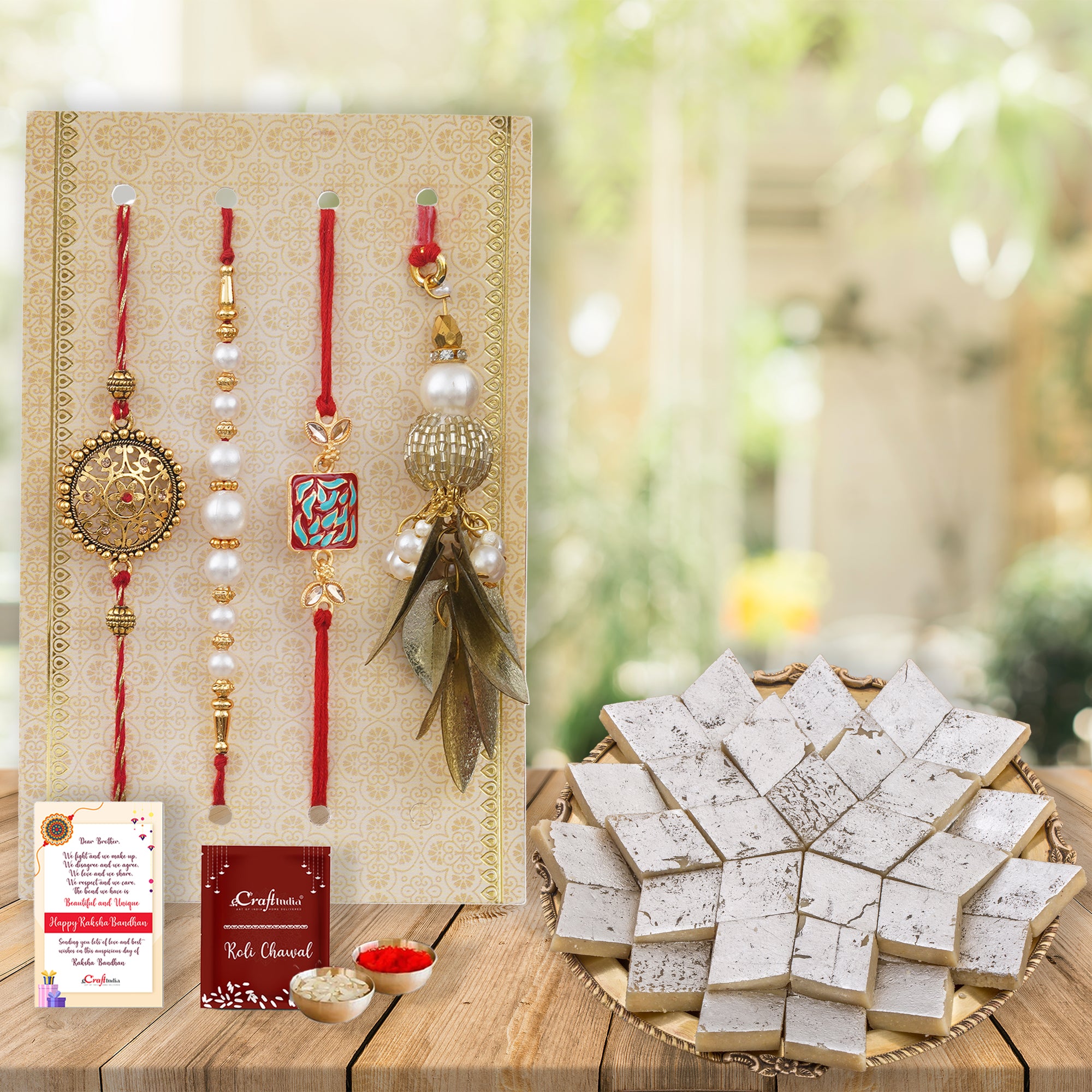Package Content - Set of 4 Designer Rakhis, 1 Roli Chawal Pack, Raksha Bandhan Greeting Card, 1 Kaju Katli (500 Gm)
