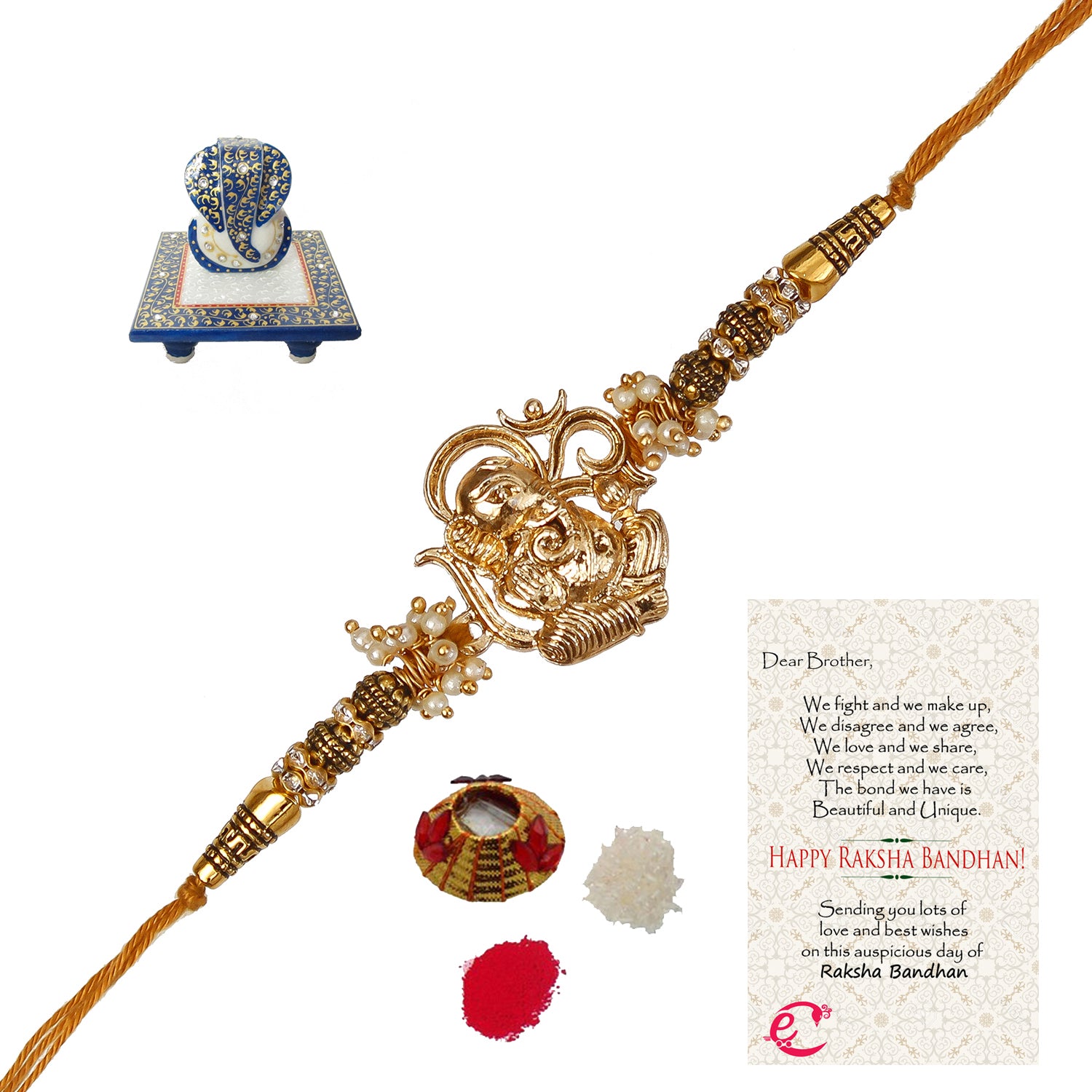 Designer Ganesha Rakhi with Lord Ganesha Marble Chowki and Roli Tikka Matki, Best Wishes Greeting Card - eCraftIndia Online