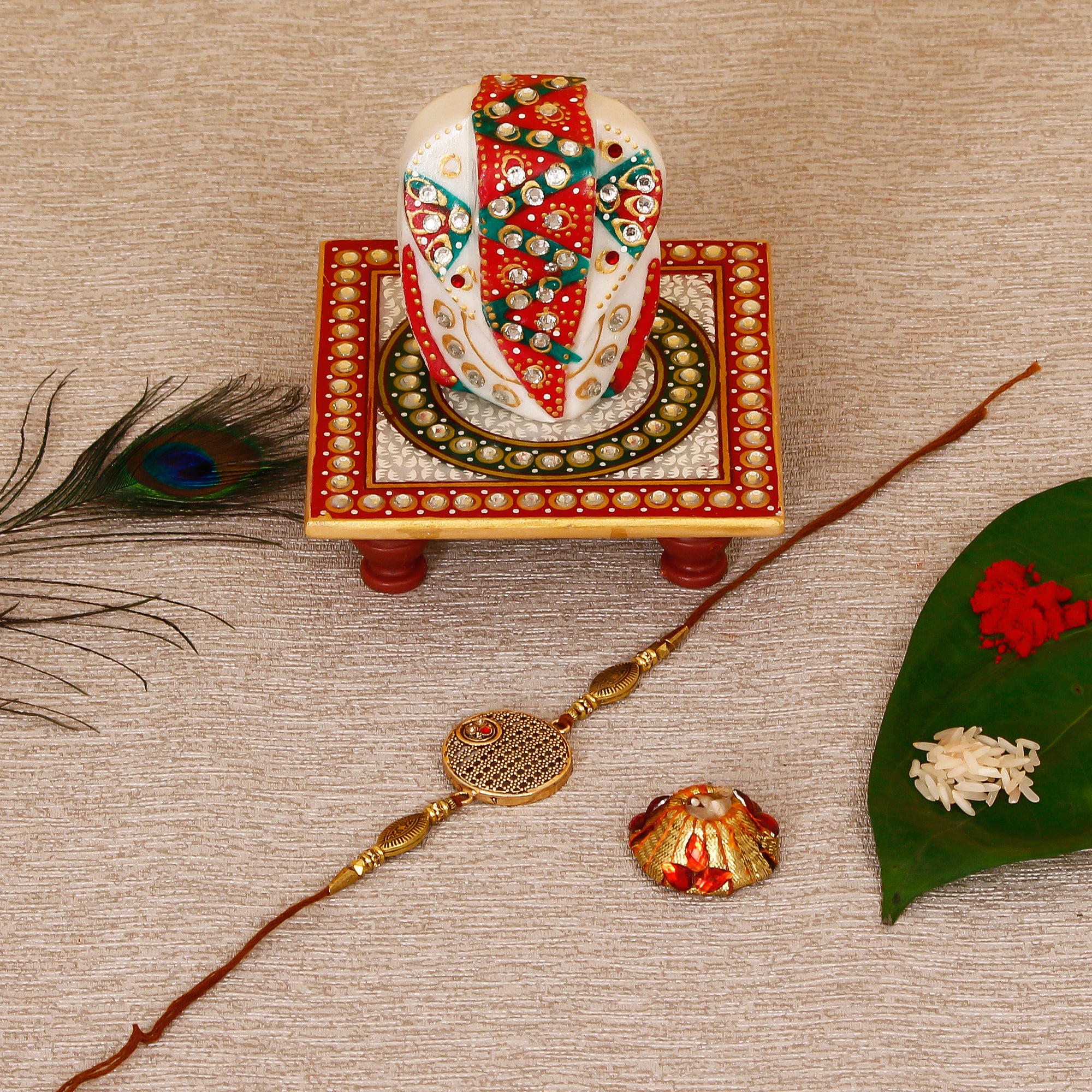 Designer Rakhi with Lord Ganesha on Kundan Studded Marble Chowki and Roli Tikka Matki - eCraftIndia Online