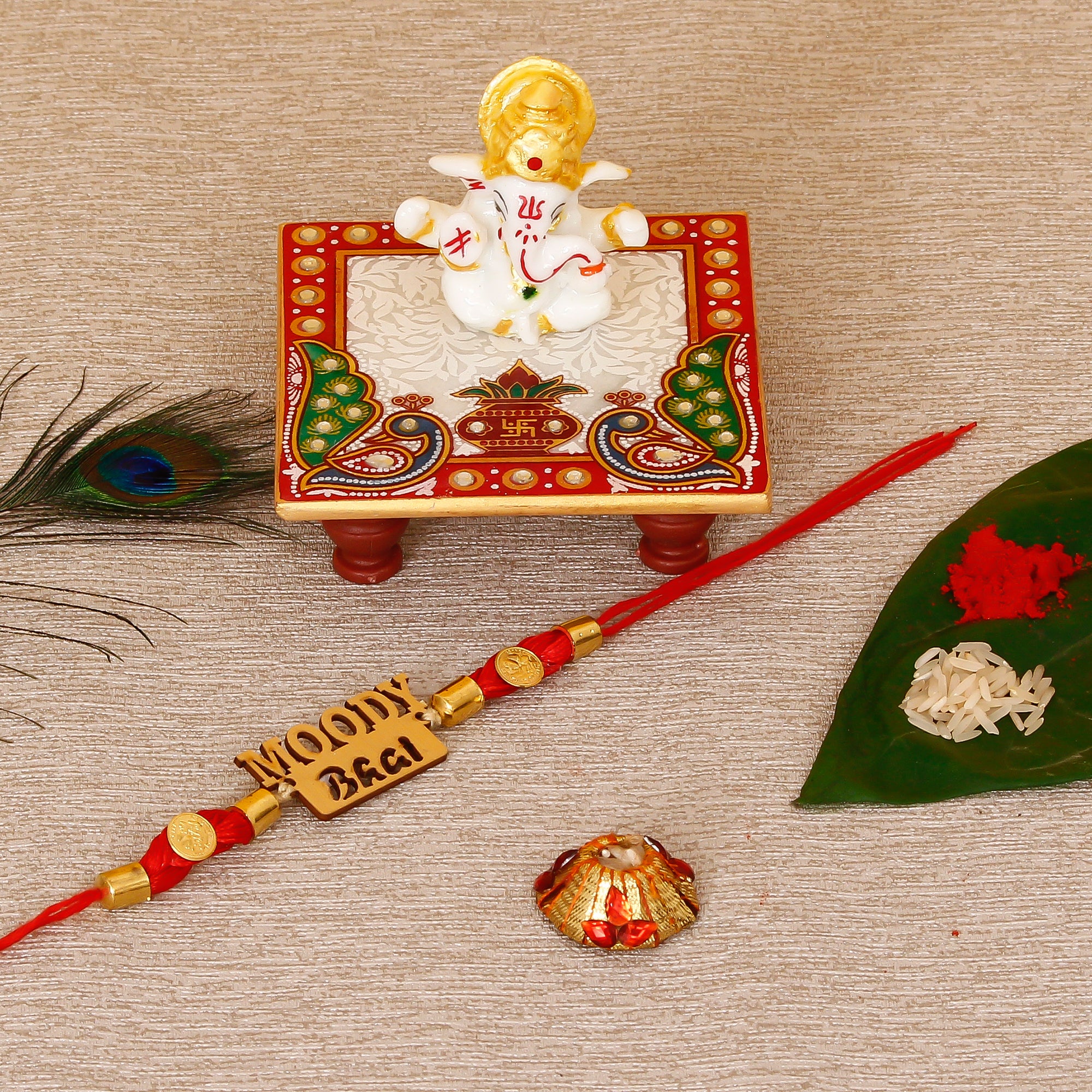 Designer Wooden Moddy Bhai Rakhi with Lord Ganesha Marble Chowki and Roli Tikka Matki - eCraftIndia Online