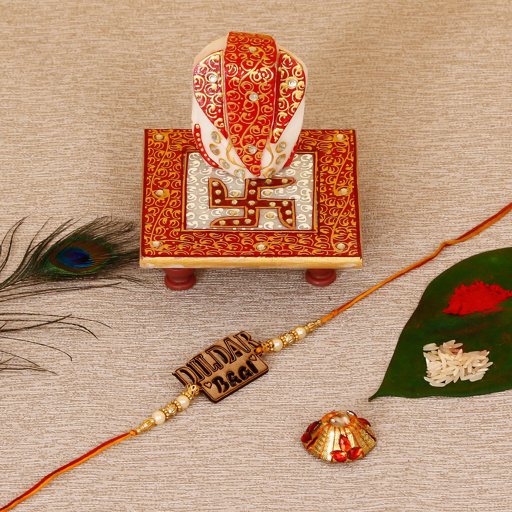 Designer Wooden Dildar Bhai Rakhi with Ridhi Sidhi Marble chowki and Roli Tikka Matki - eCraftIndia Online