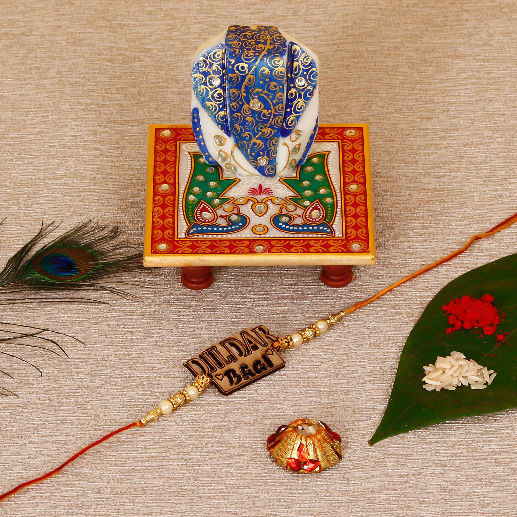 Designer Wooden Dildar Bhai Rakhi with Lord Ganesha on Marble Chowki and Roli Tikka Matki