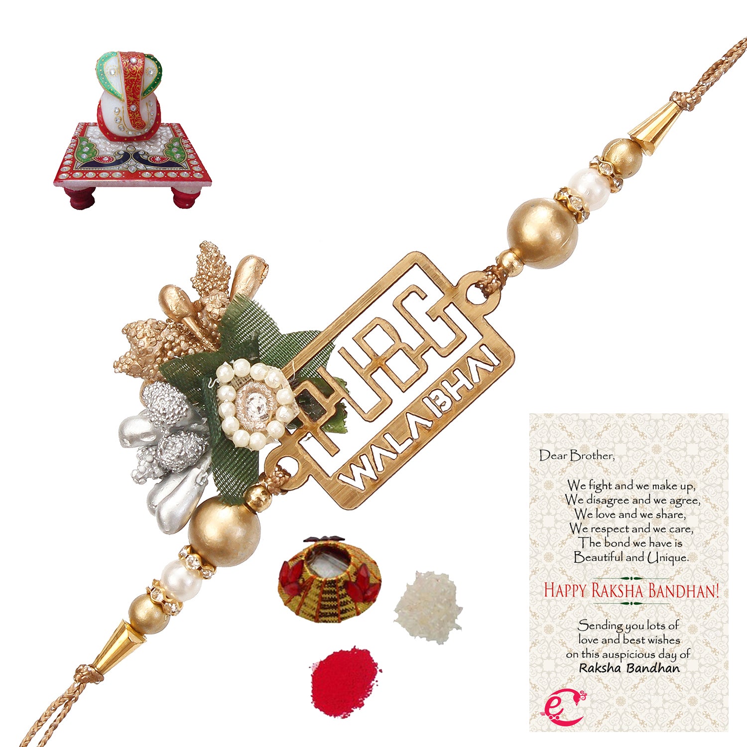 Designer Pubg Wala Bhai Rakhi with Lord Ganesha Marble Chowki and Roli Tikka Matki, Best Wishes Greeting Card - eCraftIndia Online