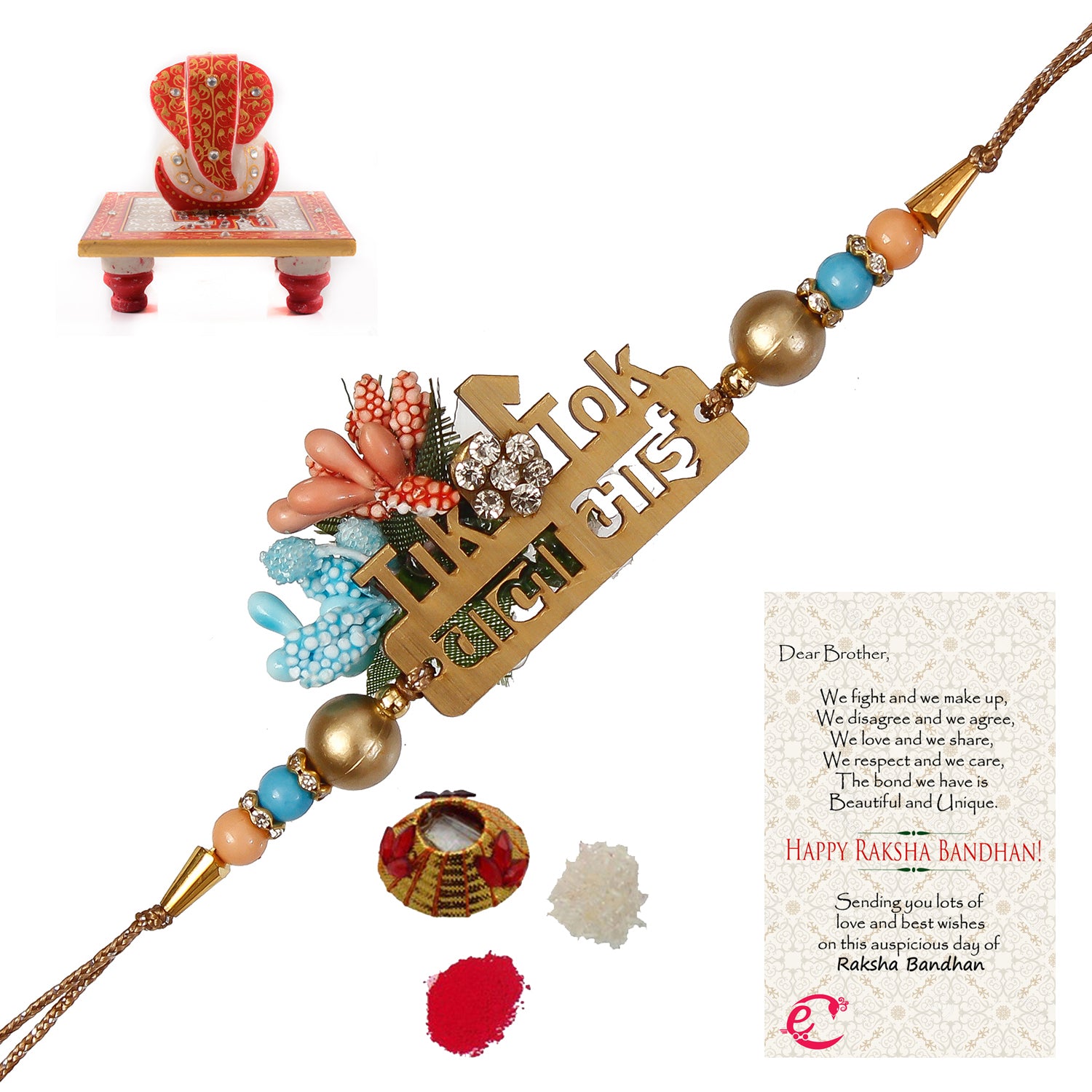 Designer Wooden Tiktok wala Bhai Rakhi with Ridhi Sidhi Marble chowki and Roli Tikka Matki, Best Wishes Greeting Card - eCraftIndia Online