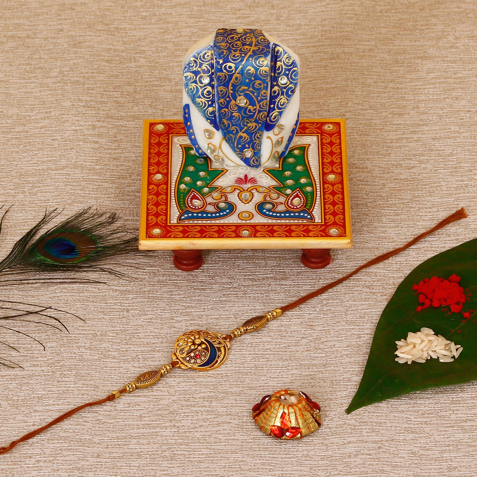 Designer Peacock Rakhi with Lord Ganesha on Marble Chowki and Roli Tikka Matki - eCraftIndia Online