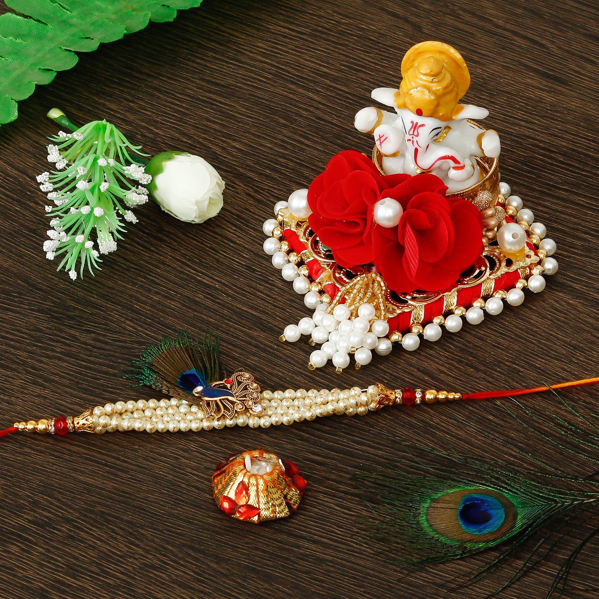 Designer Pearl Morpankh Rakhi with Lord Ganesha Idol on Decorative Plate for Car & Home and Roli Tikka Matki - eCraftIndia Online