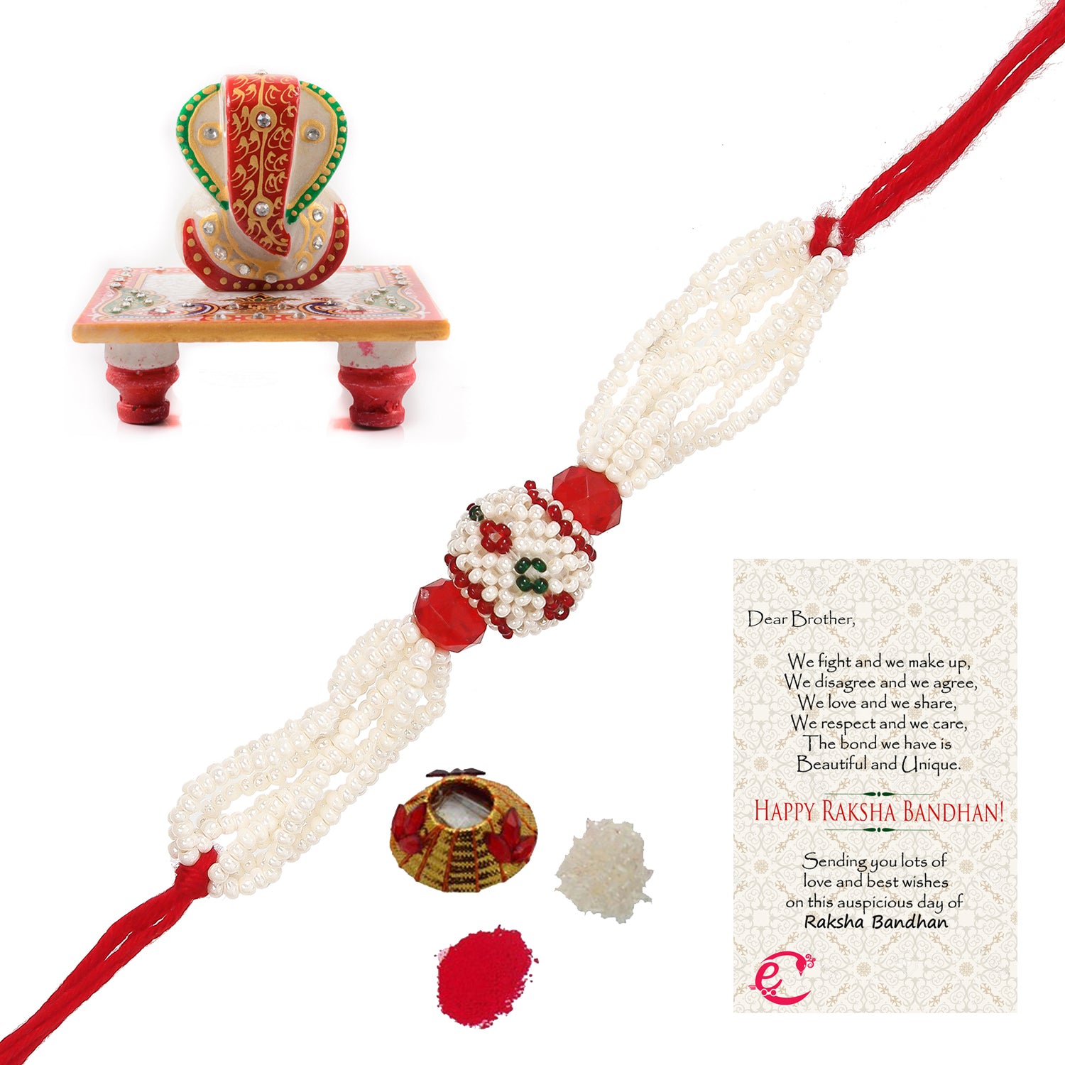 Designer Pearl Rakhi with Lord Ganesha Marble Chowki and Roli Tikka Matki, Best Wishes Greeting Card - eCraftIndia Online