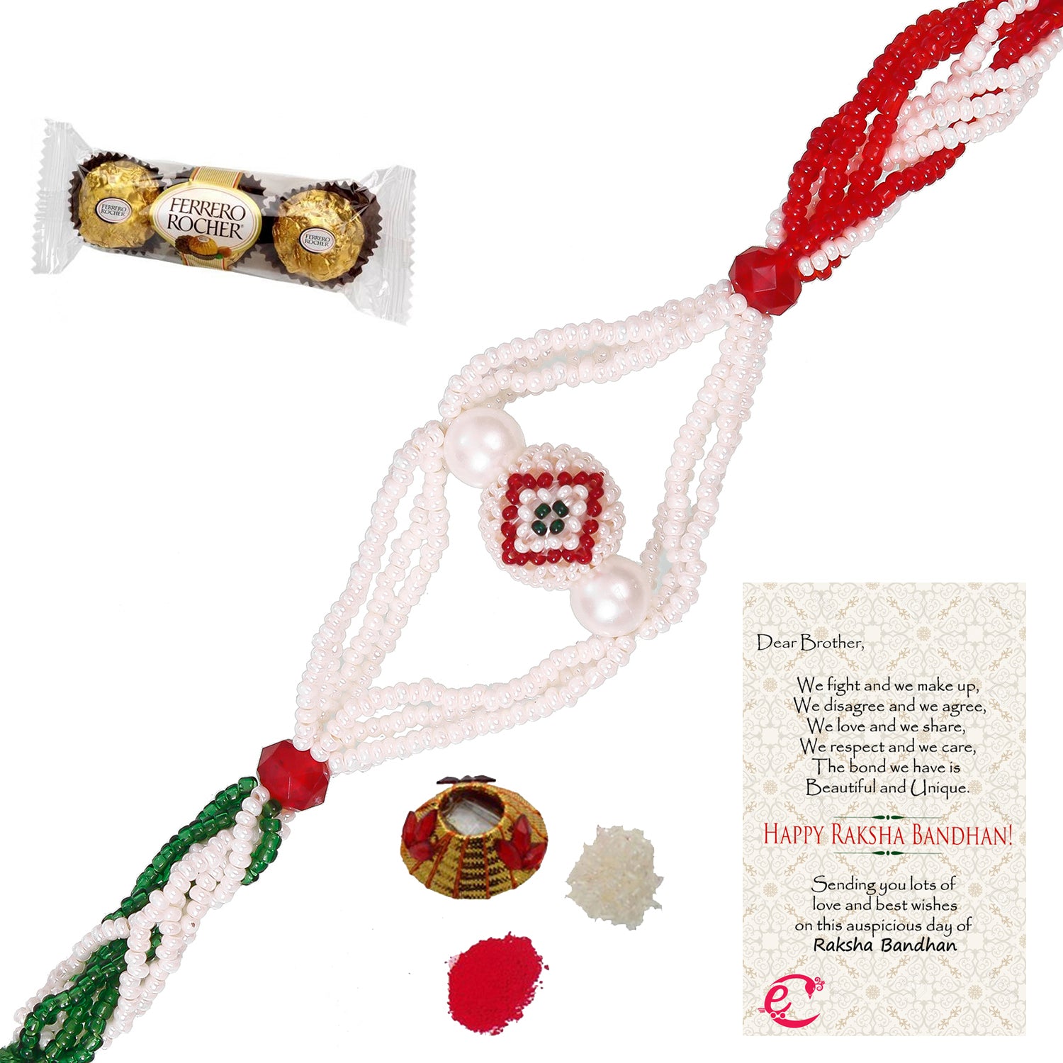 Designer Pearl Rakhi with Ferrero Rocher (3 pcs) and Roli Tikka Matki, Best Wishes Greeting Card - eCraftIndia Online