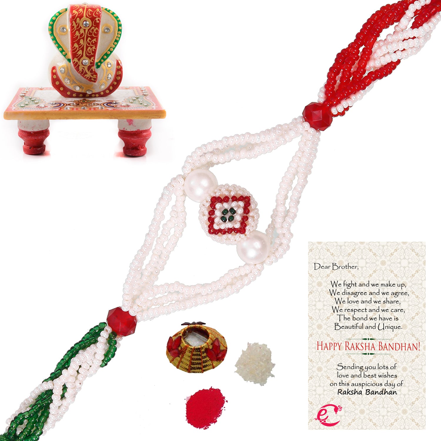 Designer Pearl Rakhi with Lord Ganesha Marble Chowki and Roli Tikka Matki, Best Wishes Greeting Card - eCraftIndia Online