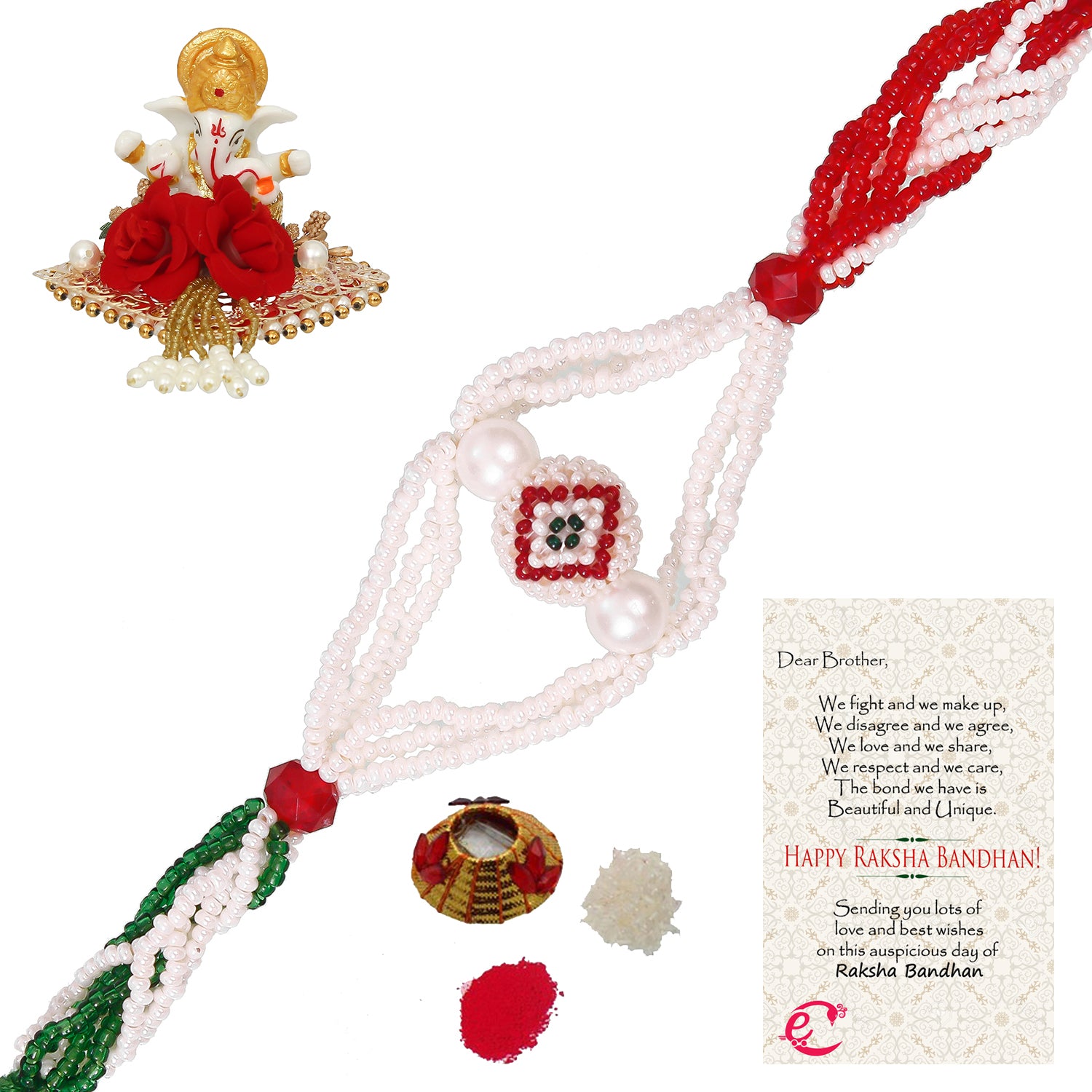 Designer Pearl Rakhi with Lord Ganesha Idol on Decorative Plate for Car & Home and Roli Tikka Matki, Best Wishes Greeting Card - eCraftIndia Online