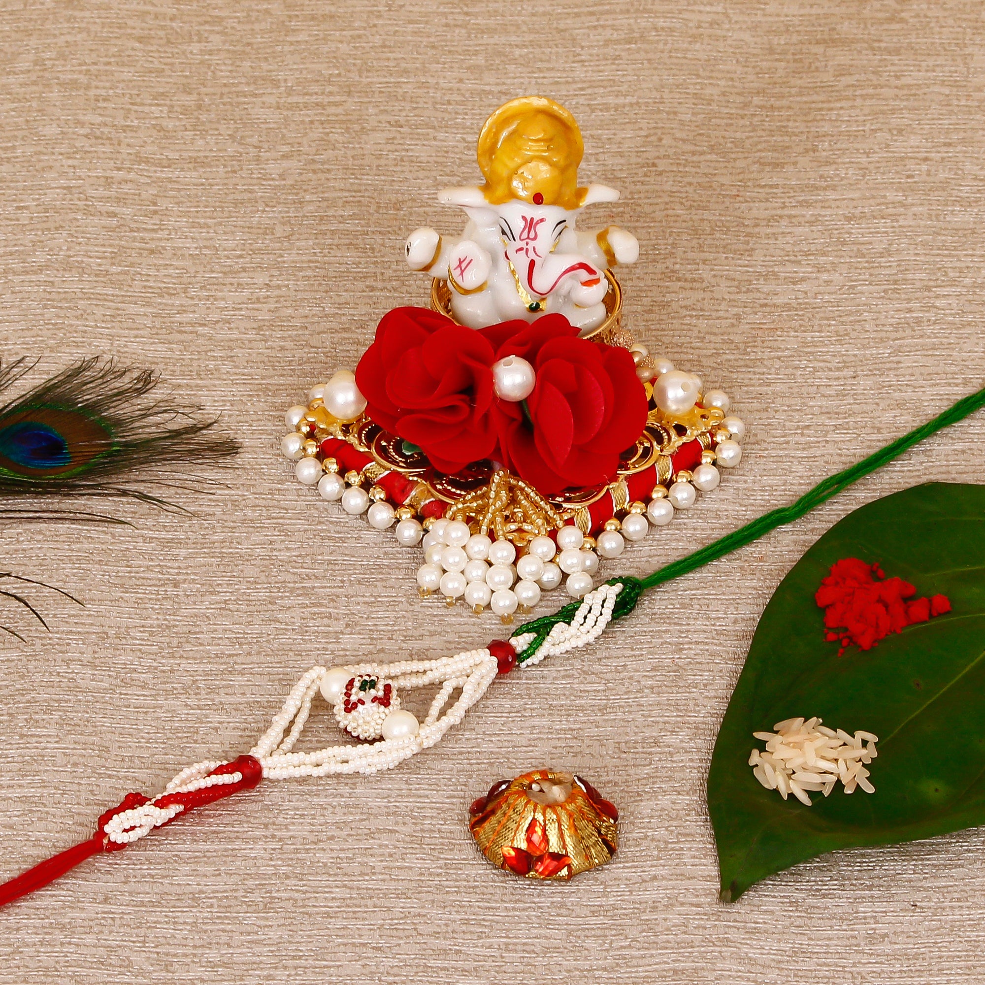 Designer Pearl Rakhi with Lord Ganesha Idol on Decorative Plate for Car & Home and Roli Tikka Matki - eCraftIndia Online
