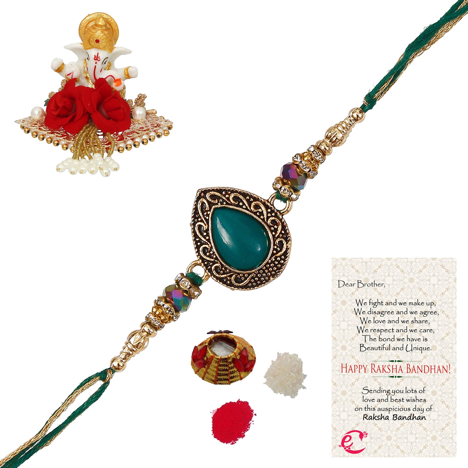 Designer Stone Rakhi with Lord Ganesha Idol on Decorative Plate for Car & Home and Roli Tikka Matki, Best Wishes Greeting Card - eCraftIndia Online