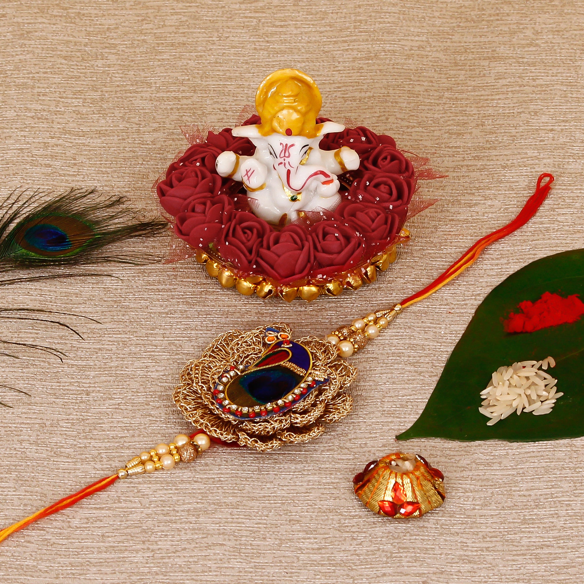 Designer Peacock Rakhi with Lord Ganesha Idol on Decorative Plate for Car & Home and Roli Tikka Matki - eCraftIndia Online