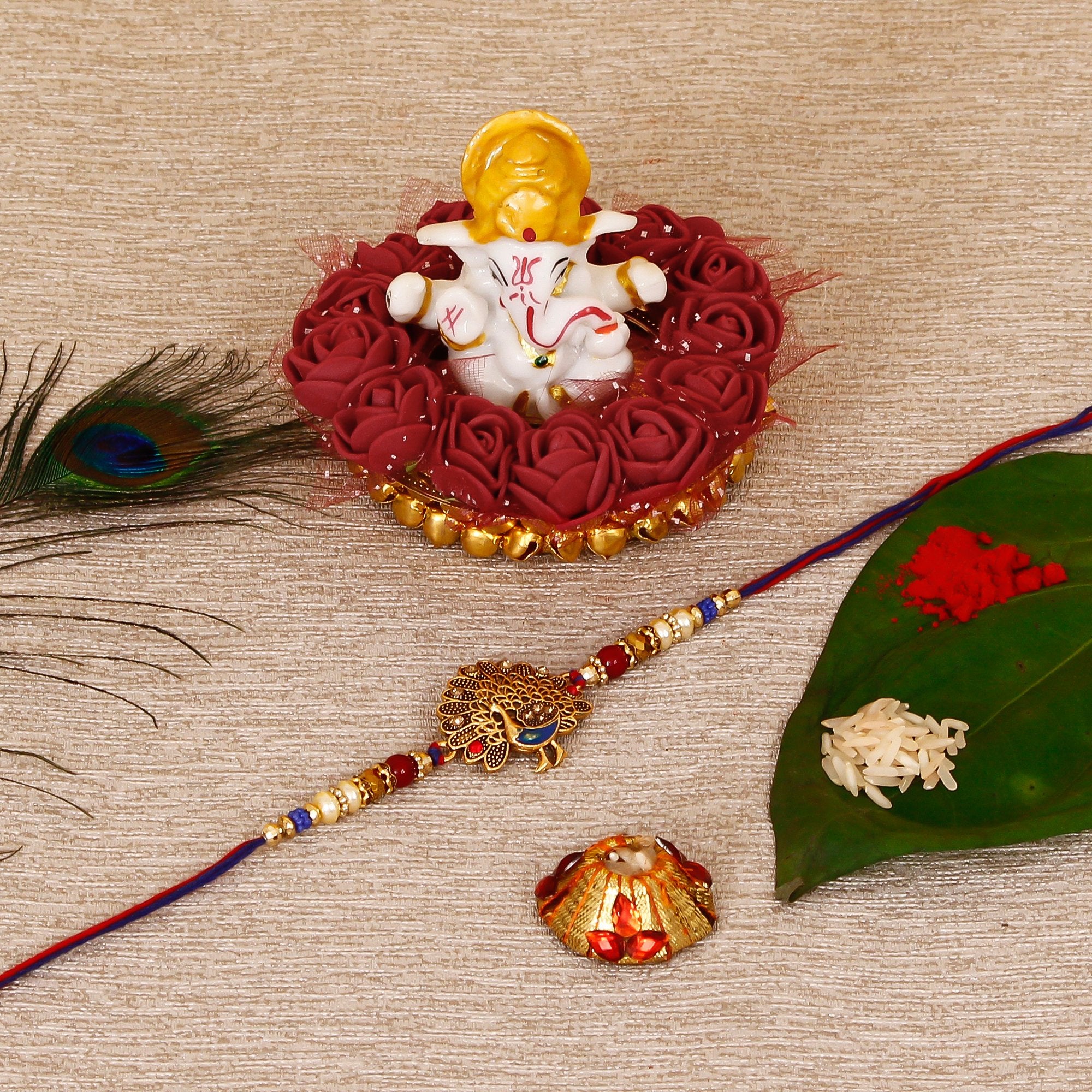 Designer Dancing Peacock Rakhi with Lord Ganesha Idol on Decorative Plate for Car & Home and Roli Tikka Matki - eCraftIndia Online