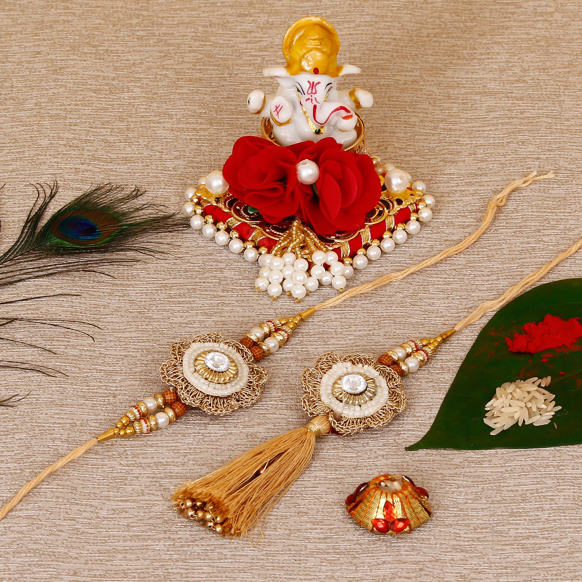 Designer Bhaiya Bhabhi Rakhi with Lord Ganesha Idol on Decorative Plate for Car & Home and Roli Tikka Matki - eCraftIndia Online