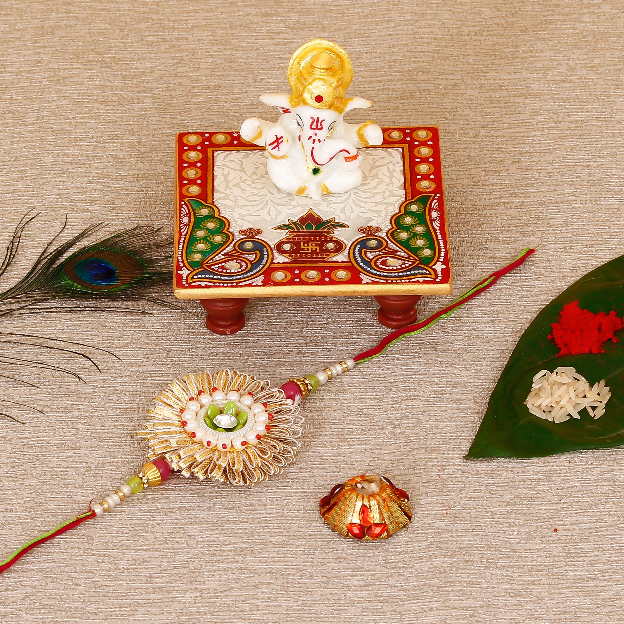 Designer Rakhi with Lord Ganesha Marble Chowki and Roli Tikka Matki