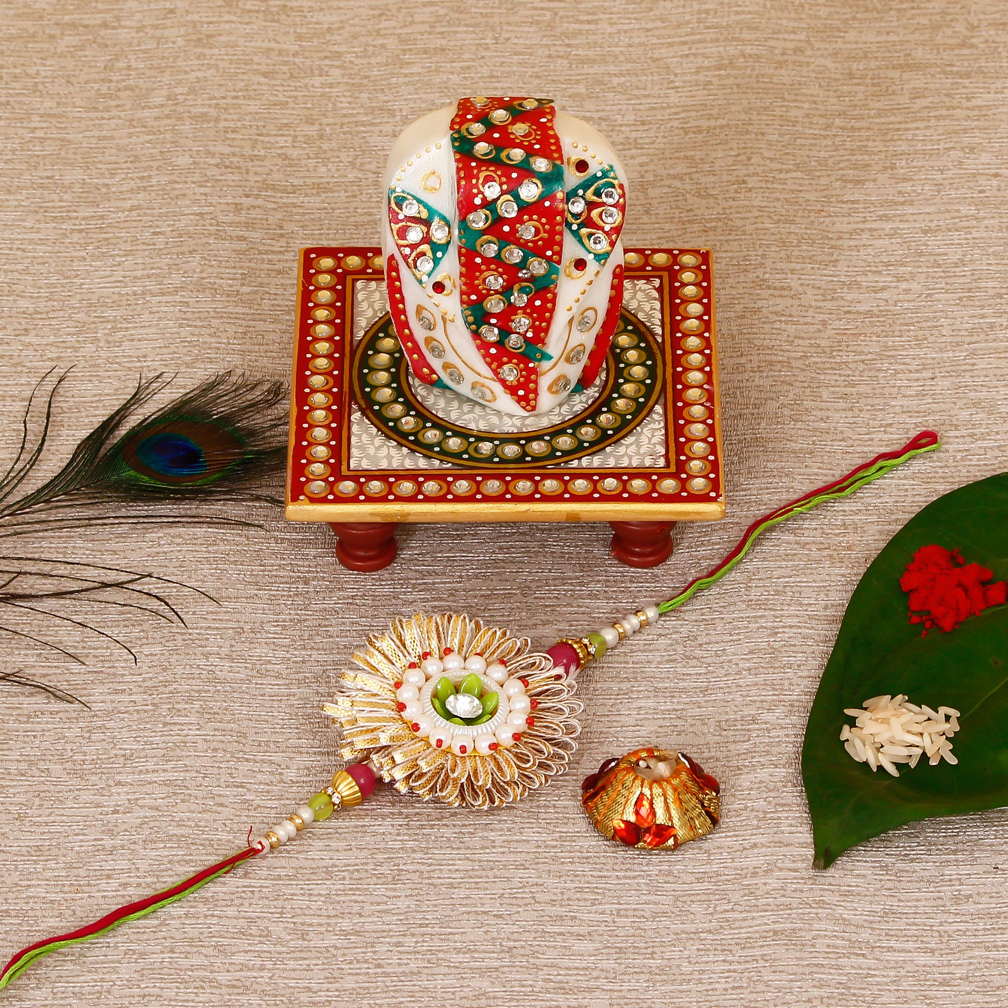 Designer Rakhi with Lord Ganesha on Kundan Studded Marble Chowki and Roli Tikka Matki - eCraftIndia Online